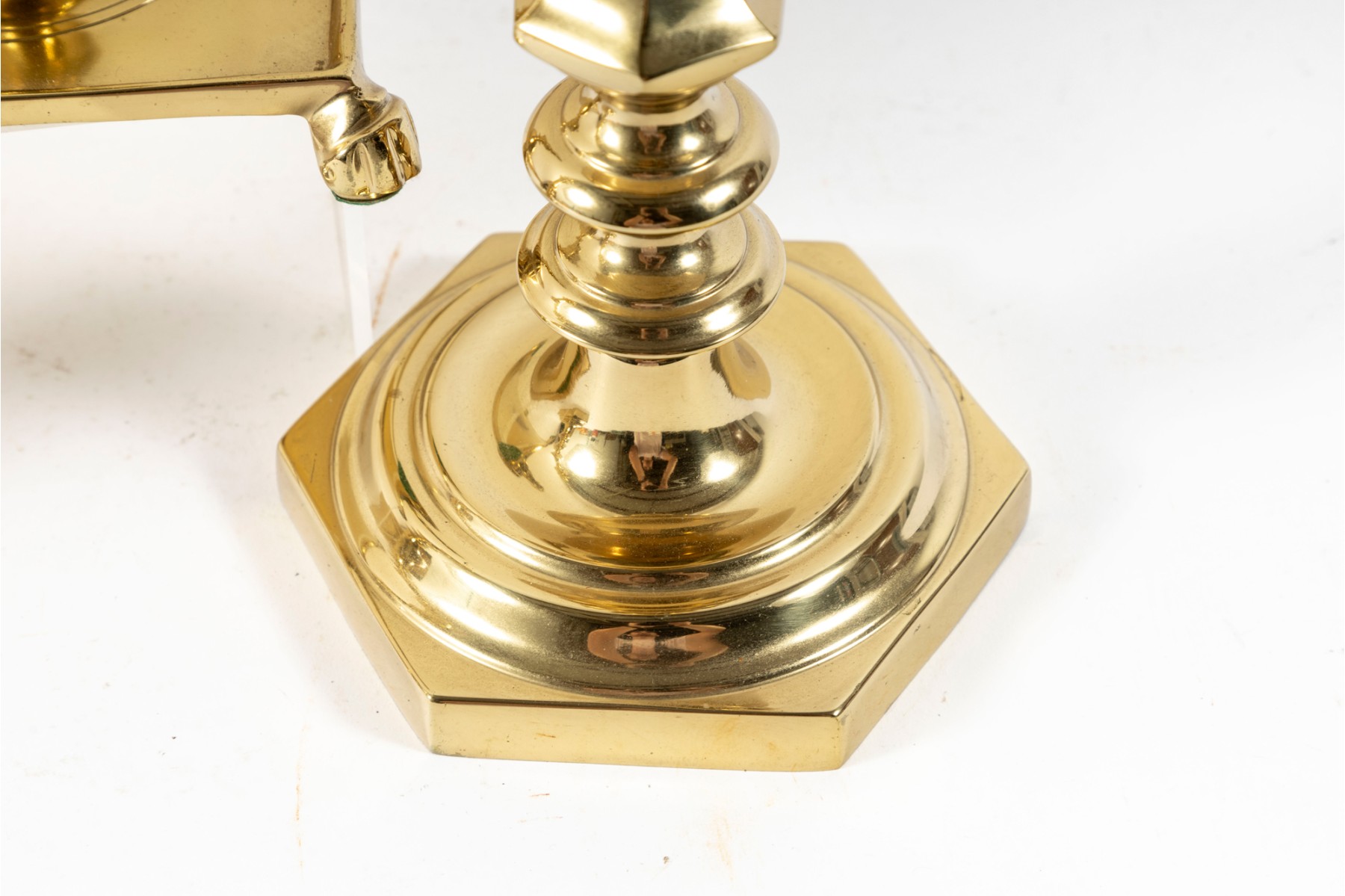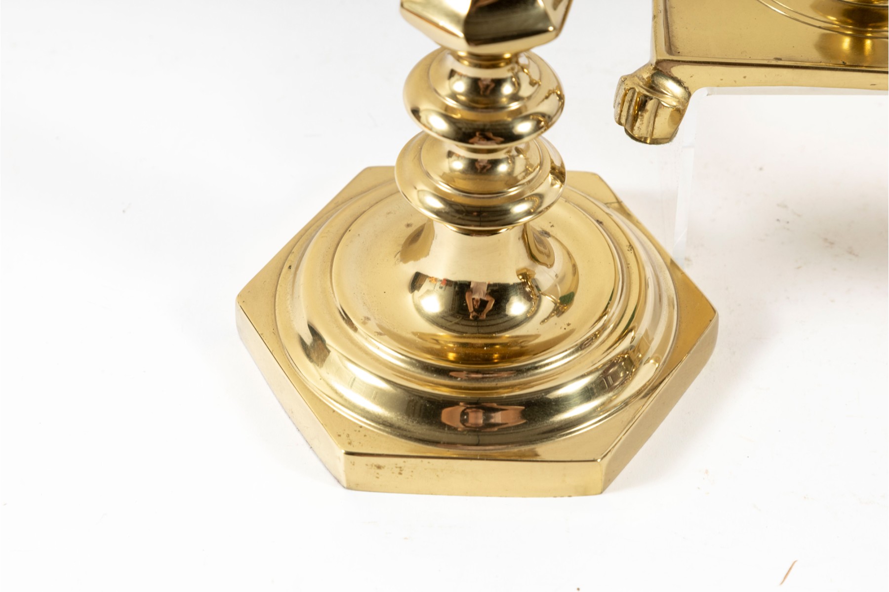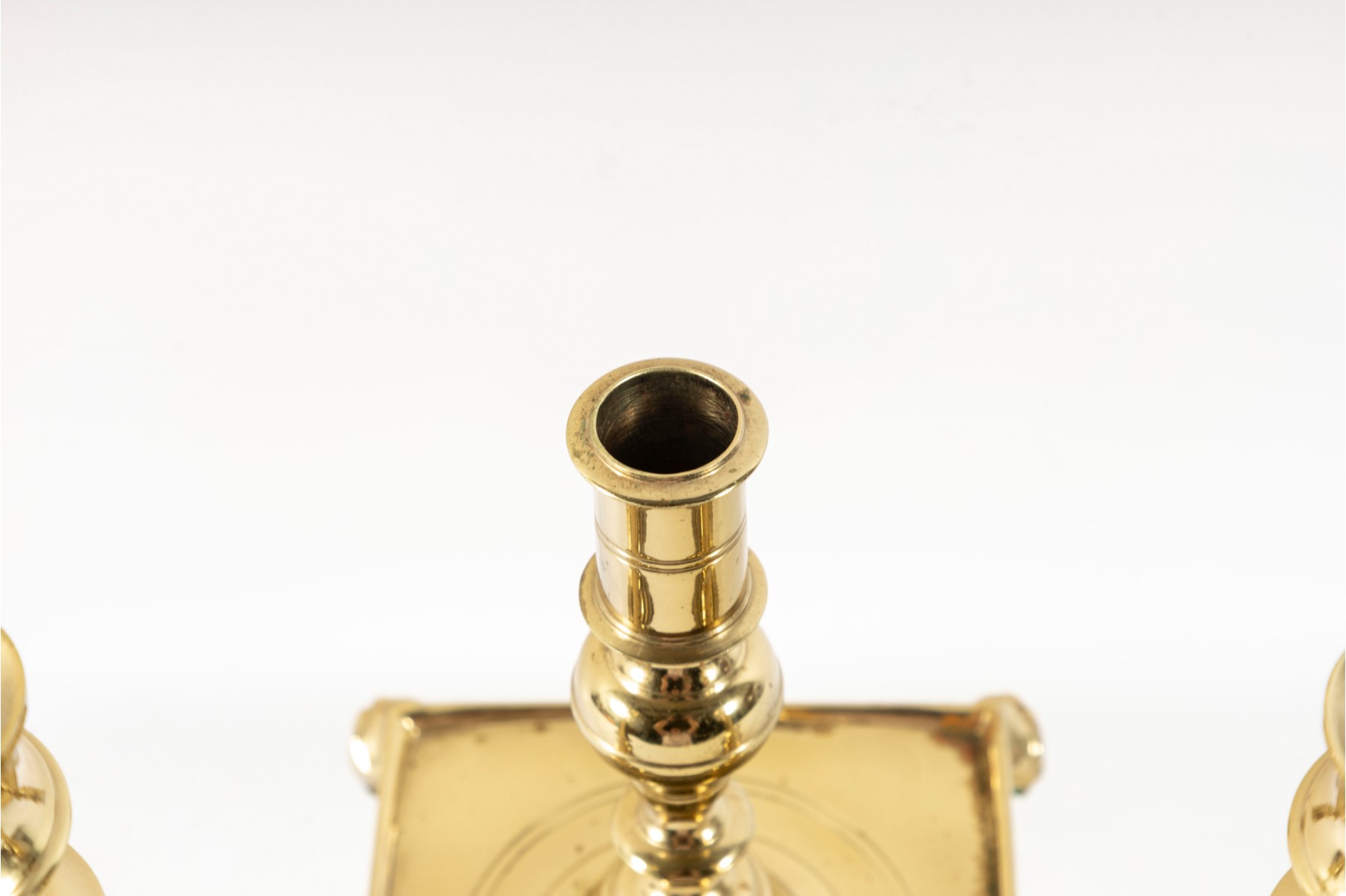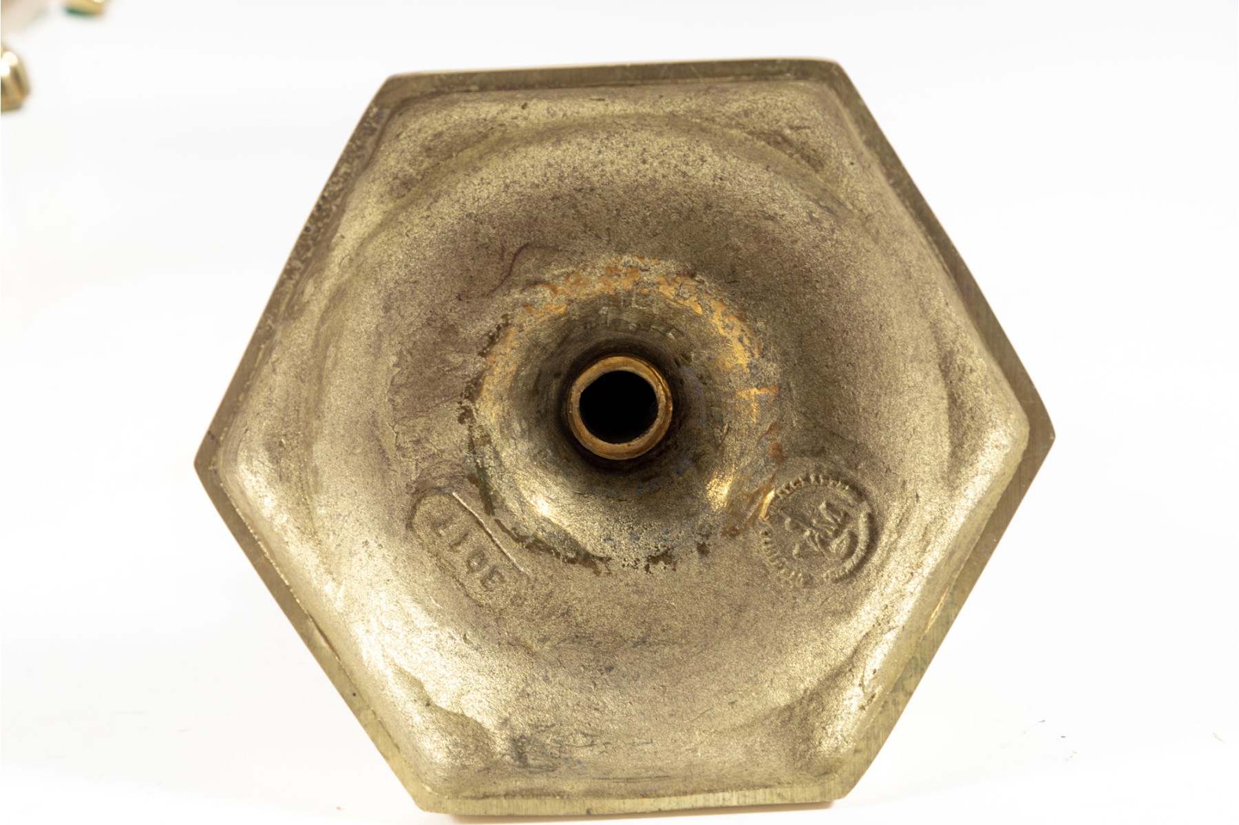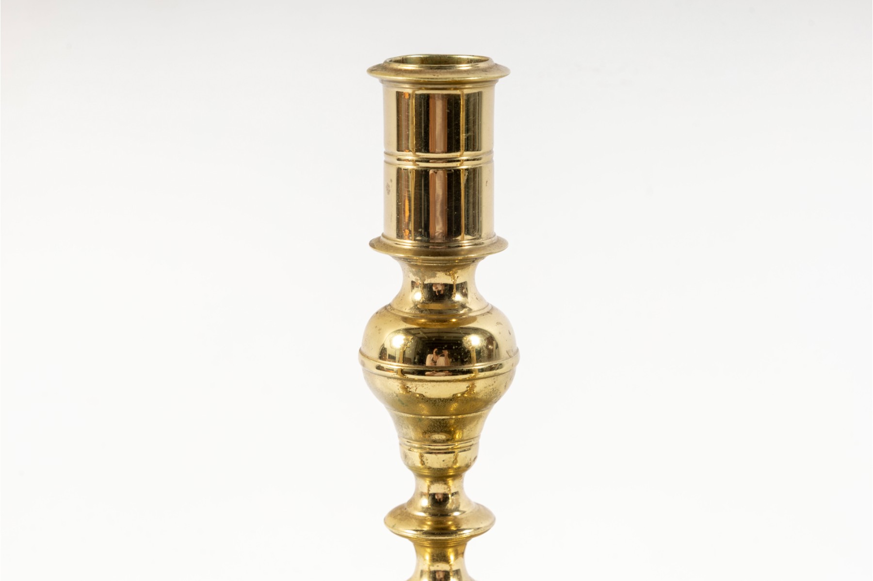 A trio of vintage Virginia Metalcrafters solid brass candlestick holders with column forms, one footed. All items are stamped with the Virginia Metalcrafters insignia.