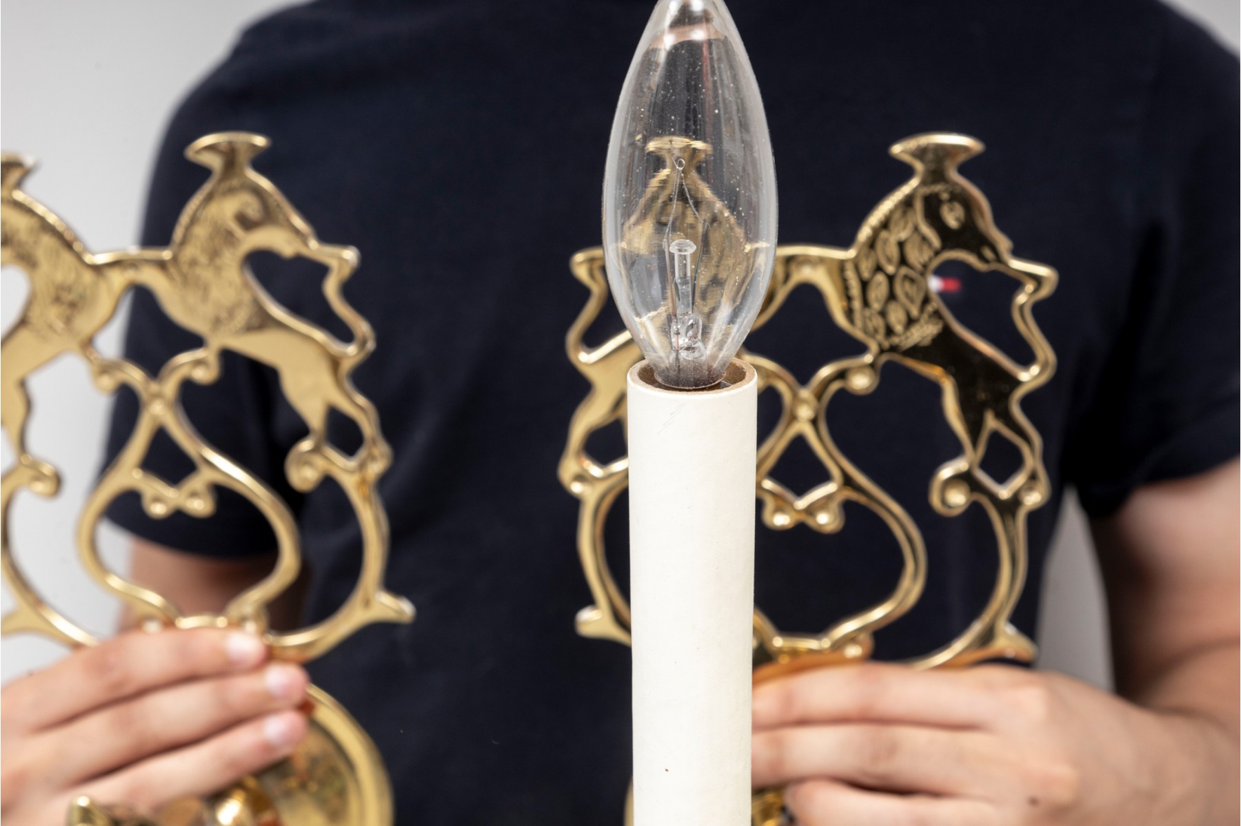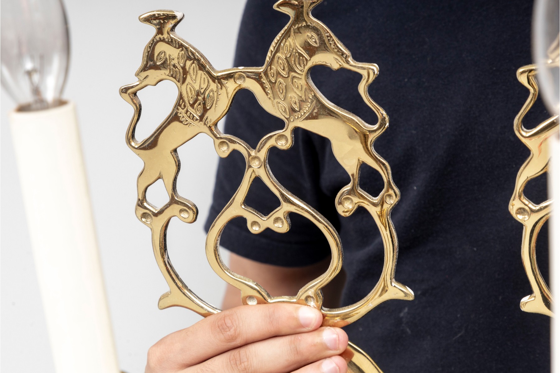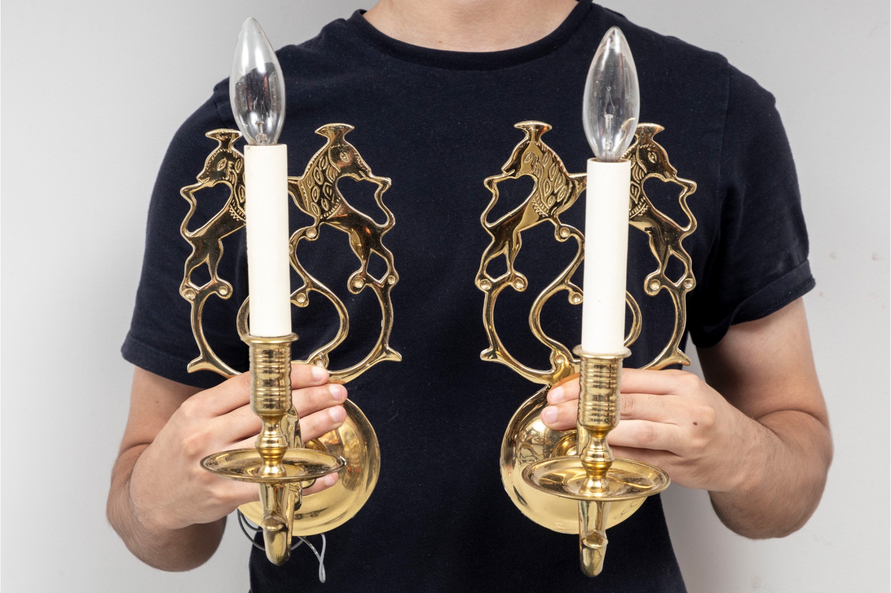 A pair of intricate scrolled & polished brass single-candle wall sconces for your consideration. Vintage, produced by Virigina Metalcrafters.