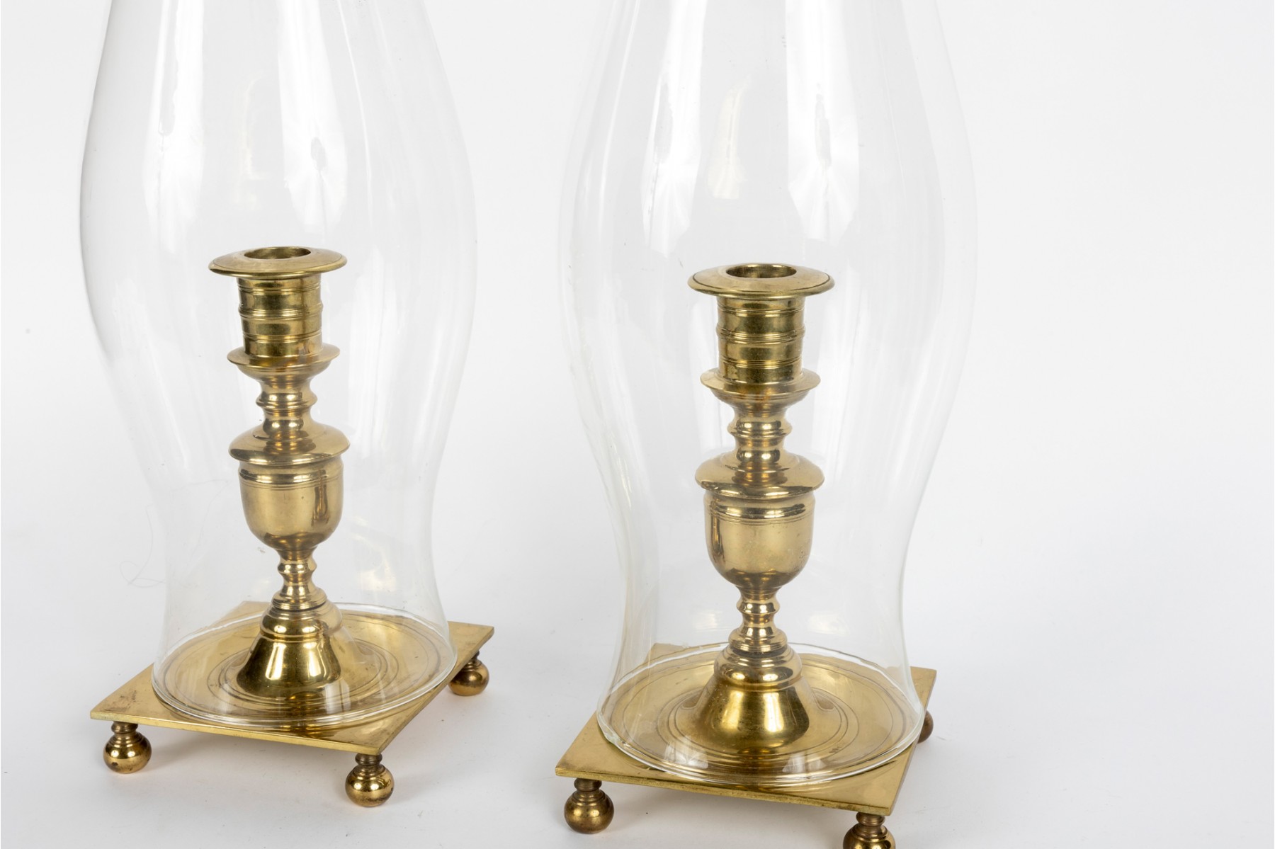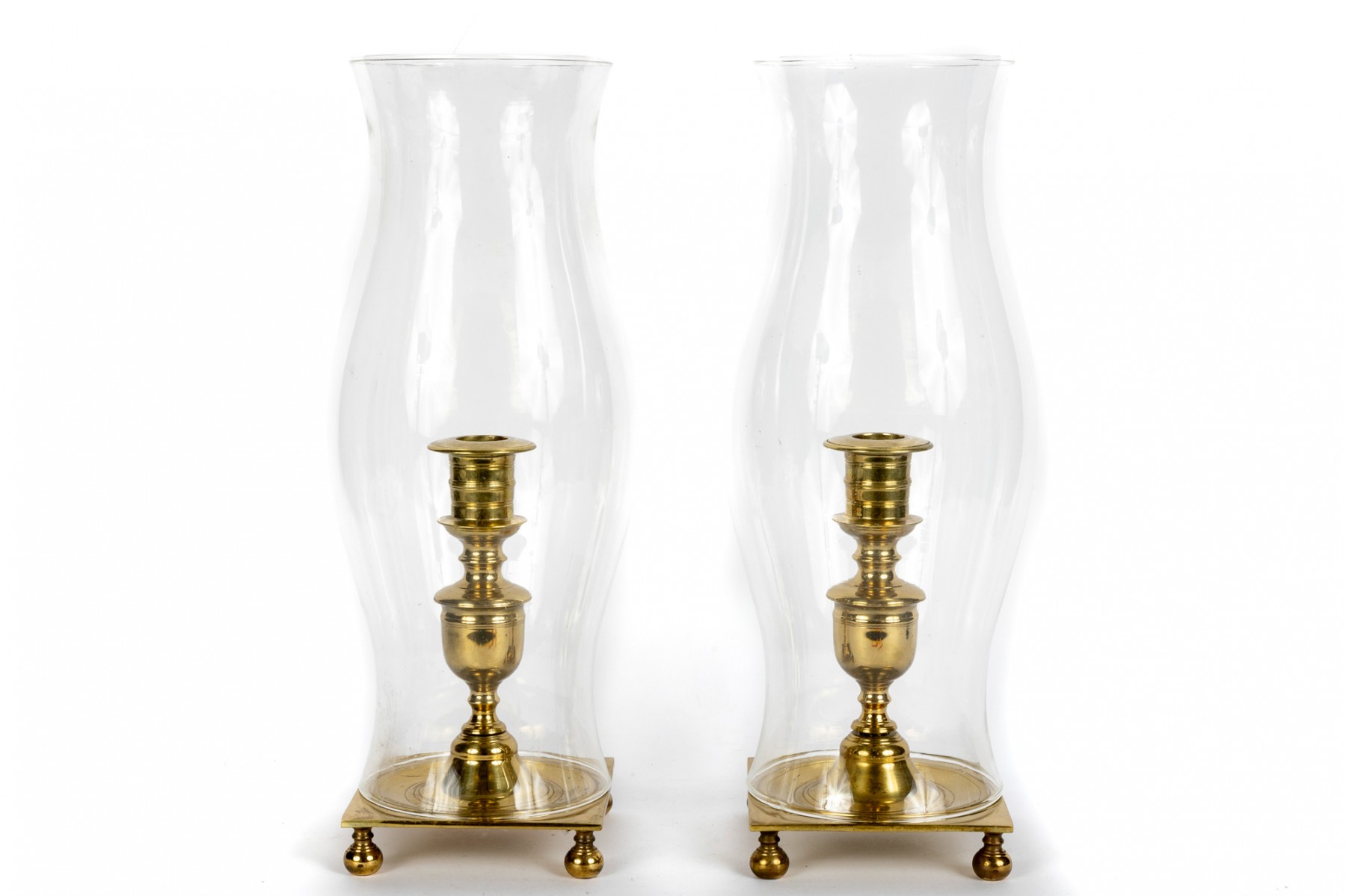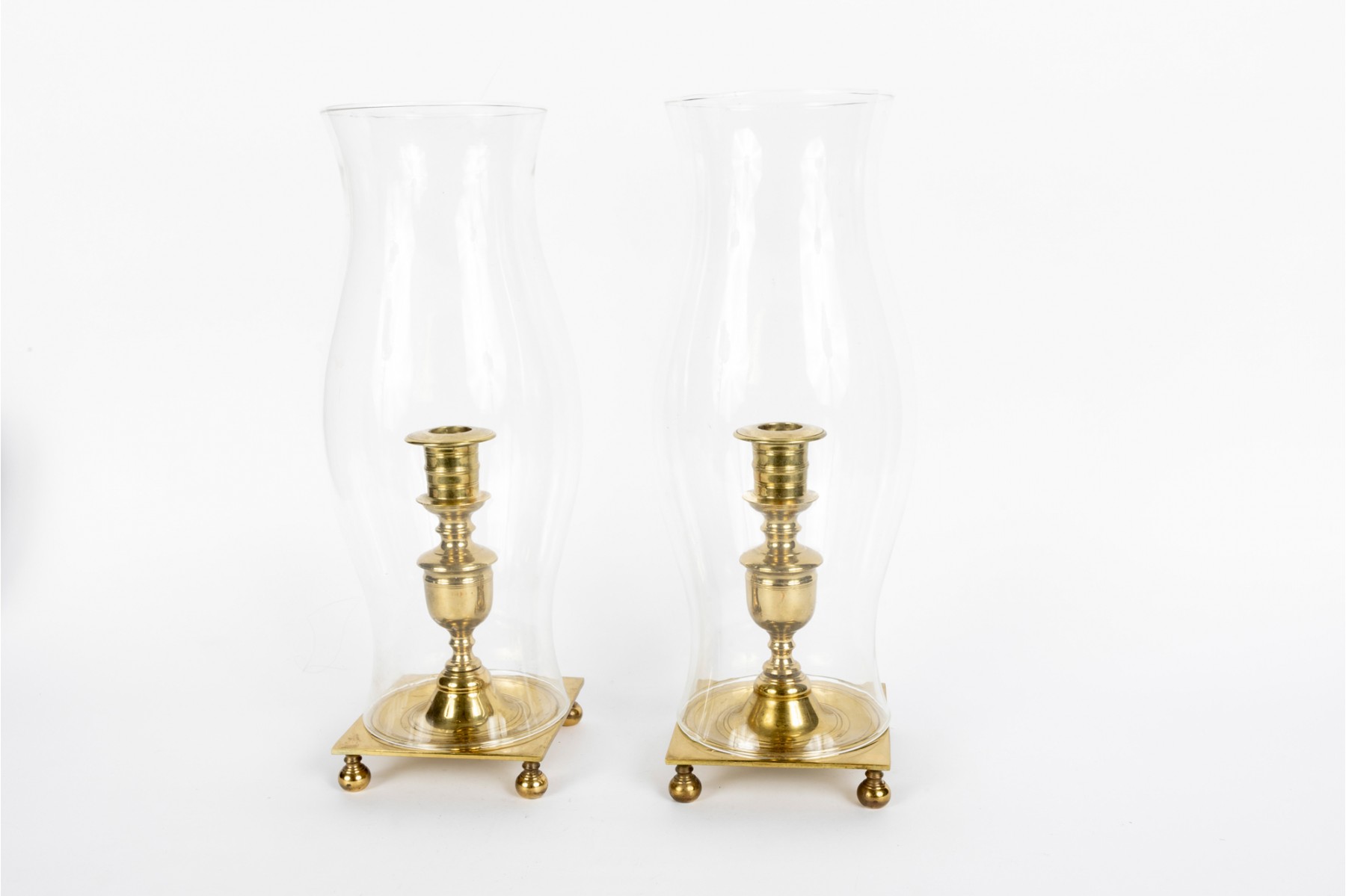 Virginia Metalcrafters Newport pair of large brass hurricane candlesticks with banded and turned columns over square bases raised on bun feet. Topped with elegantly curving glass chimneys. Marked on the underside of the bases.