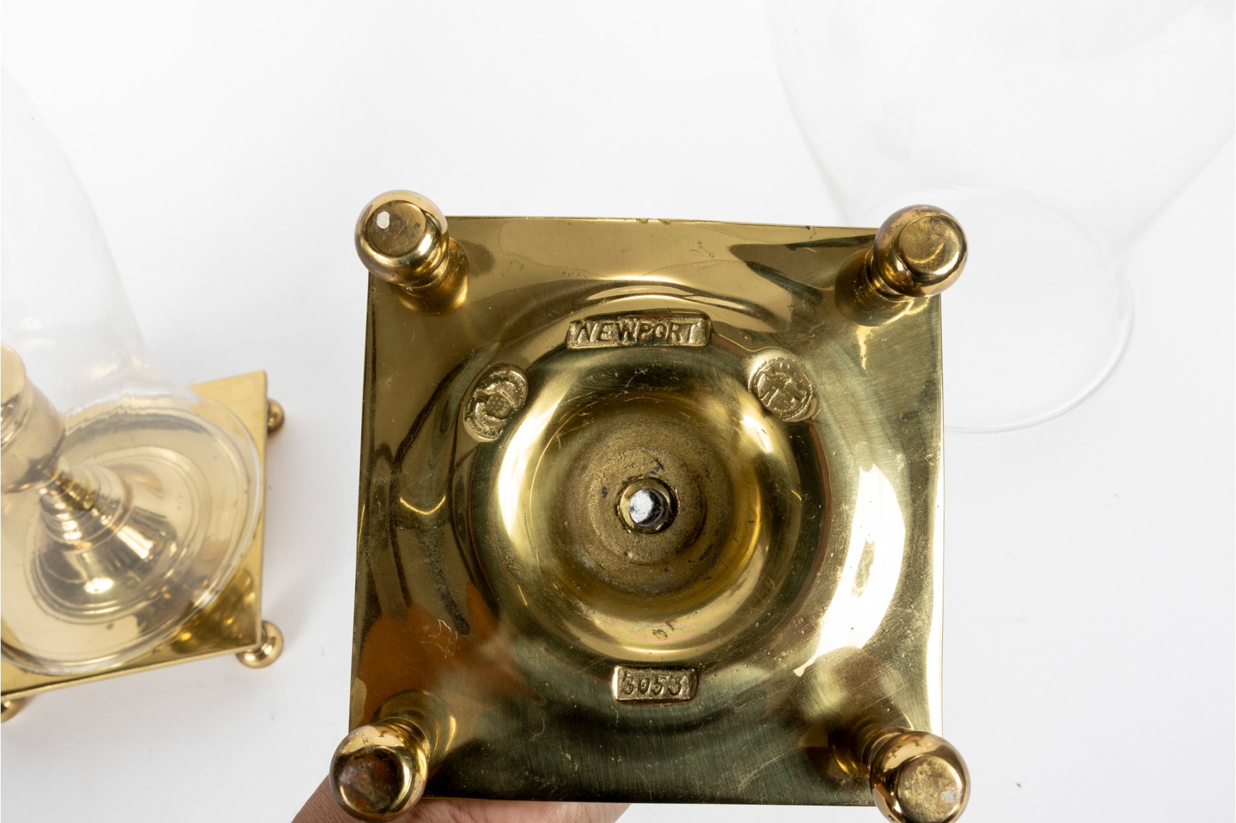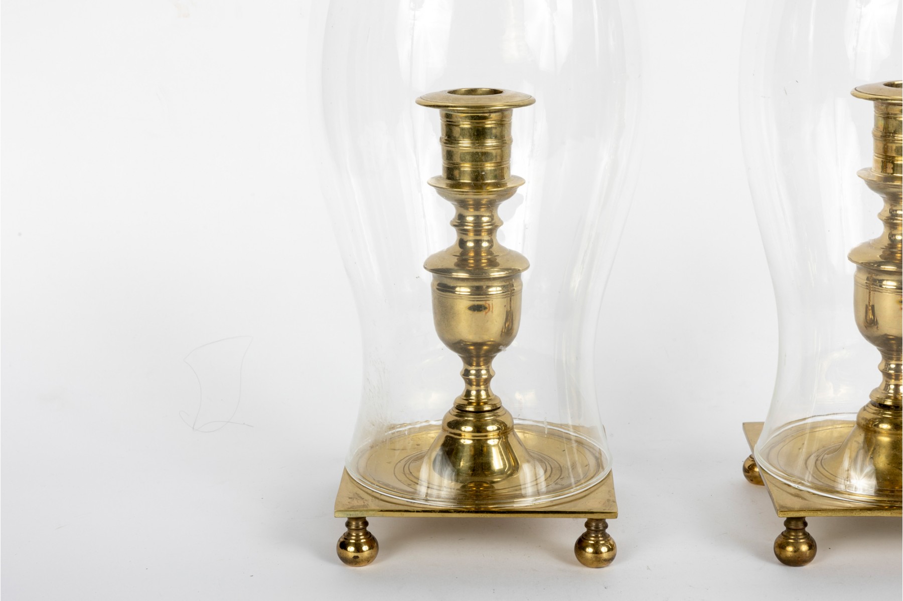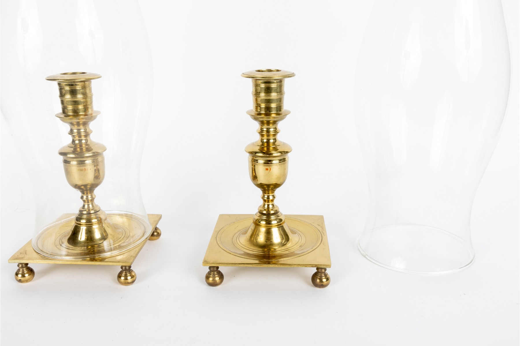Virginia Metalcrafters Newport pair of large brass hurricane candlesticks with banded and turned columns over square bases raised on bun feet. Topped with elegantly curving glass chimneys. Marked on the underside of the bases.