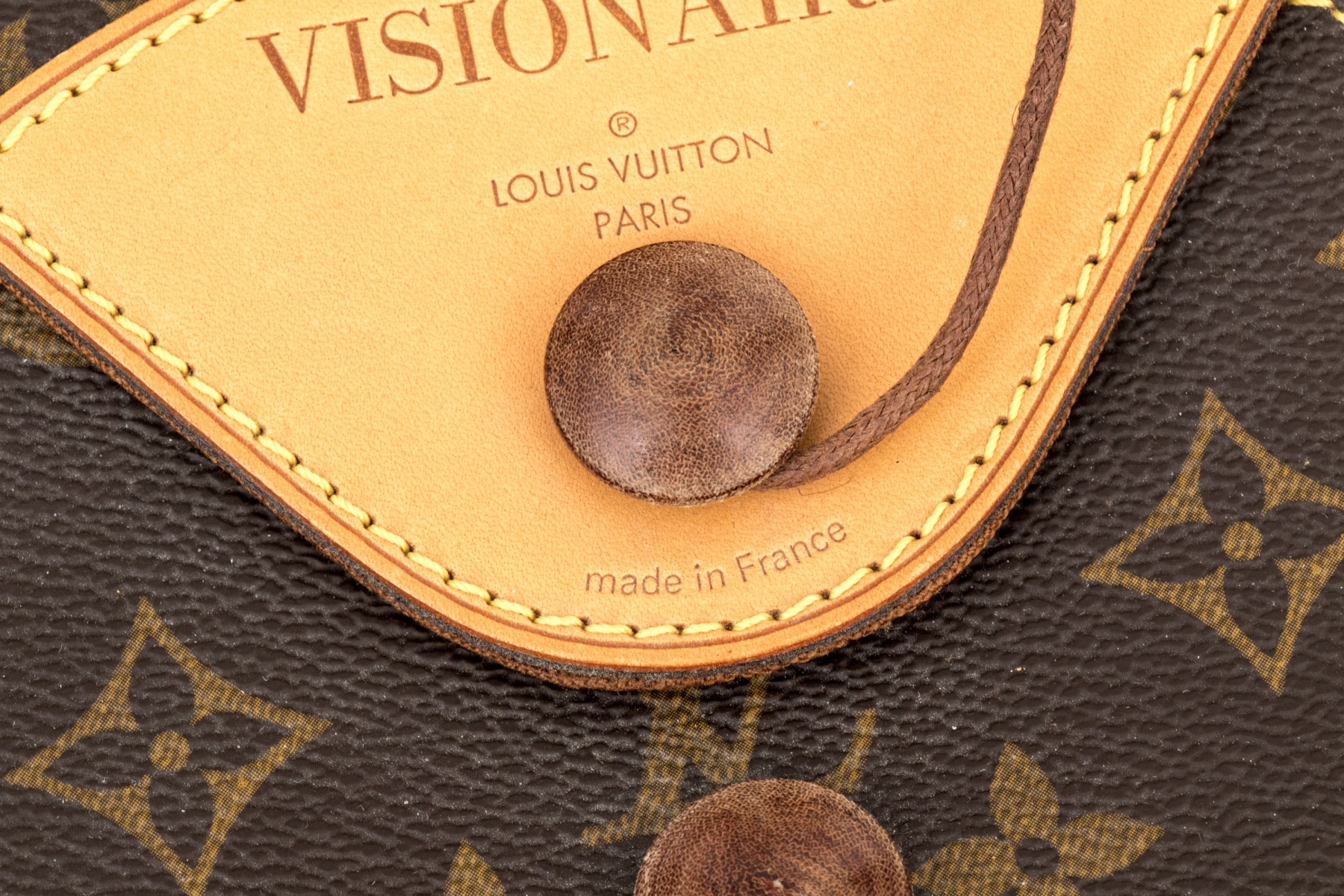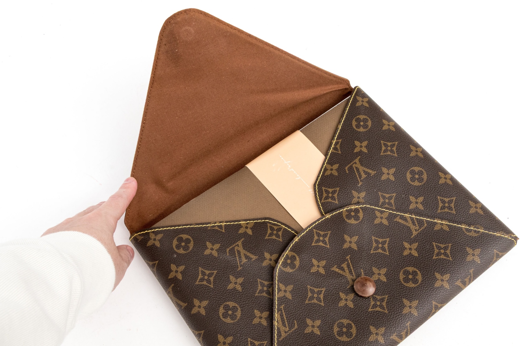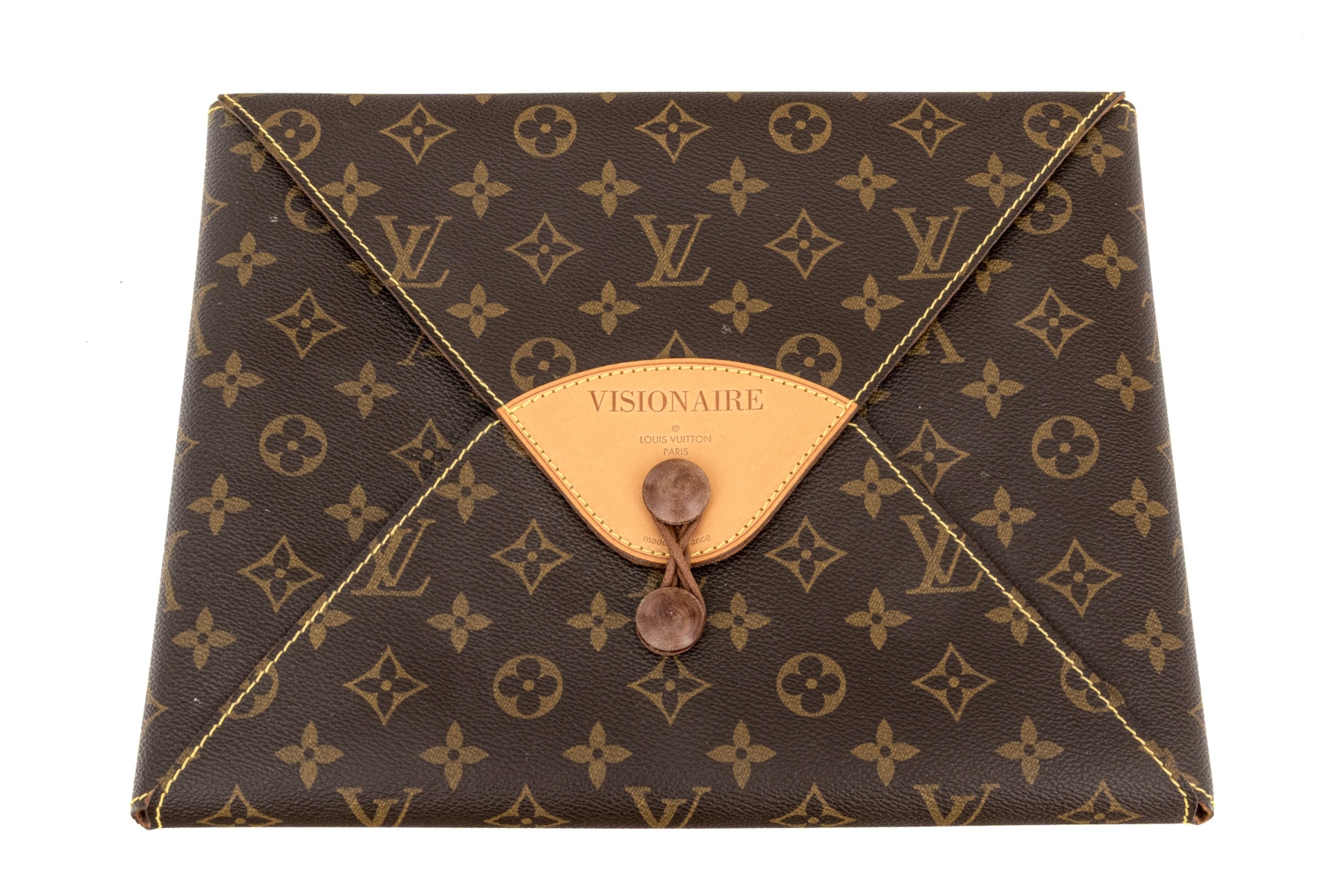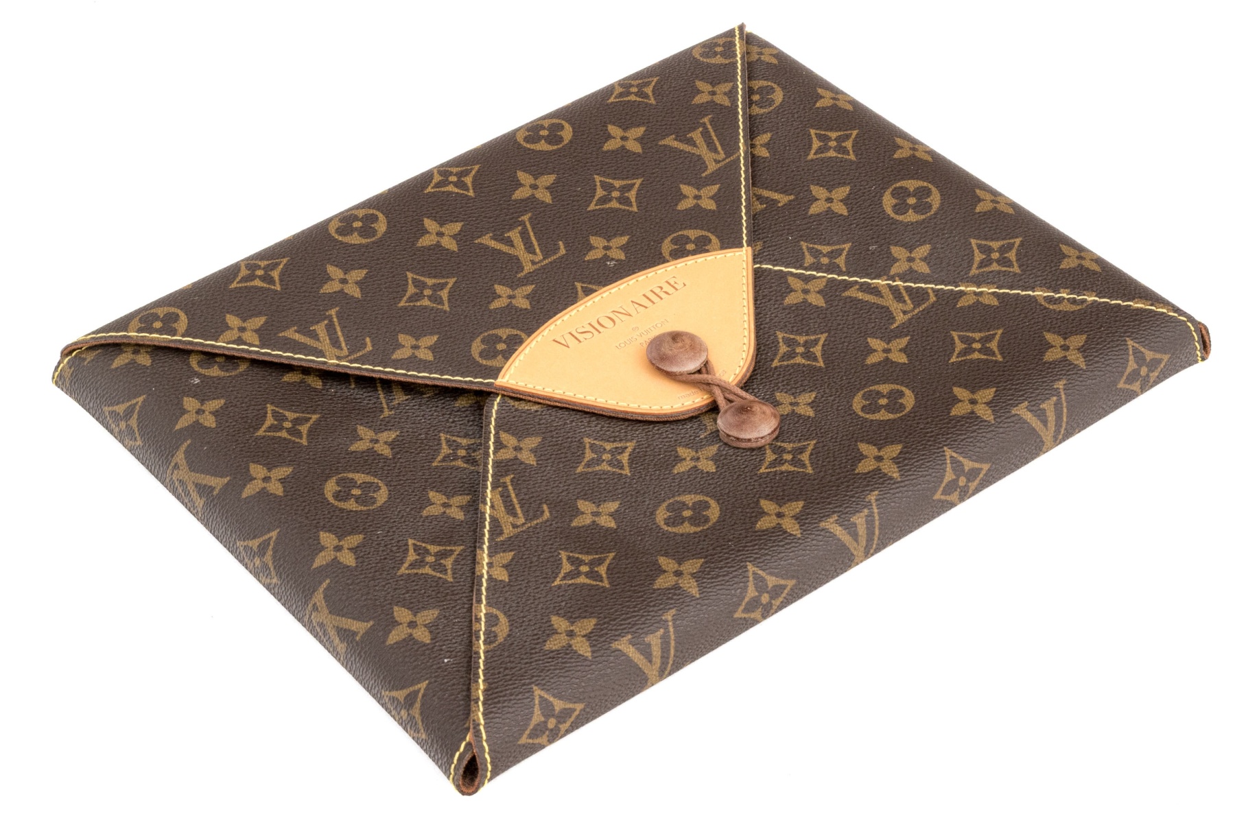 Louis Vuitton created an envelope style with a distinctive tie closure using wooden beads and a leather tie, using the monogrammed coated canvas body, with natural cowhide leather trim.