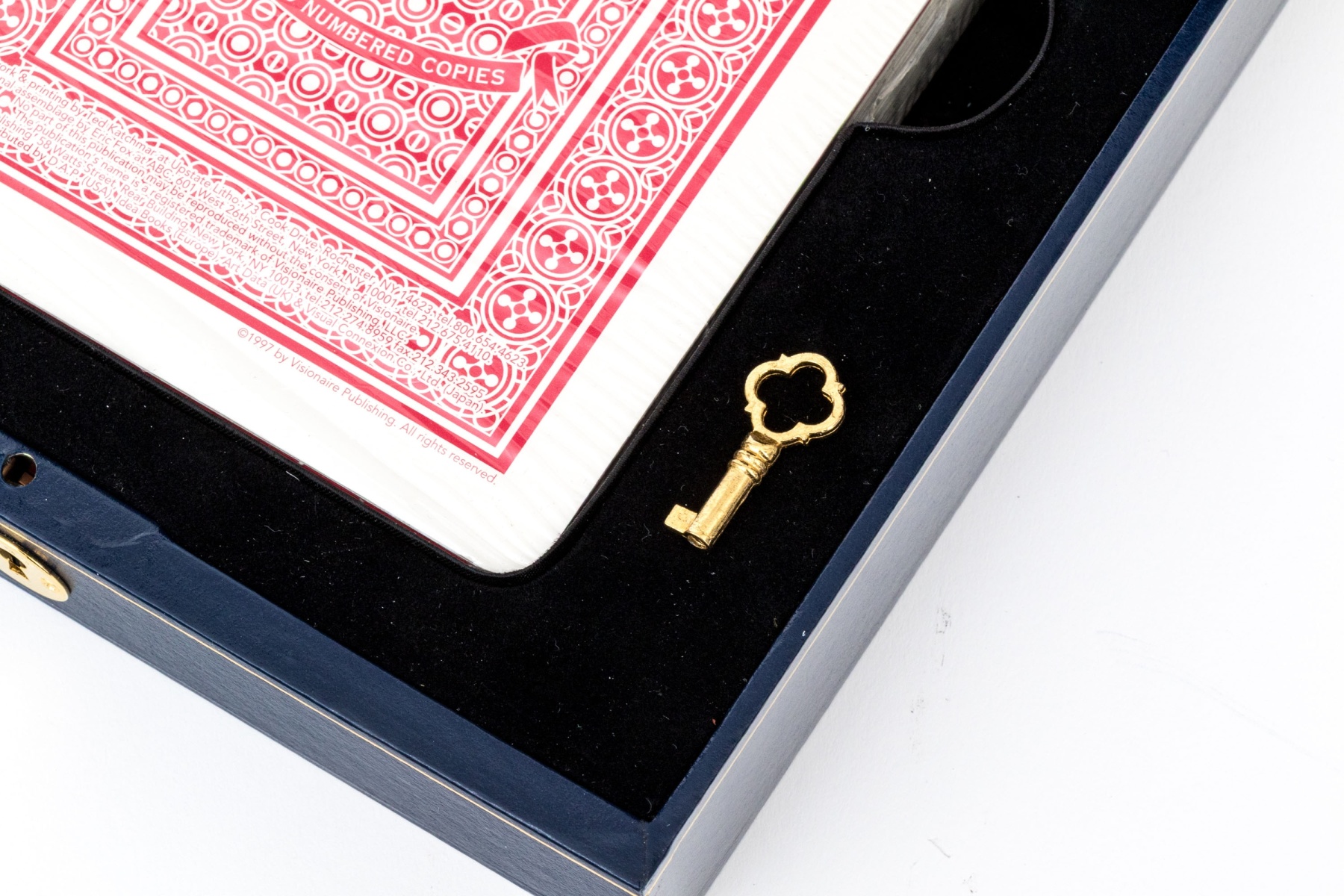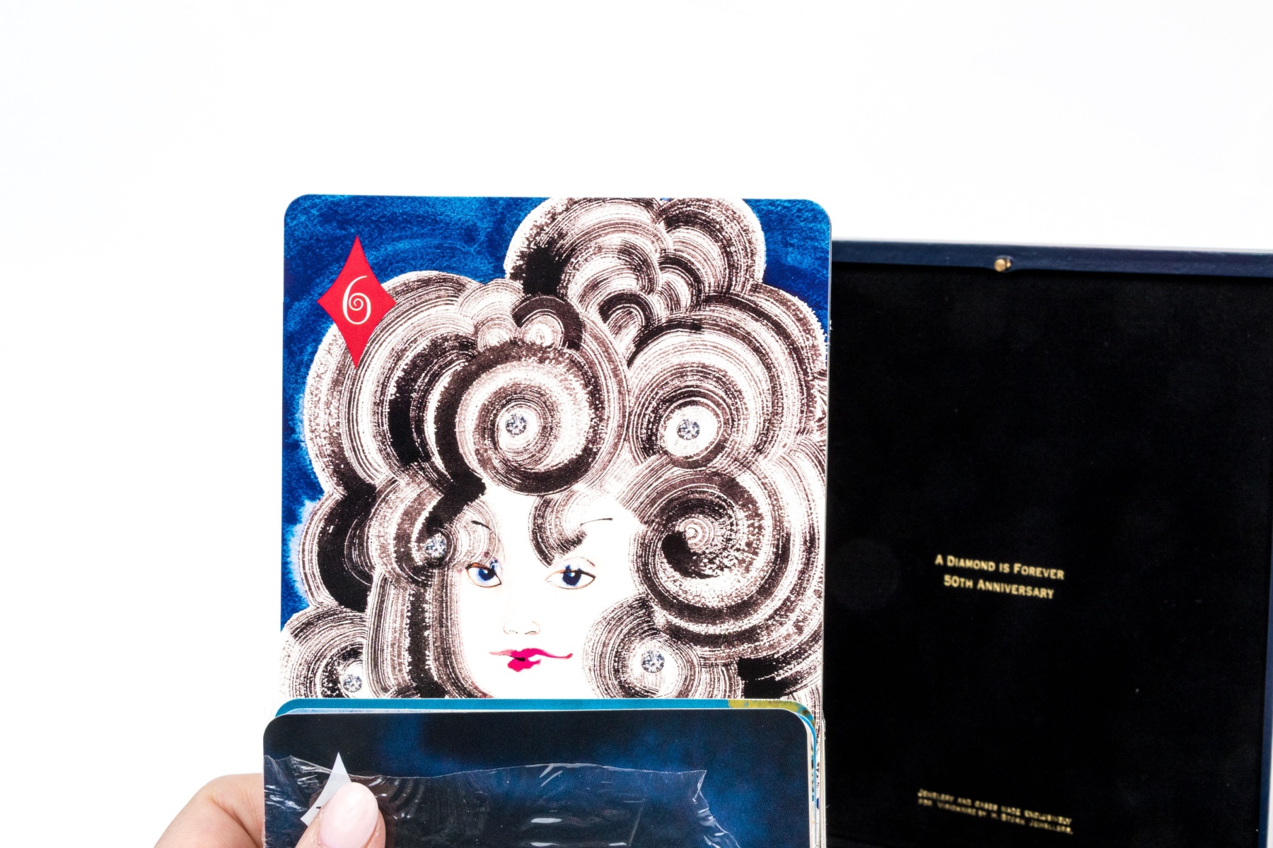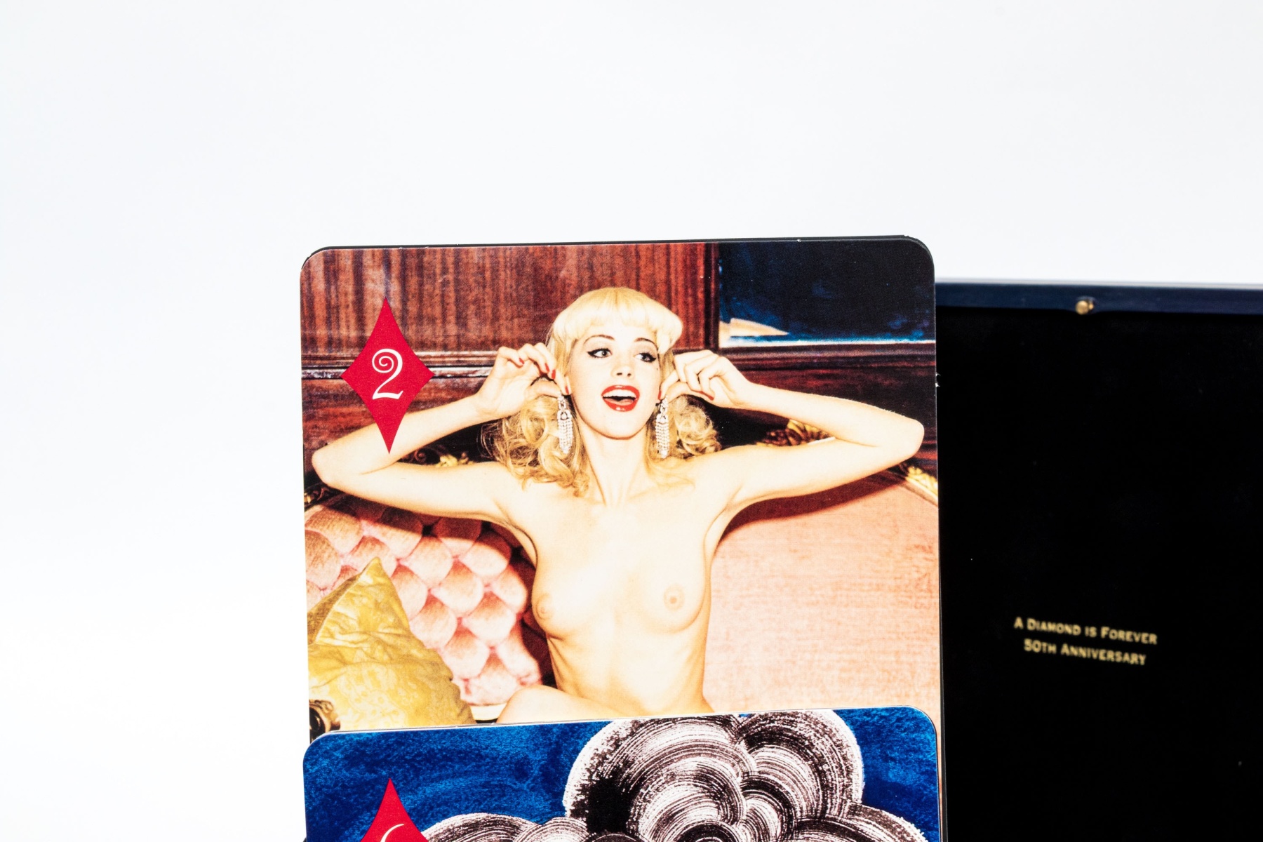 The set features an oversized deck of cards housed in a lockable jewelry box/presentation case, which includes a key. and highlights include contributions from various renowned artists and designers, including Karl Lagerfeld, Mario Testino, and David LaChapelle. This was produced as a limited edition of 3,000 copies worldwide, this is number 1238