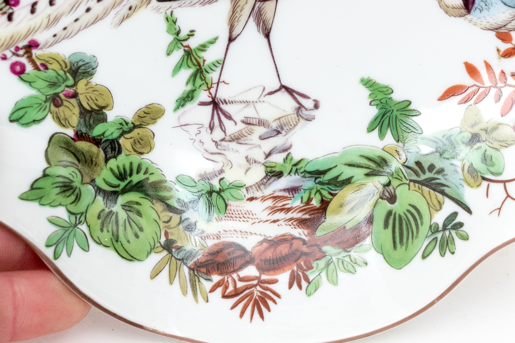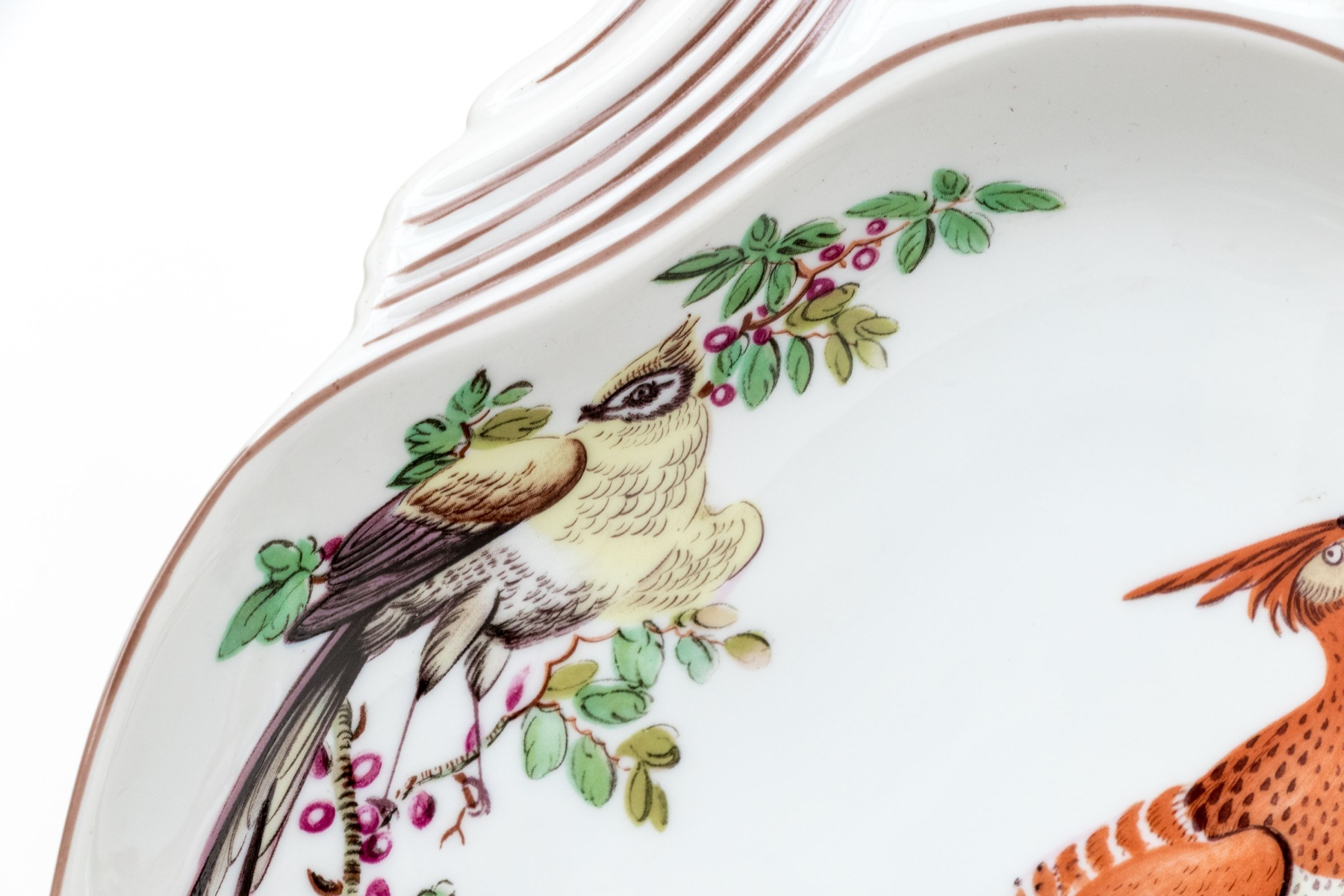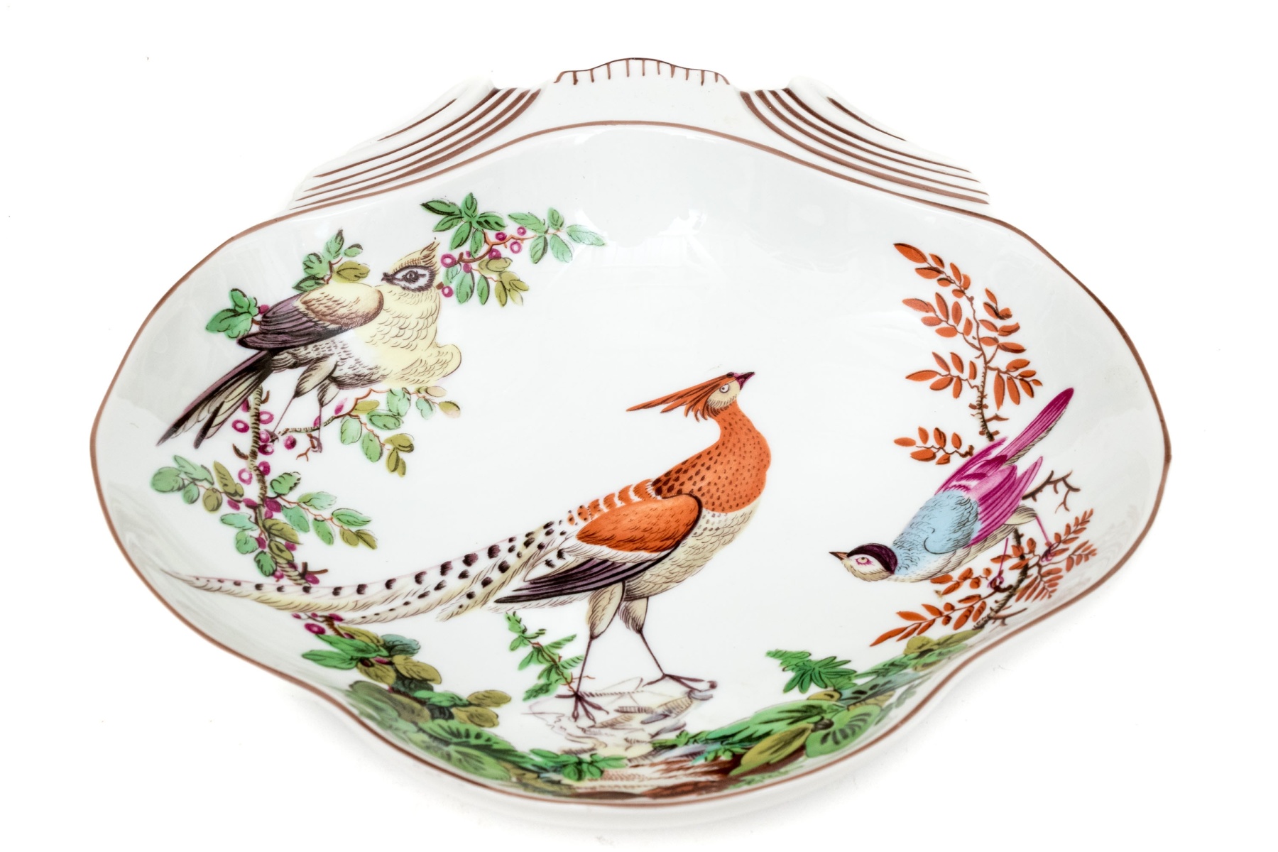 A beautiful Vista Alegre For Mottahedeh "Williamsburg" porcelain bowl with an abstracted clamshell form decorated with a famille rose scene of various birds in a natural landscape with lush orange, magenta, and green foliage. Marked underfoot.