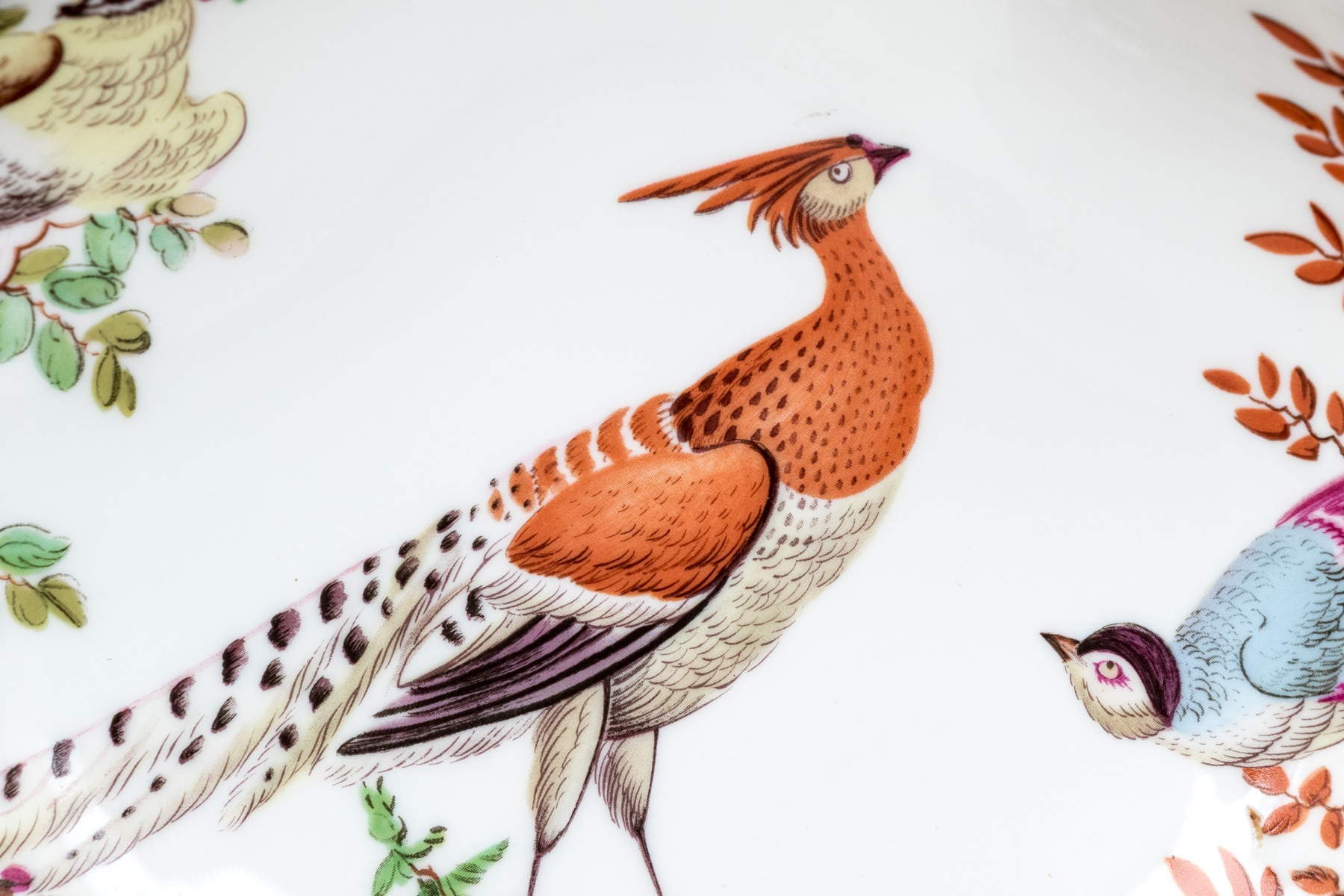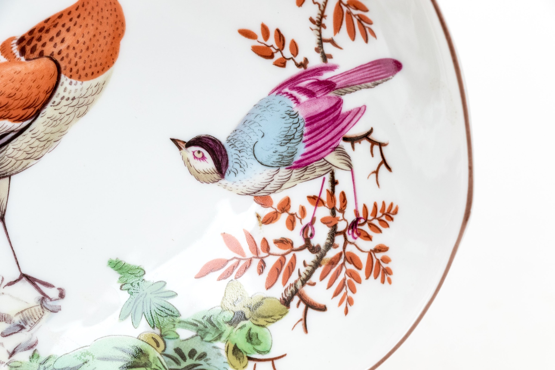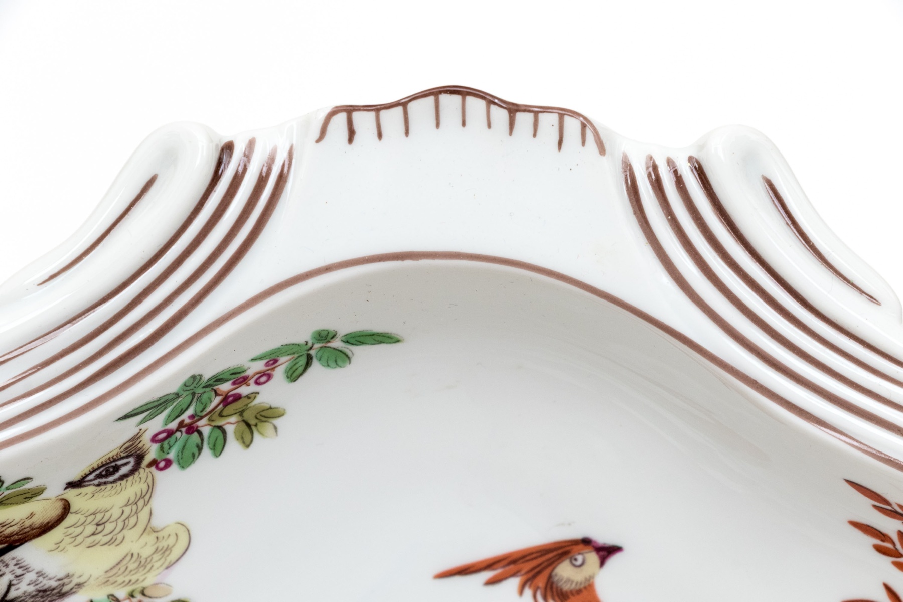 A beautiful Vista Alegre For Mottahedeh "Williamsburg" porcelain bowl with an abstracted clamshell form decorated with a famille rose scene of various birds in a natural landscape with lush orange, magenta, and green foliage. Marked underfoot.