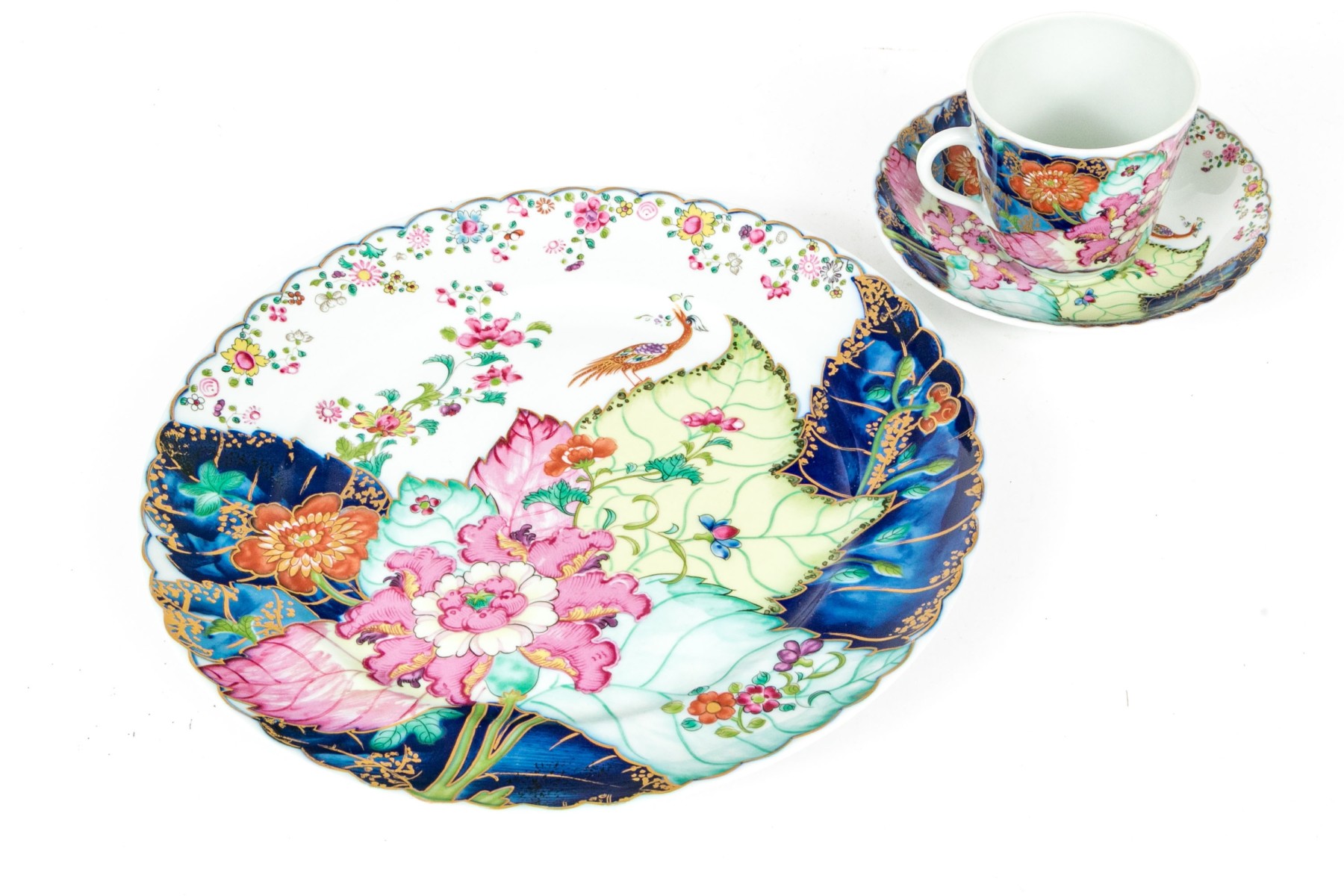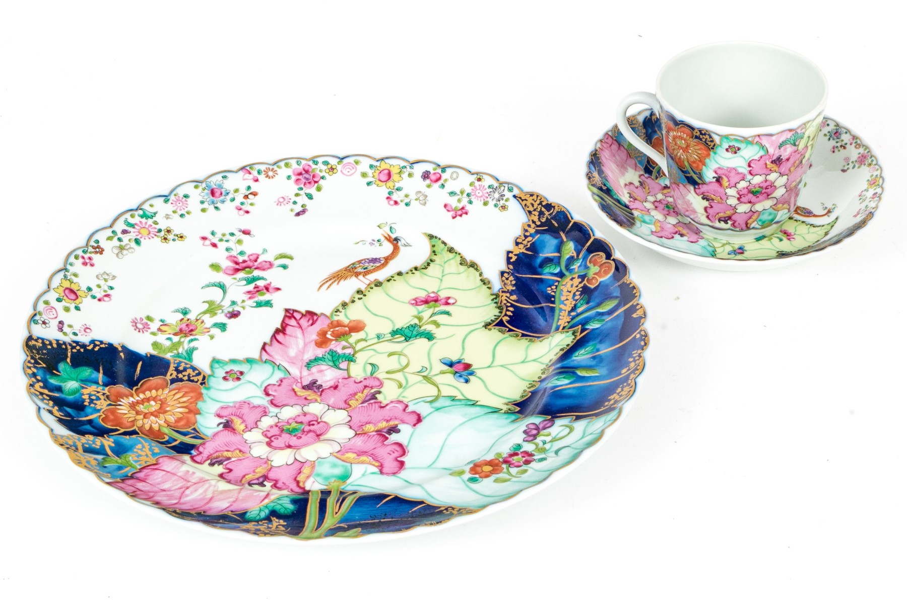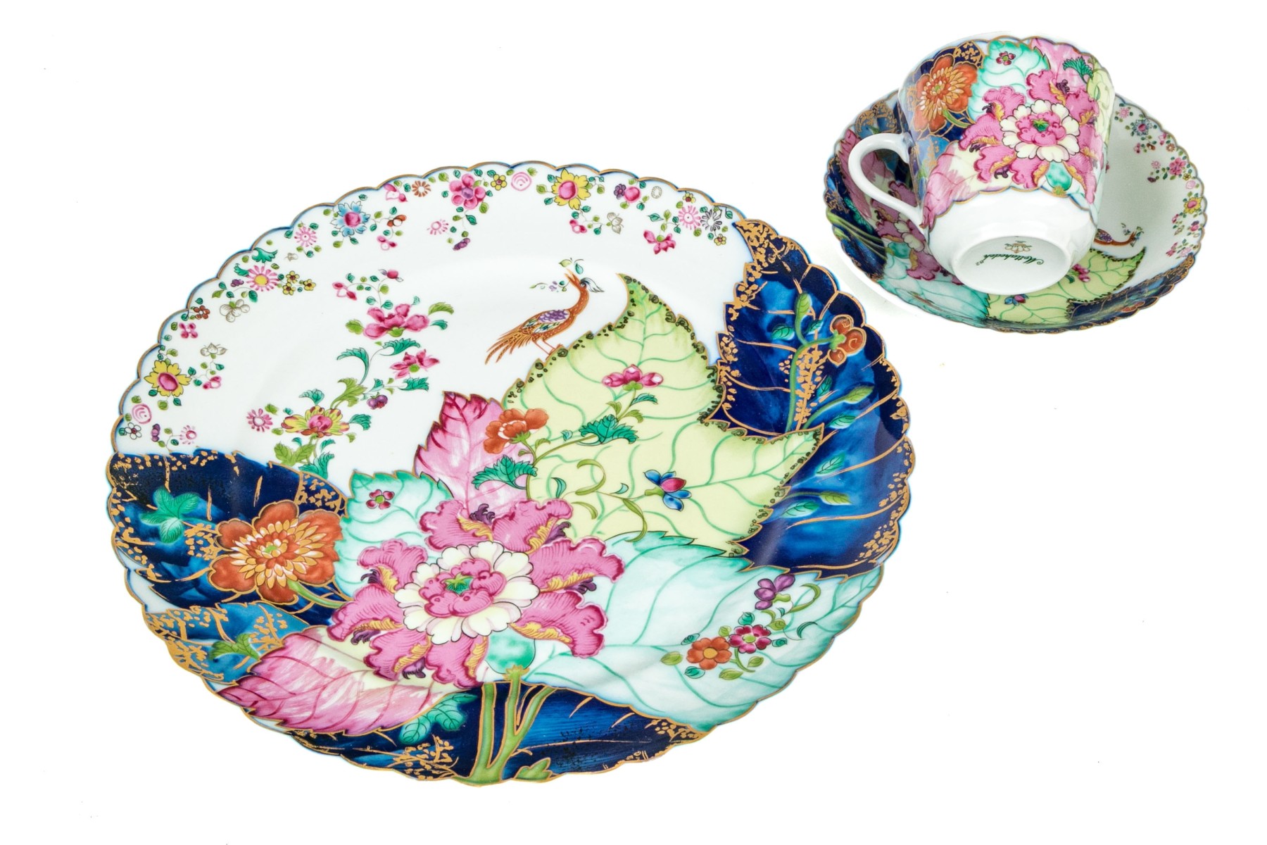 A wonderful collection of Vista Alegre Mottahedeh china including a dinner plate, teacup, and saucer, all with gorgeous reproduction tobacco leaf patterns featuring lush pink, yellow, and orange flowers on green, teal, and cobalt blue leaves. Pieces are further decorated with dainty floral sprays, bugs, and bird motifs with scalloped trims. Marked underfoot.