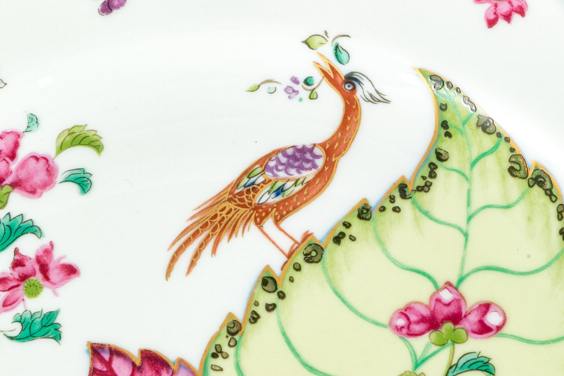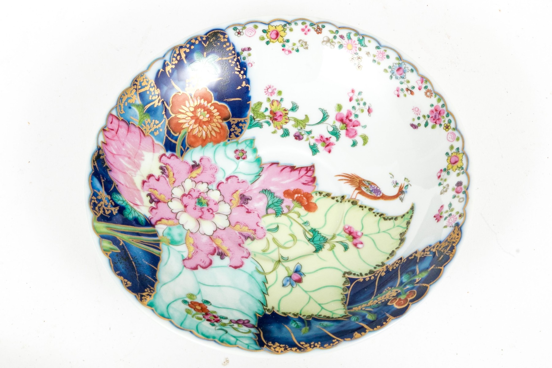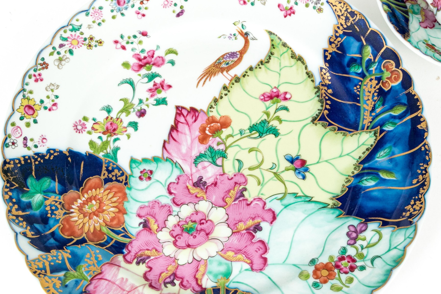 A wonderful collection of Vista Alegre Mottahedeh china including a dinner plate, teacup, and saucer, all with gorgeous reproduction tobacco leaf patterns featuring lush pink, yellow, and orange flowers on green, teal, and cobalt blue leaves. Pieces are further decorated with dainty floral sprays, bugs, and bird motifs with scalloped trims. Marked underfoot.