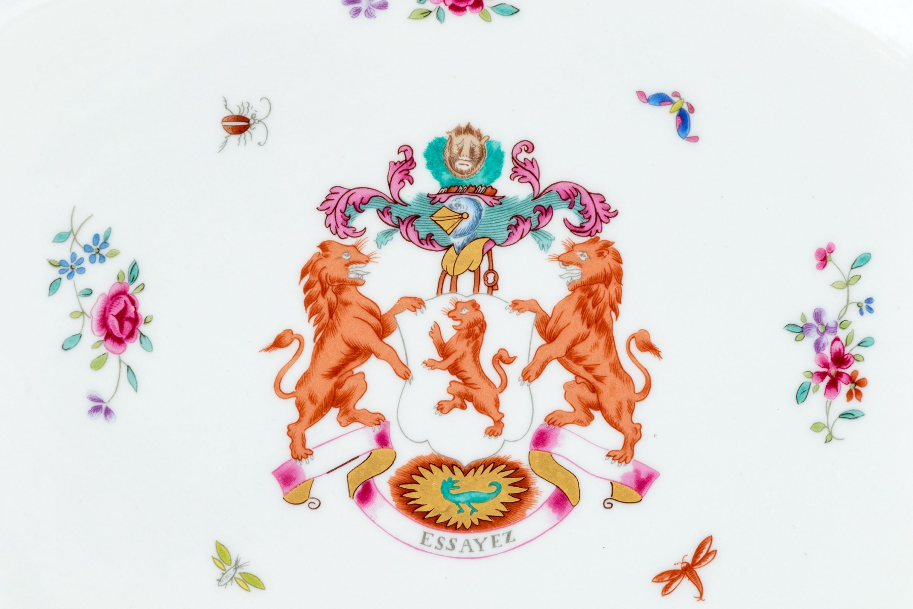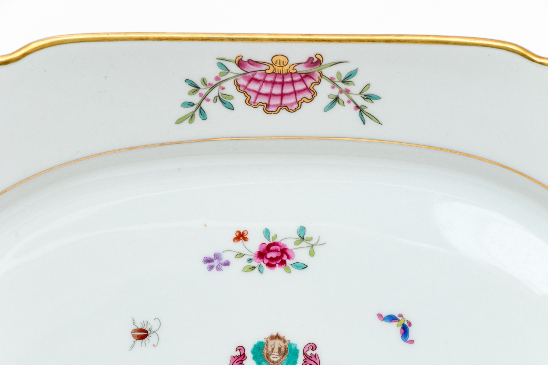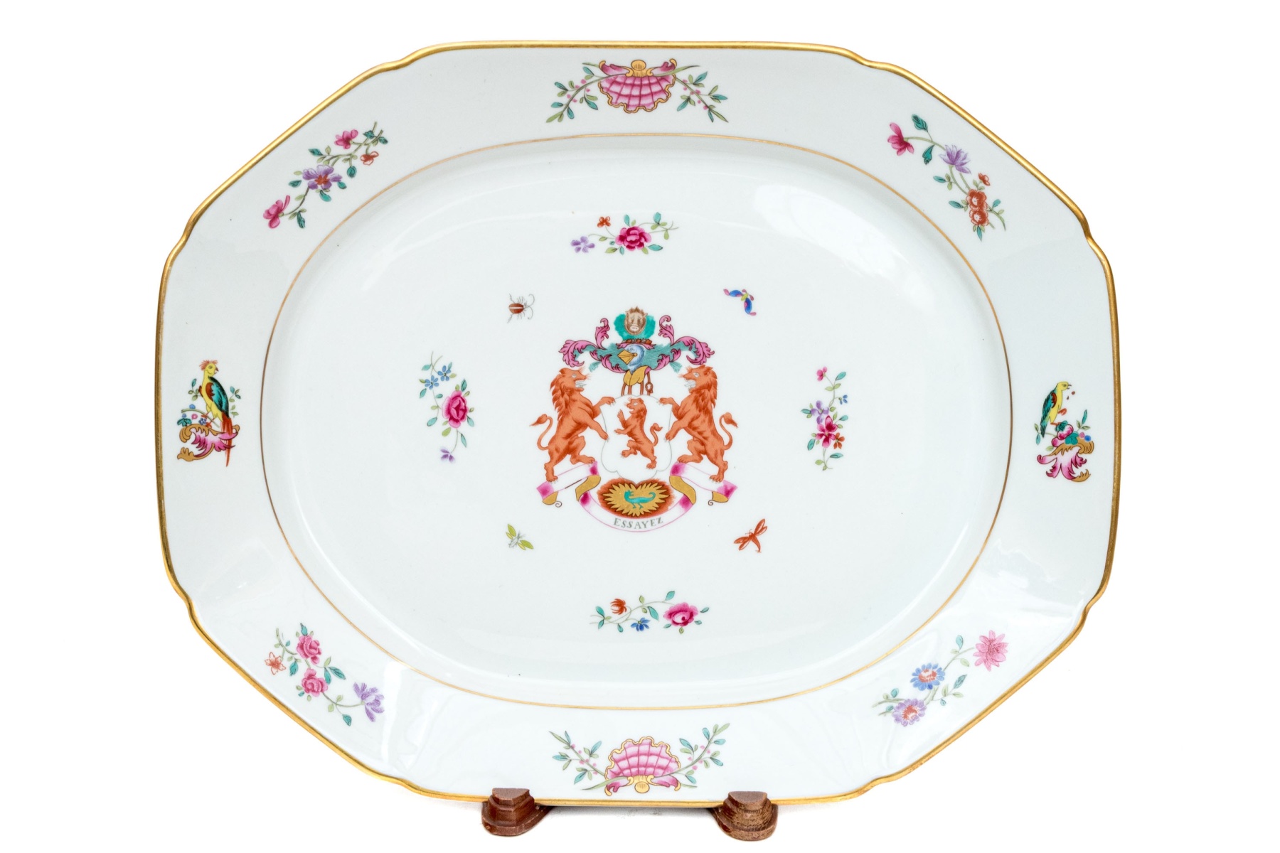 A charming Vista Allegre For Mottahedeh porcelain serving platter in gorgeous Chinese export style, showcasing an octagonal form with scalloped gilt edges around a band of bird, acanthus, and floral sprays surrounding a central scene of heraldic motifs with lions, flowers, and moths in vibrant famille rose hues. Marked underfoot.