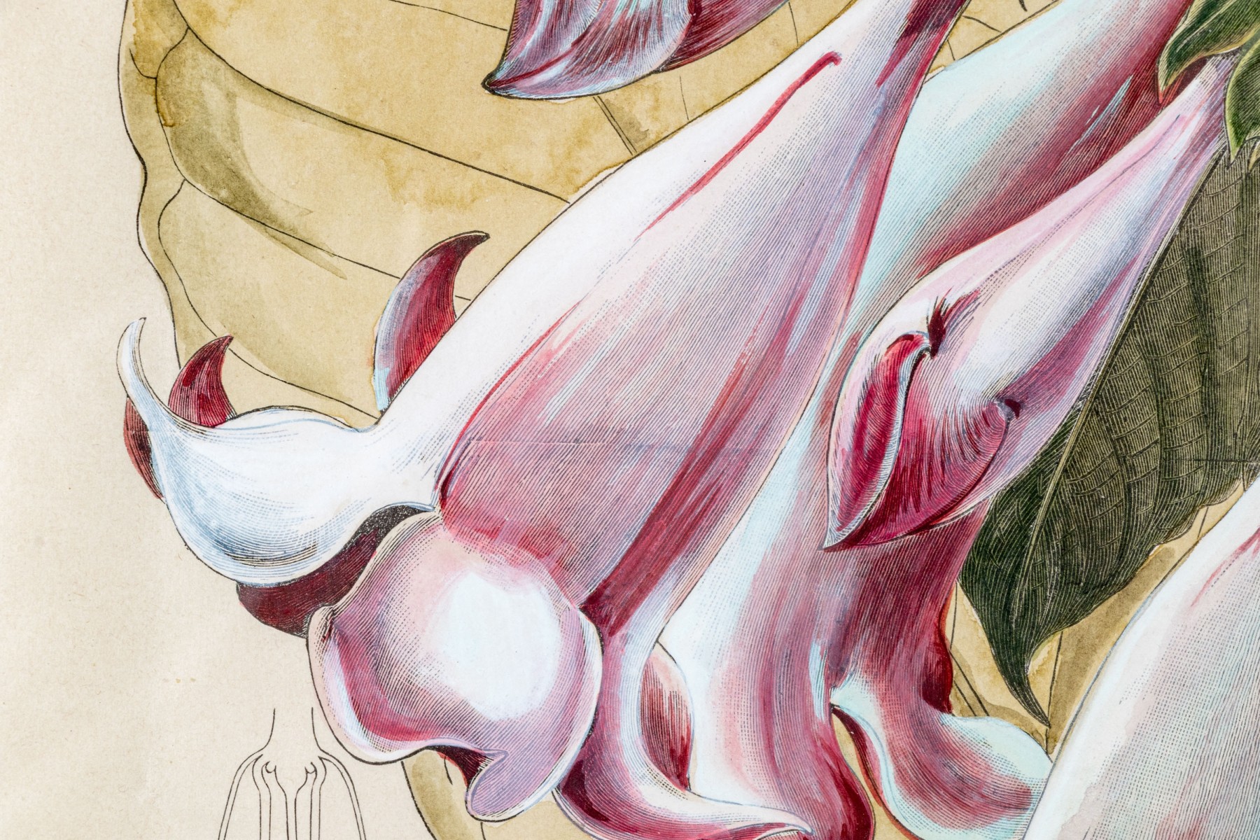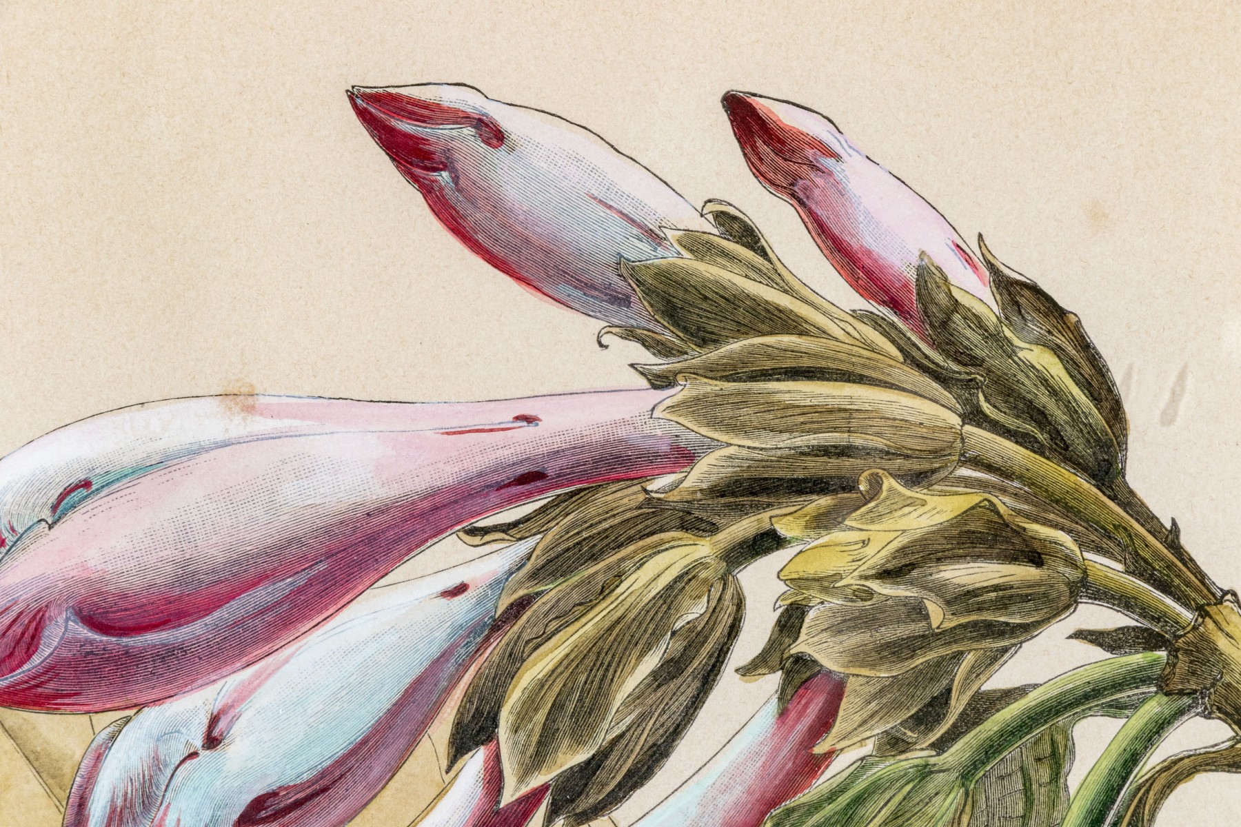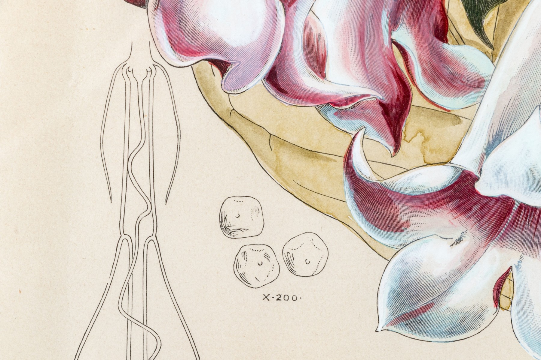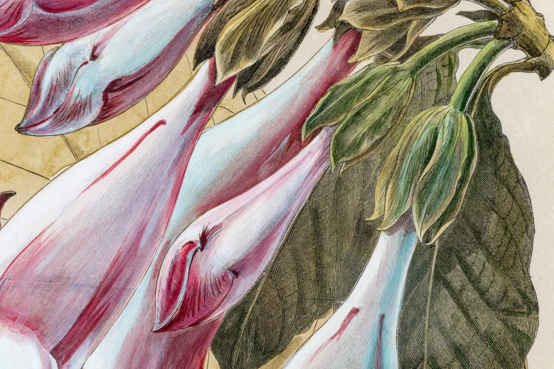 Label on verso. Illustrated book plate for a French horticultural book. White and purple Beaumontia Grandiflora wall. Presented finely matted in a gilt frame with glass.