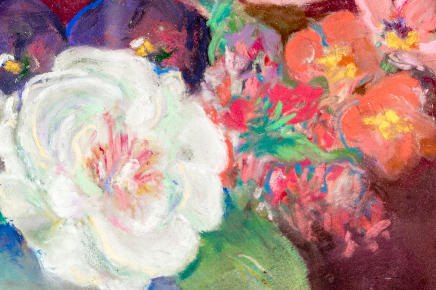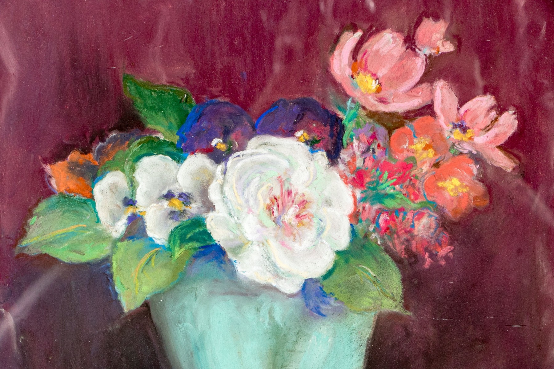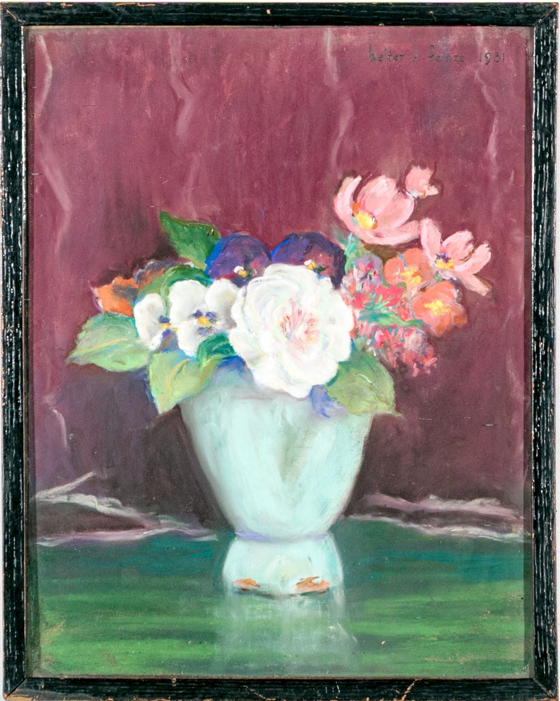Walter A. Peinze was an American artist best known for his larger landscapes. This work is a lovely more diminutive gouache on paper painting depicting a still life scene with a footed vase with vibrant and polychromatic floral bouquet. The vase is set on green with a red-purple toned background.