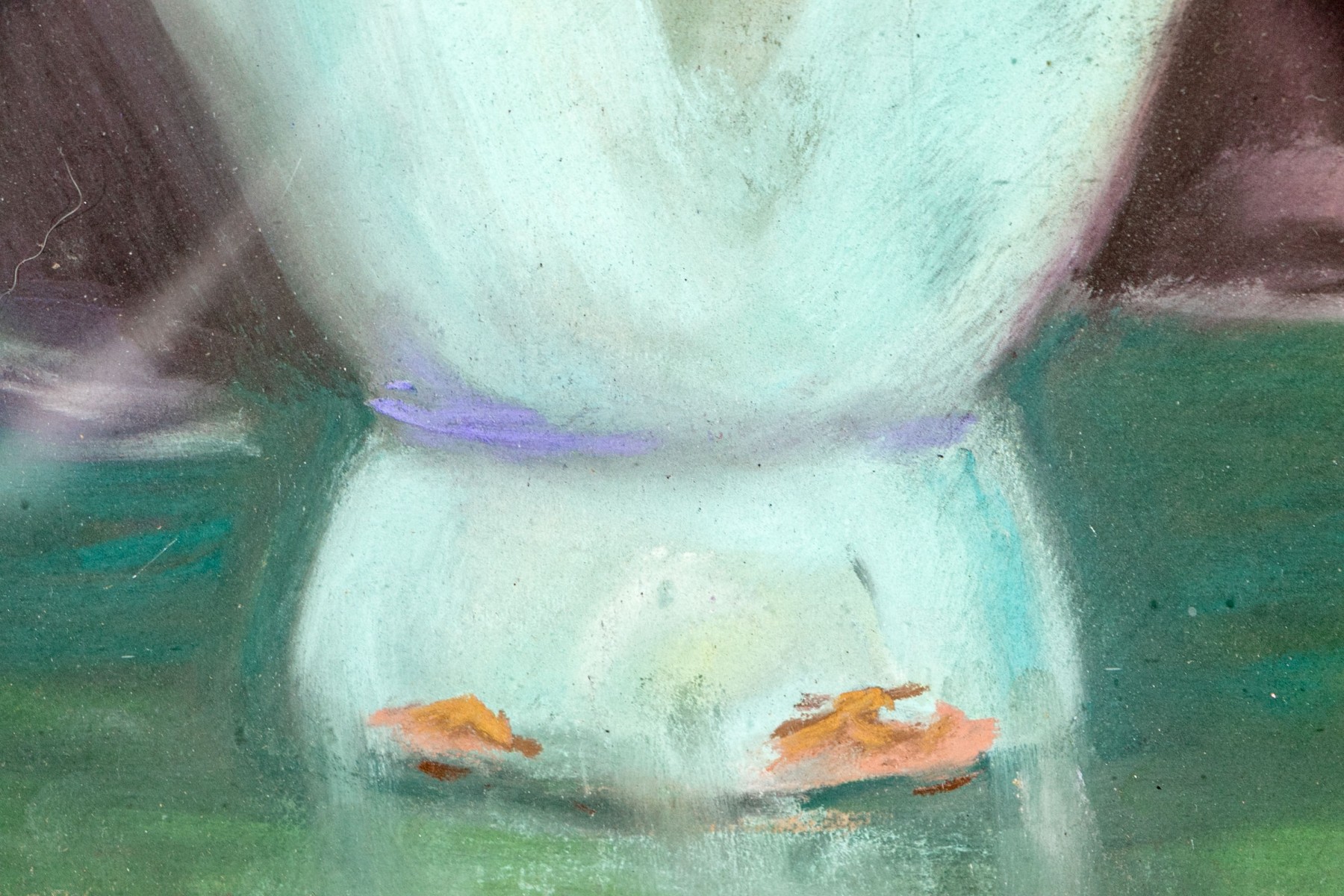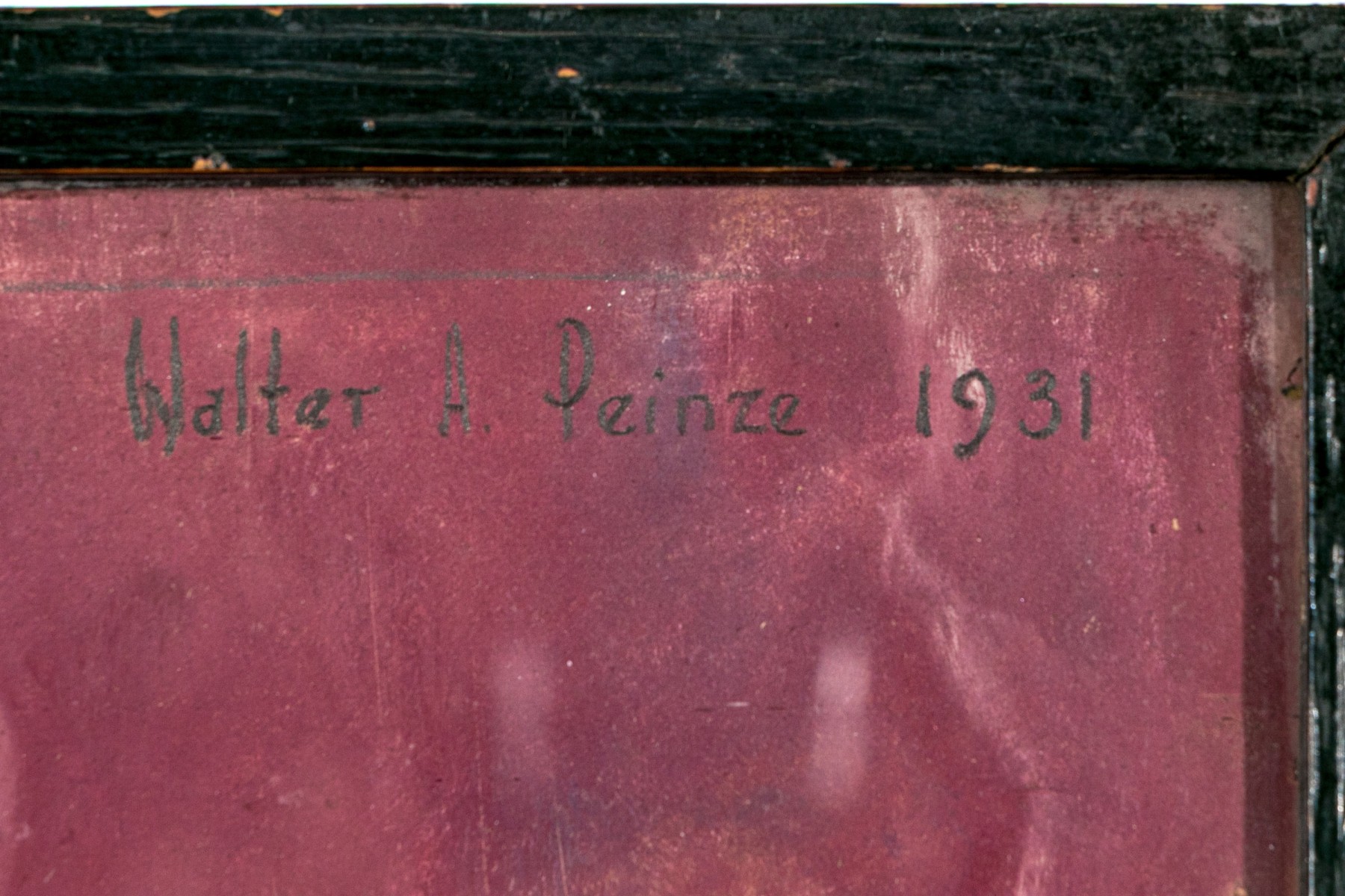The gouache painted finish is worn in spots around the trim edges with some potential water damage to the upper corners. There is wear and losses to the finish on the wood frame. Additionally the painting is loose in its frame with the upper left quadrant not being firmly affixed within the corner of the frame. Despite wear the painting presents wonderfully overall.