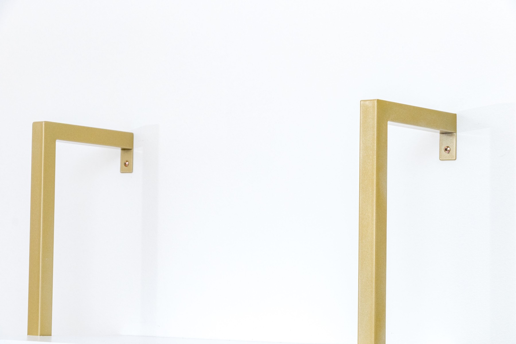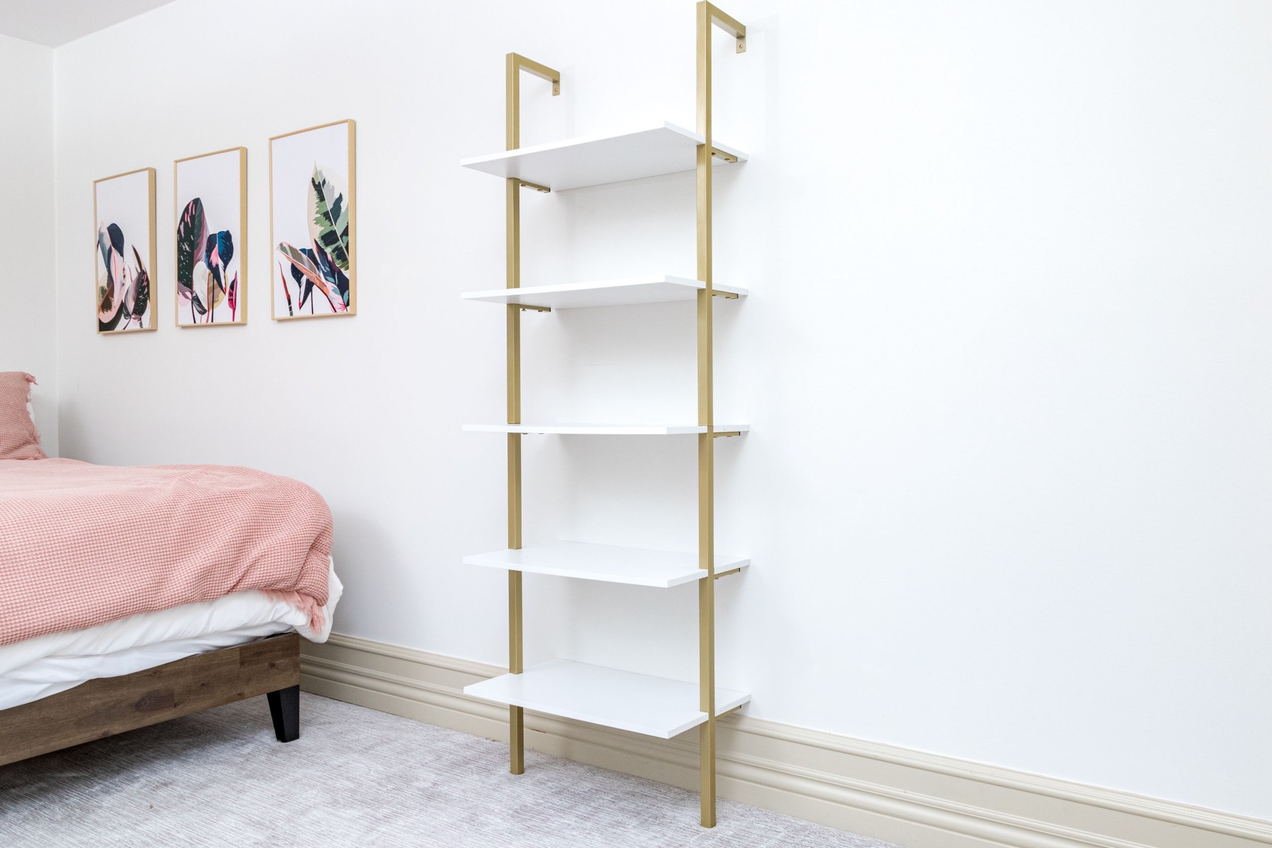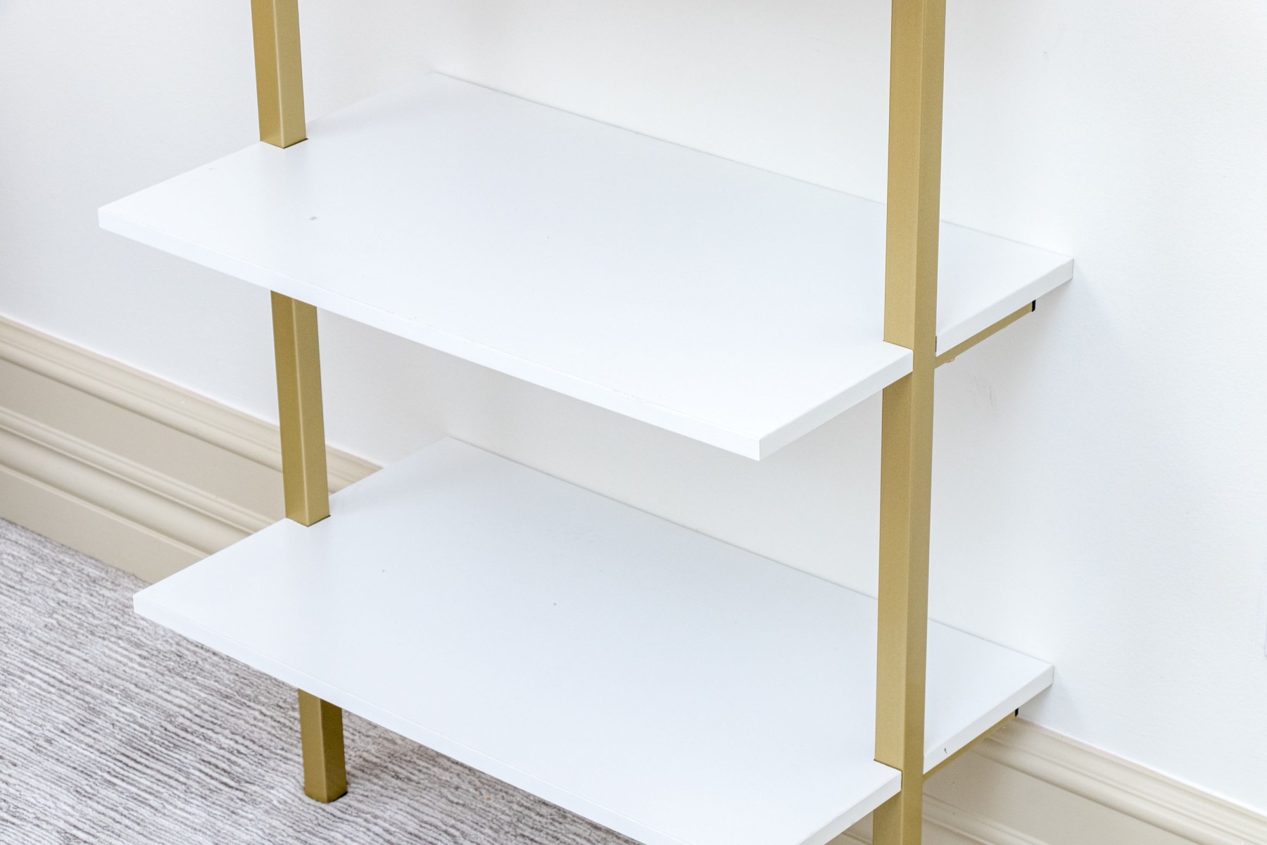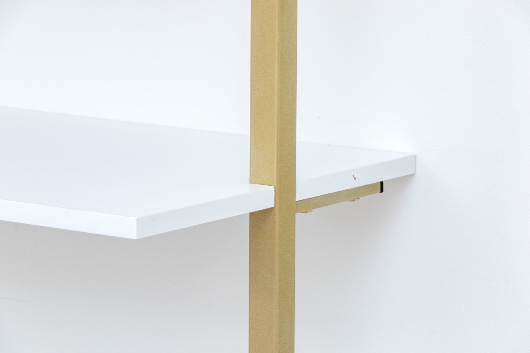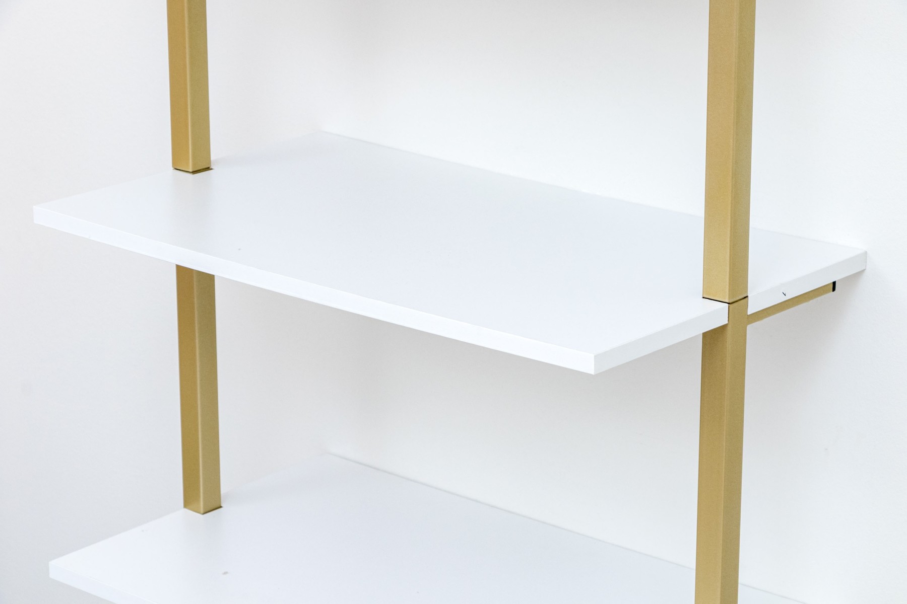 A chic modern shelf with a sleek ladder profile sporting two rectangular brass columns and five airy white rectangular tiers. Brackets at the top screw into the wall for support.