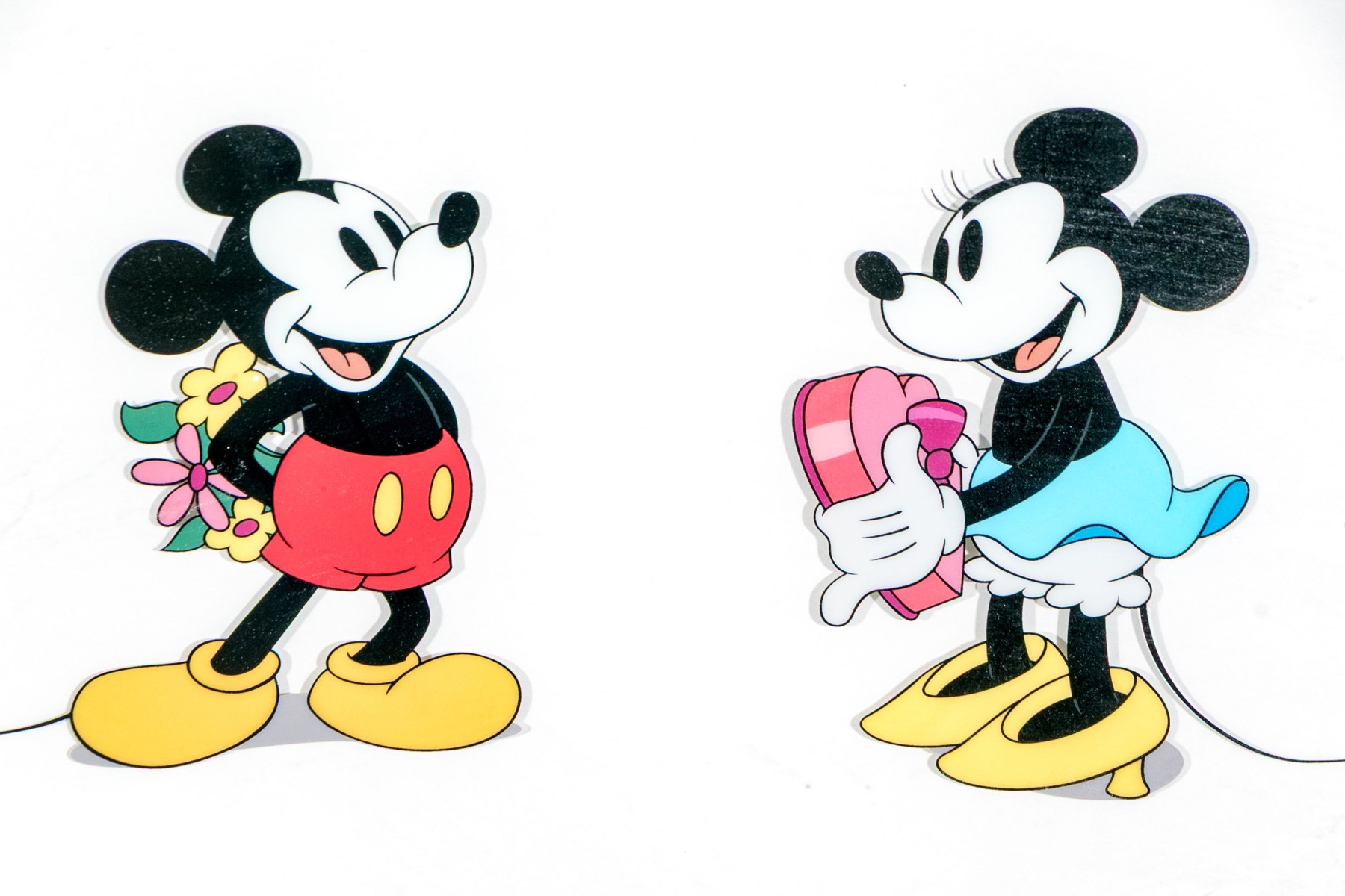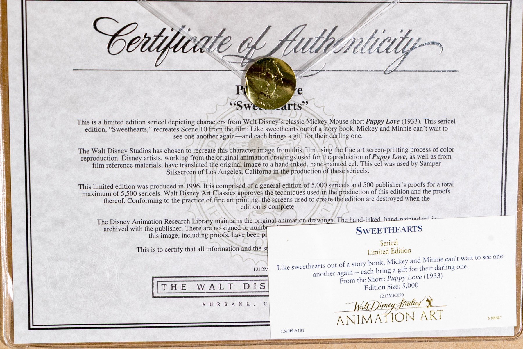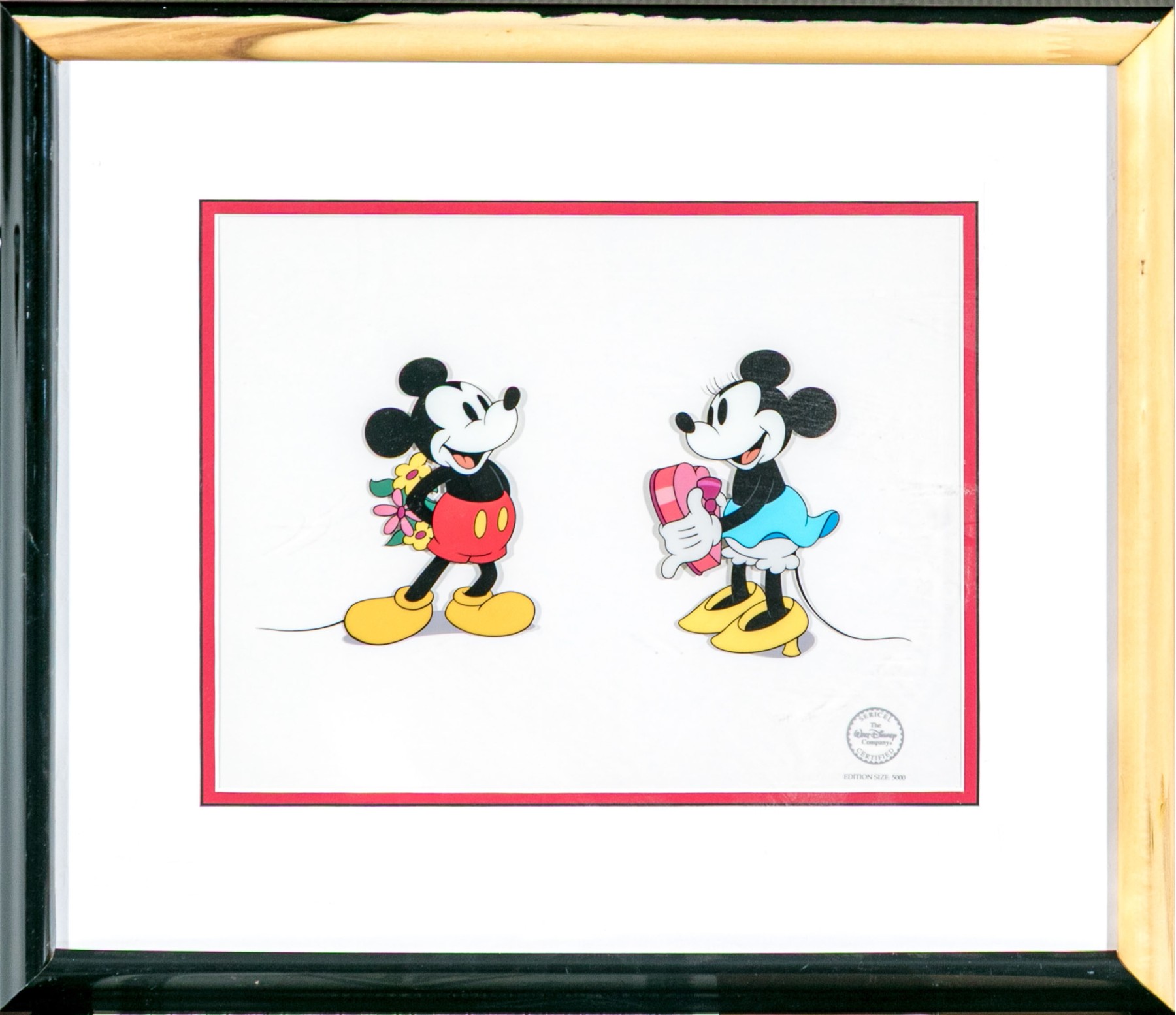 Walt Disney Company "Sweethearts" sericel from the short Puppy Love (1933) depicting Mickey Mouse holding a bouquet of flowers behind his back while Minnie Mouse holds a heart-shaped box of chocolate. Includes a certificate of authenticity on the verso.