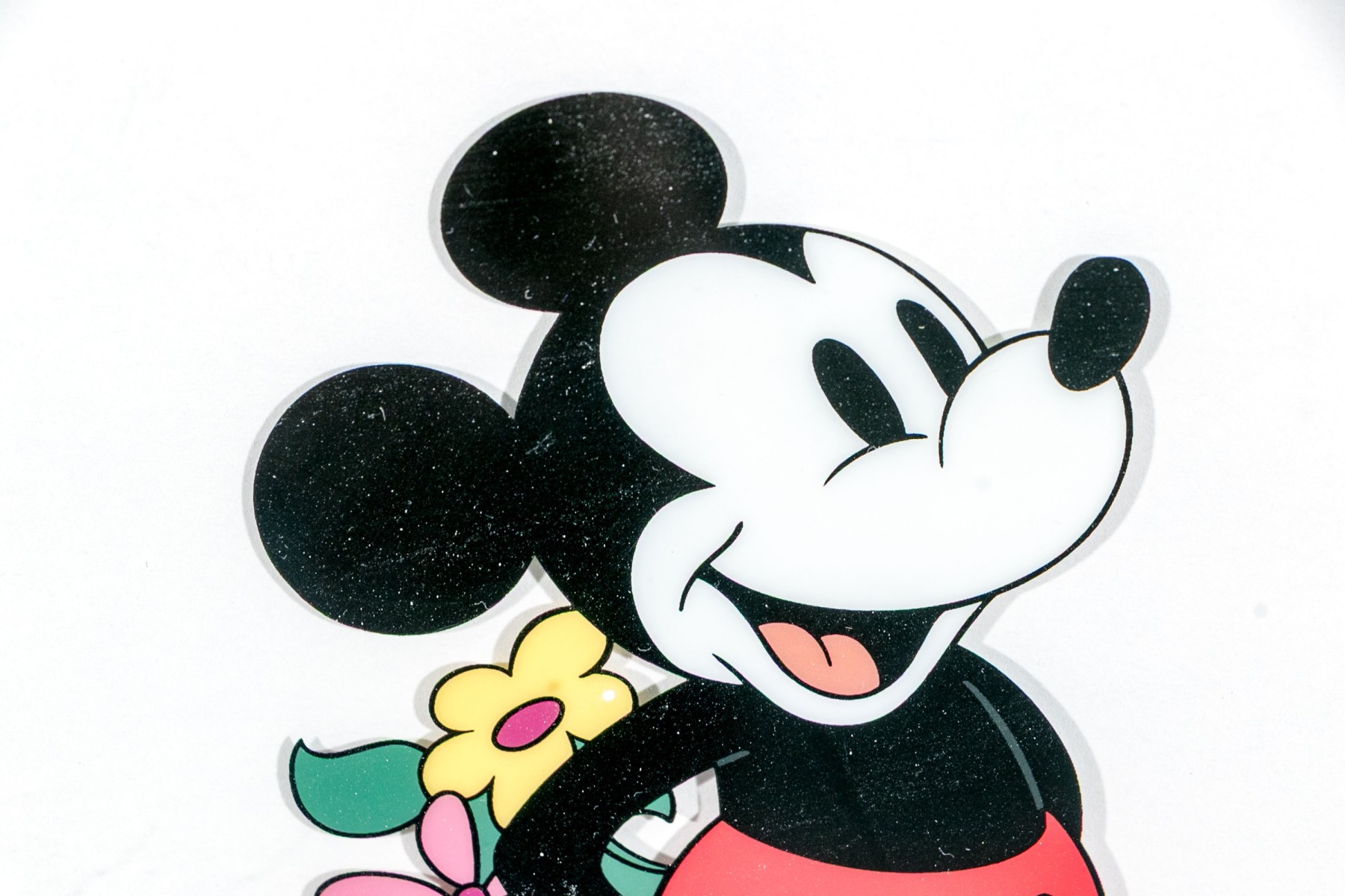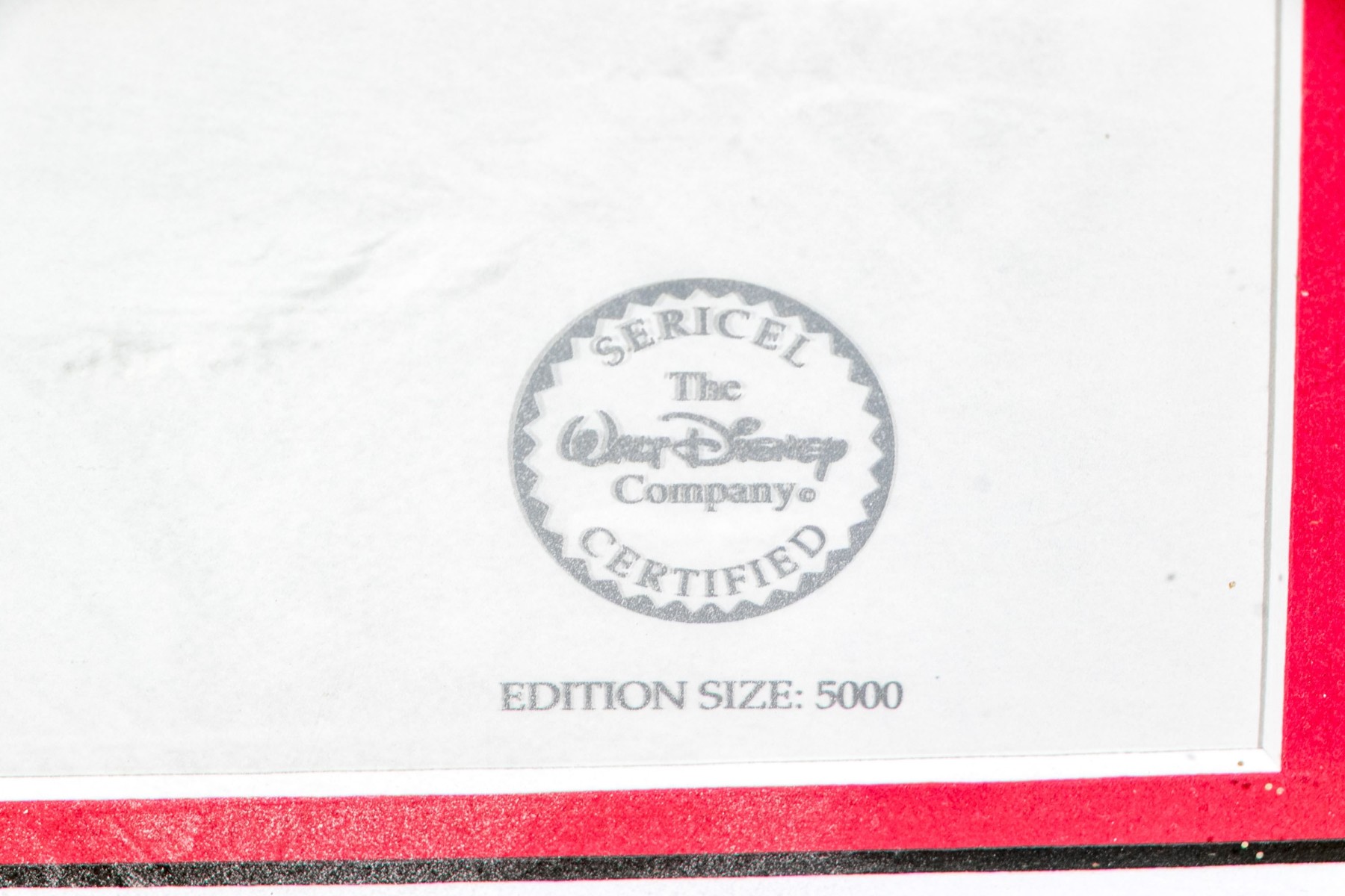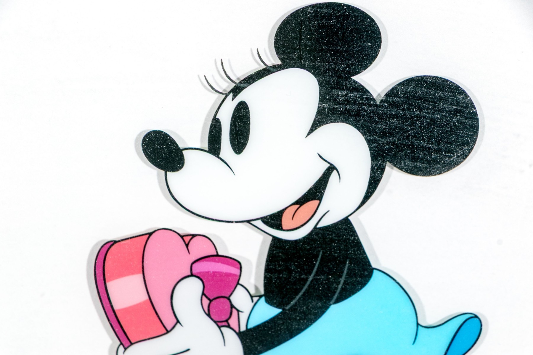 Walt Disney Company "Sweethearts" sericel from the short Puppy Love (1933) depicting Mickey Mouse holding a bouquet of flowers behind his back while Minnie Mouse holds a heart-shaped box of chocolate. Includes a certificate of authenticity on the verso.