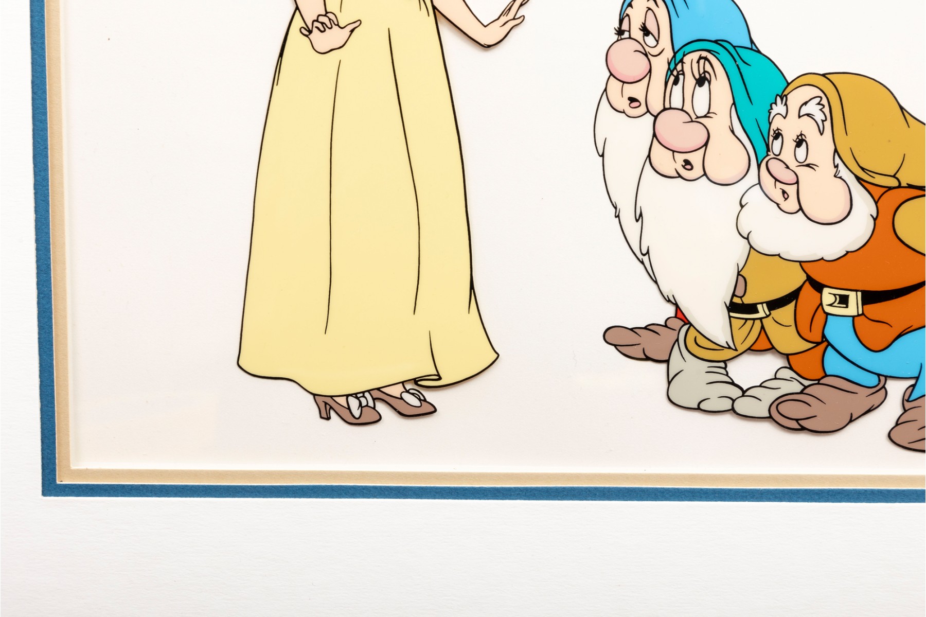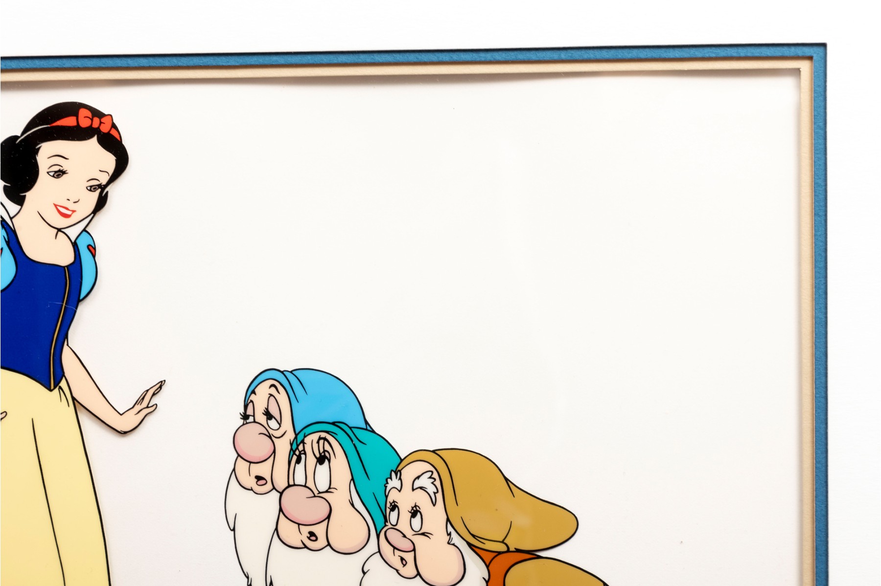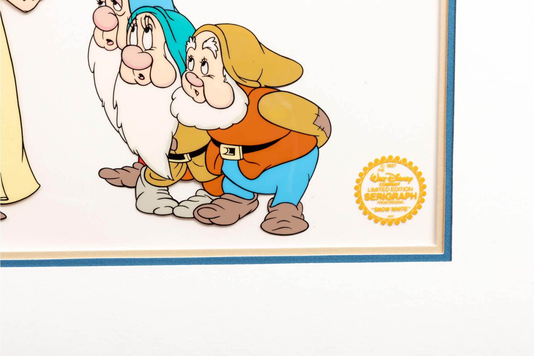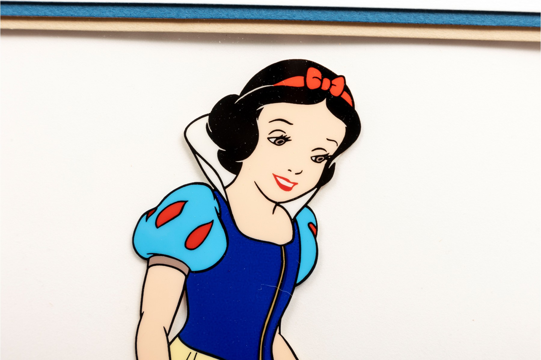 A limited edition vintage production cel serigraph showcasing a frame from Disney's 1938 star film, Snow White. additional information resides on the back as a form of an informational biography. The serigraph is unframed, left in mat setting with no glass facing. See photos for details.