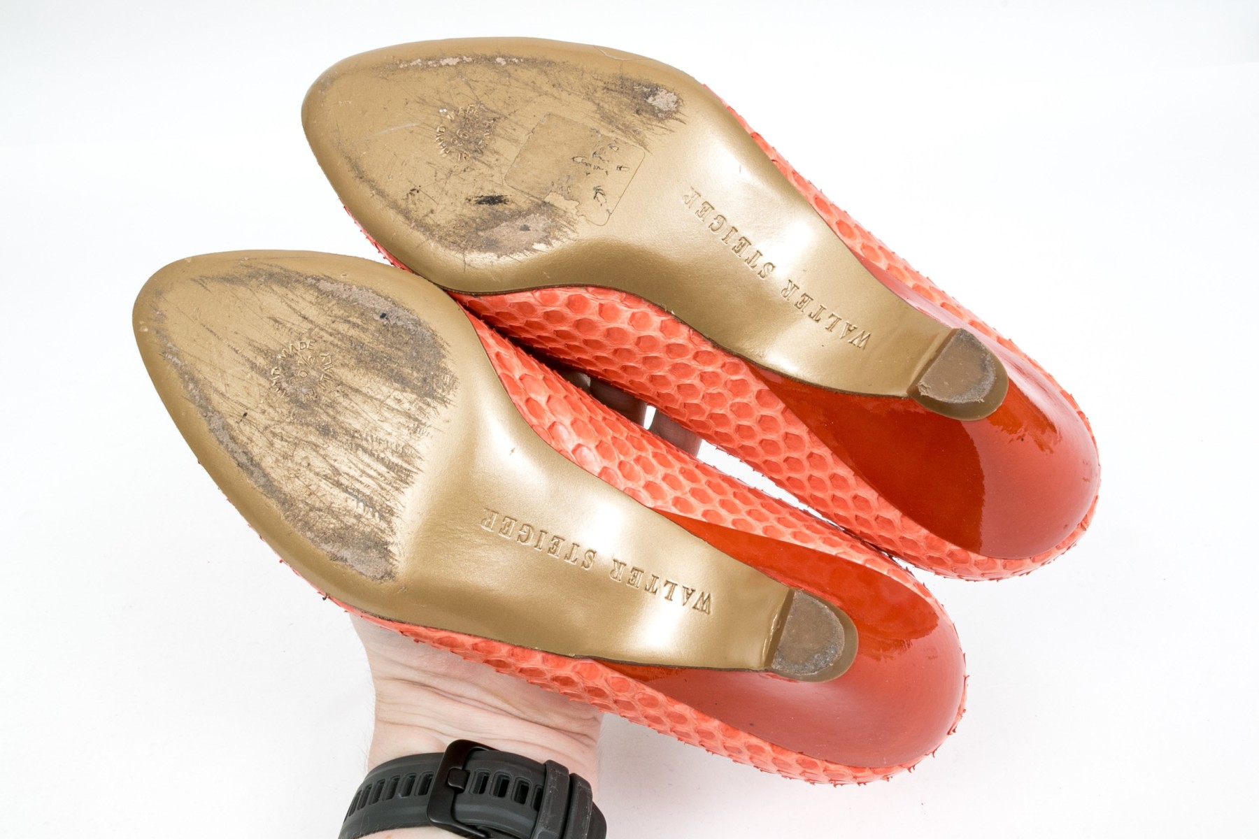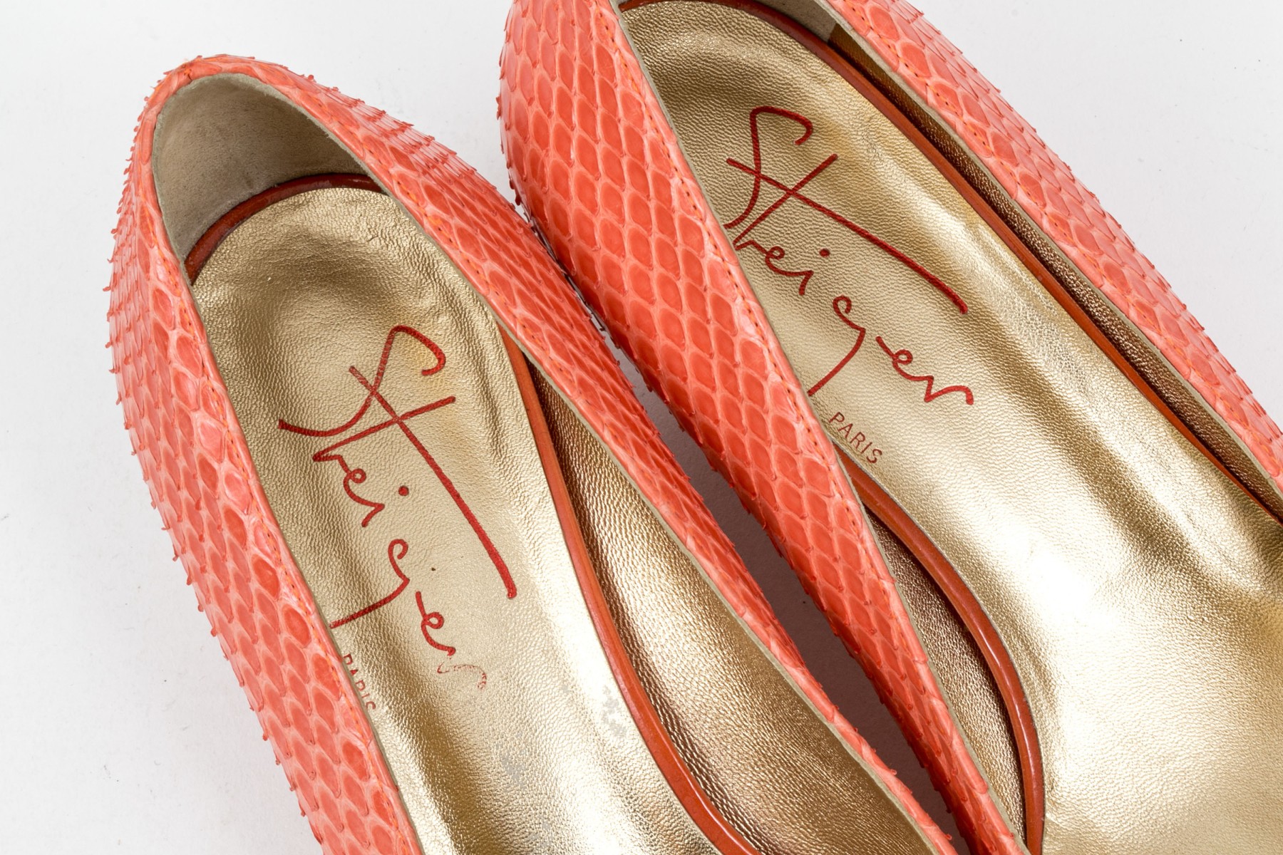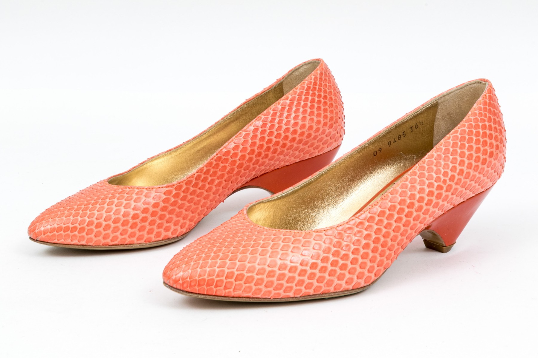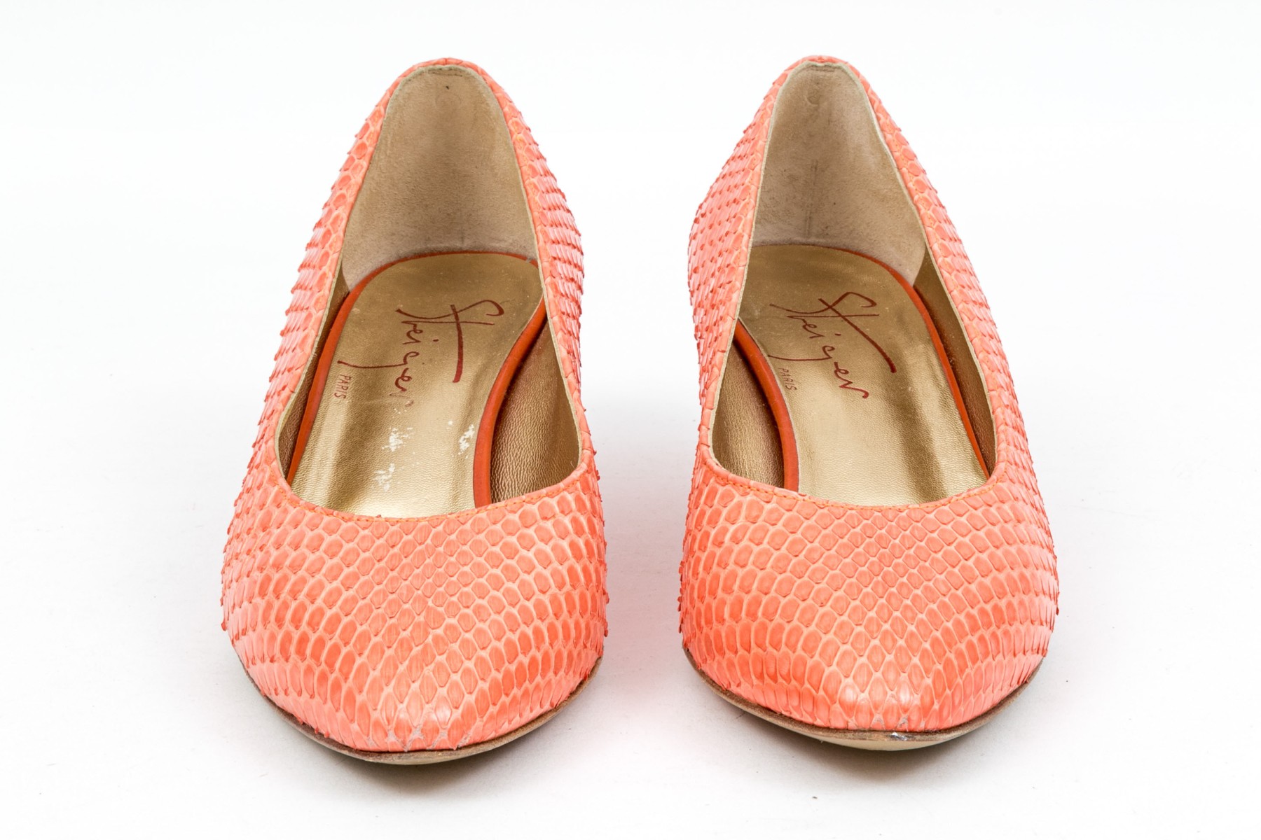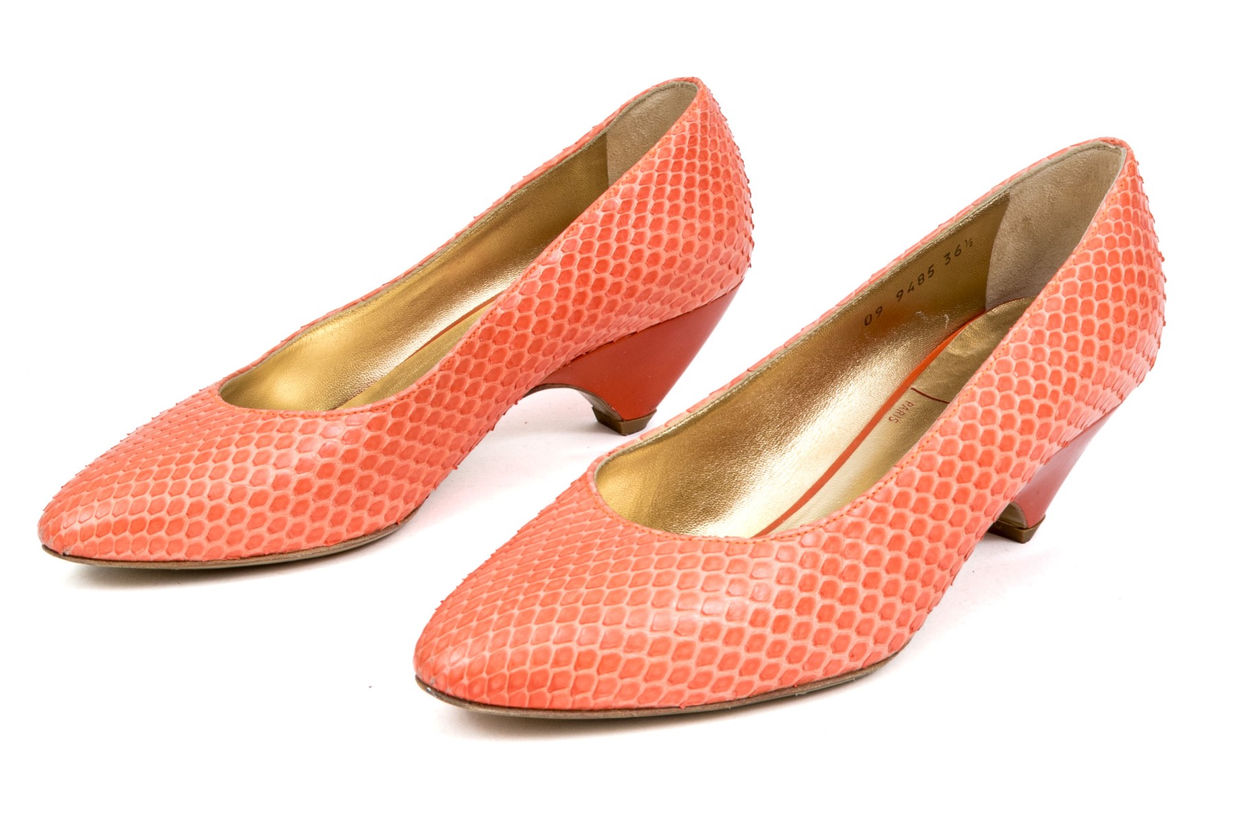 Walter Steiger fun coral snakeskin and orange heeled pumps, size 36 1/2