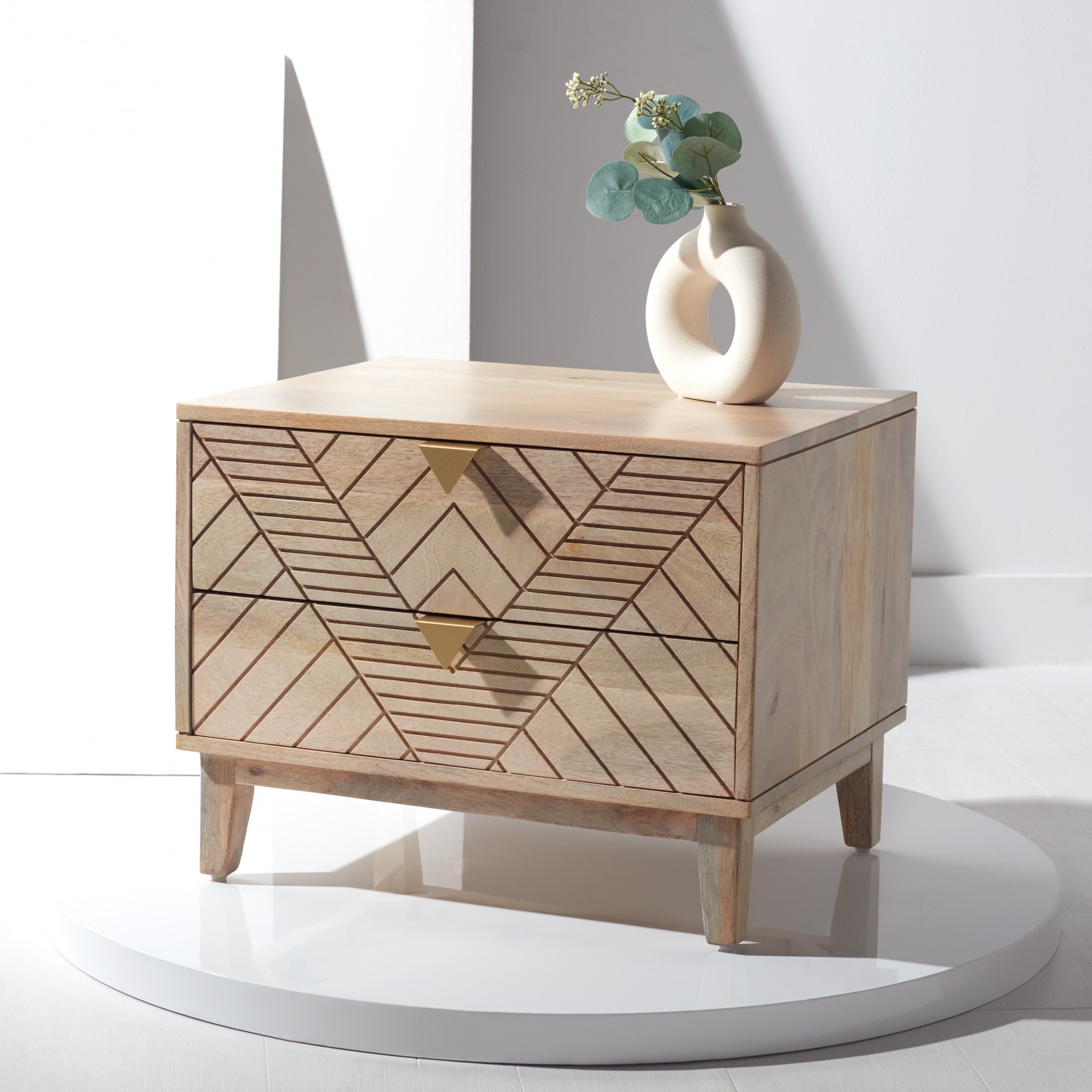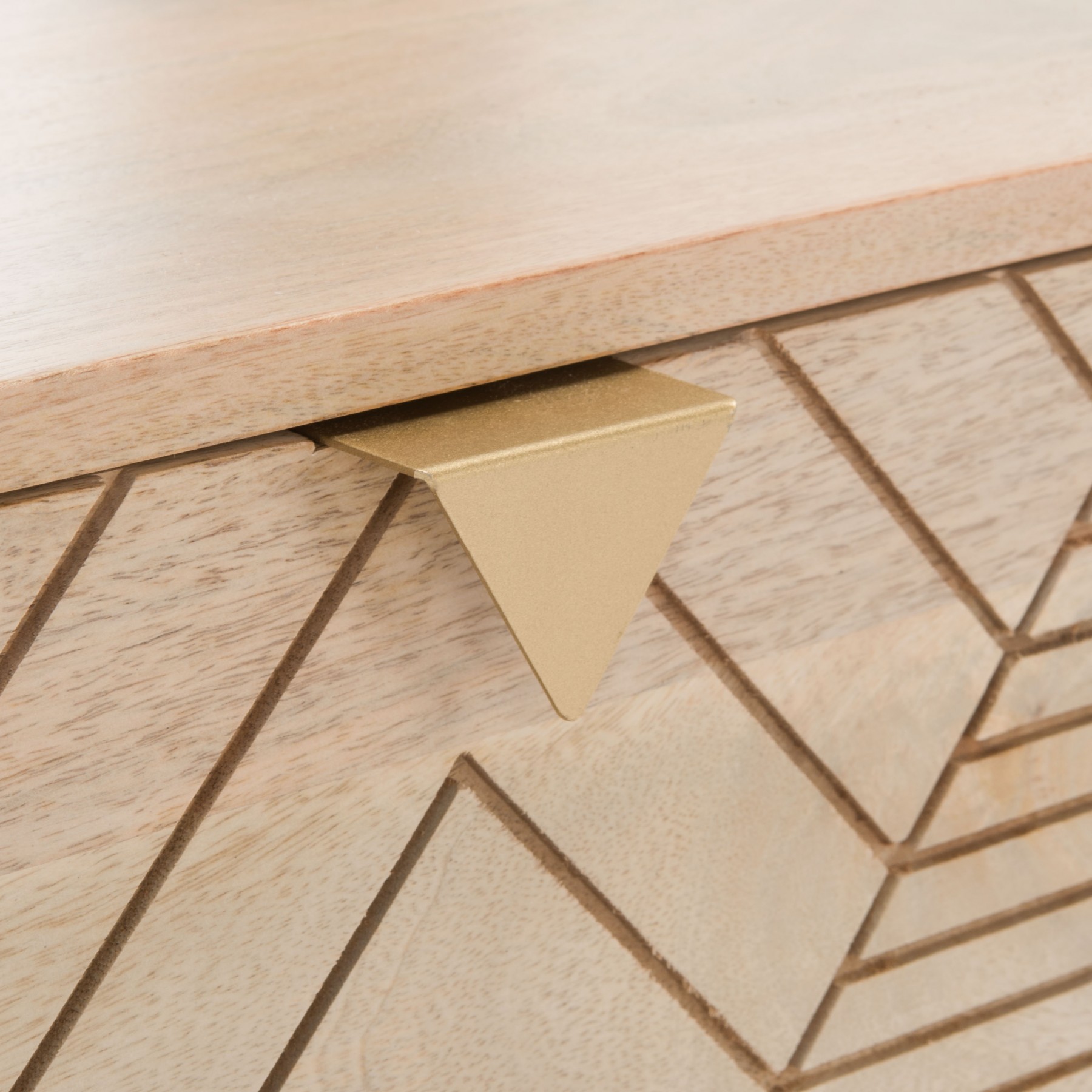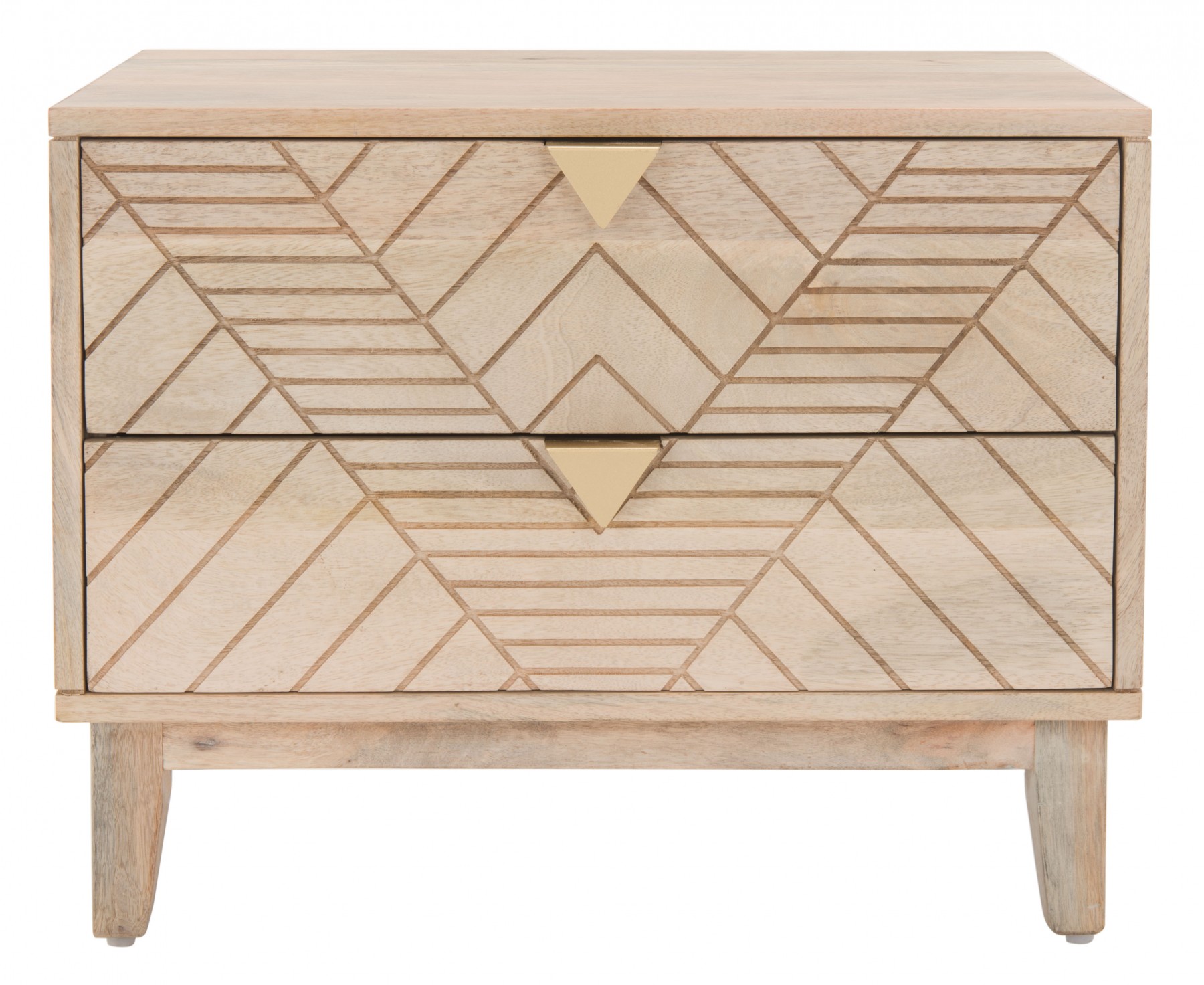 Classic design gets an artistic modern makeover in this stunning Wanda Nightstand. A striking statement piece for any contemporary bedroom, the light brown tone of its stonewashed mango wood creates a perfect canvas for the contrasting chevron overlays on Wanda’s two drawers, while gold half-diamond pulls complete the look with a final glamorous touch.