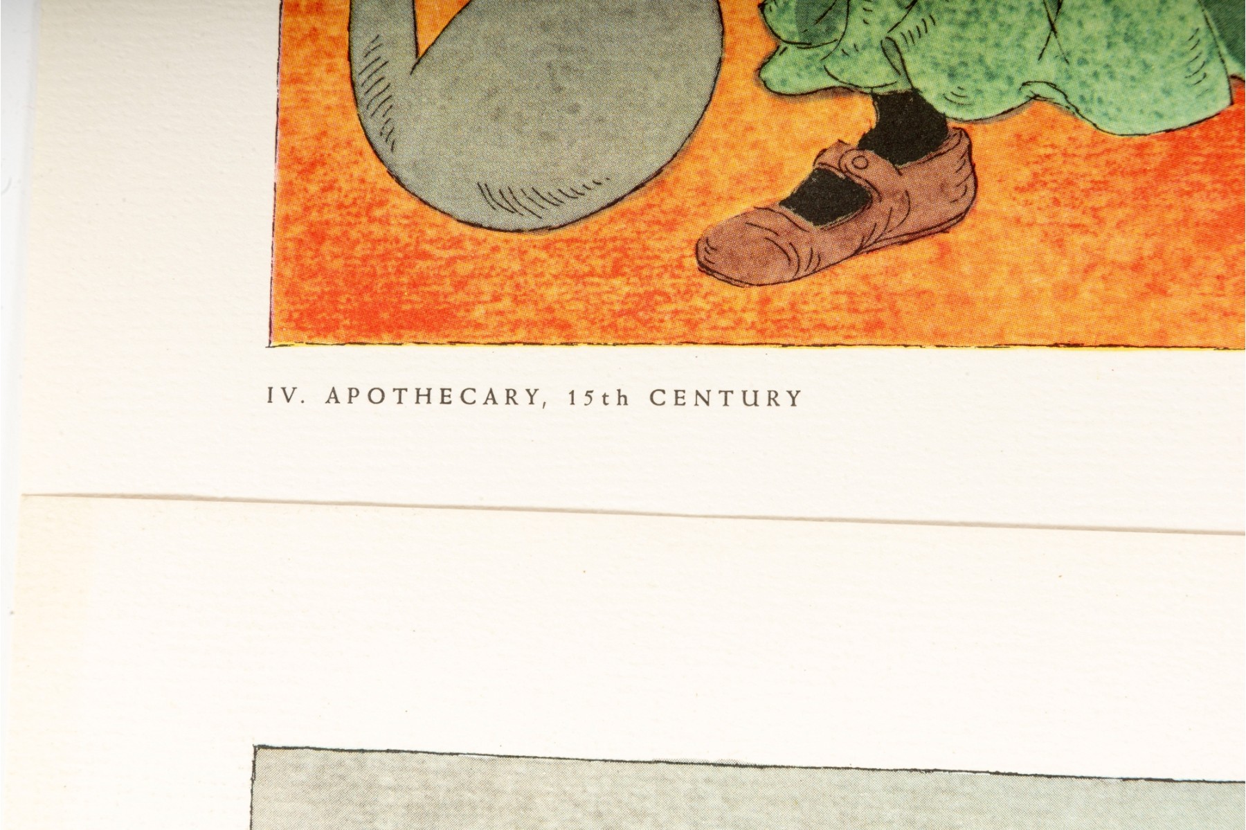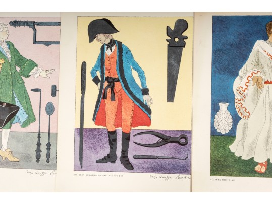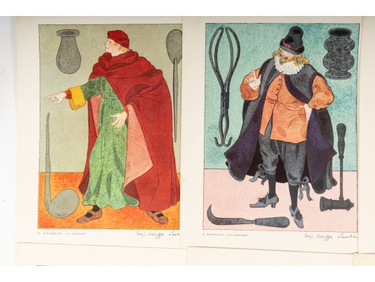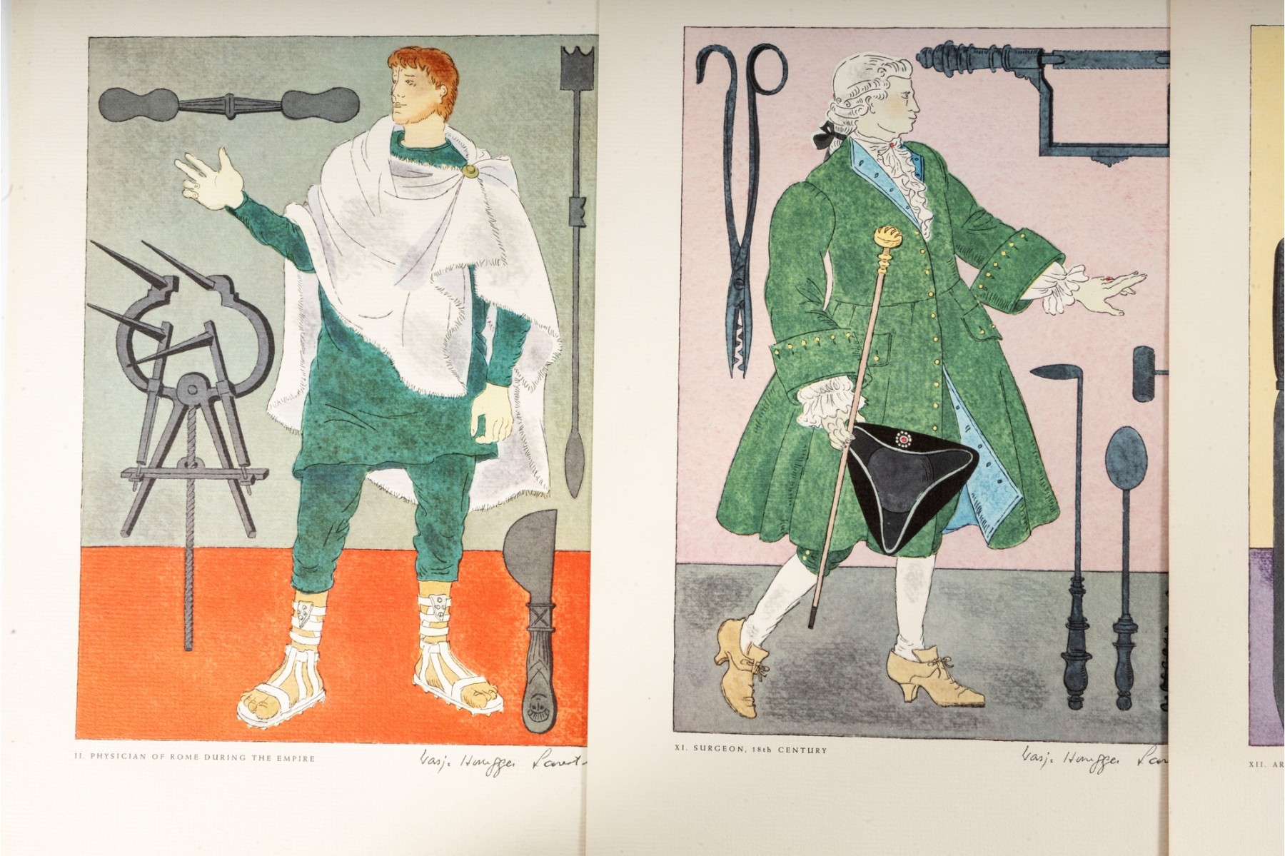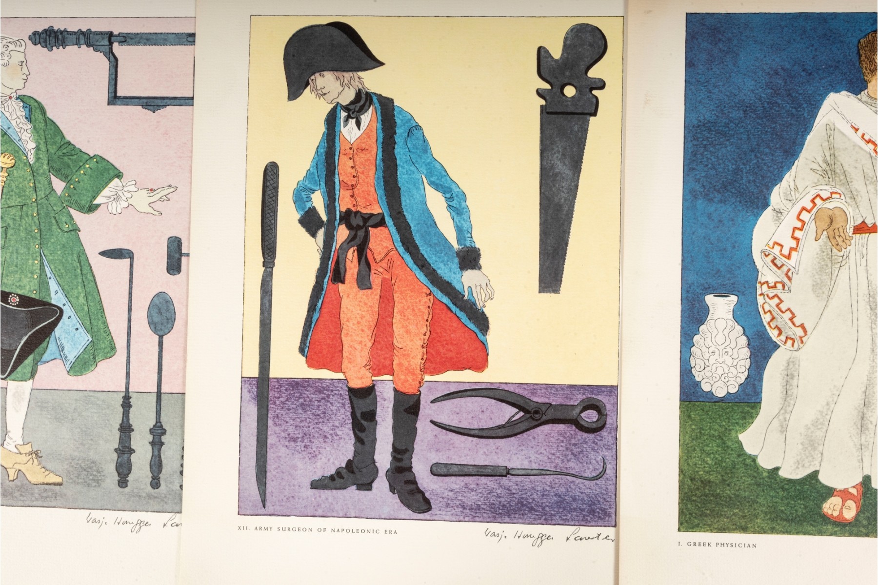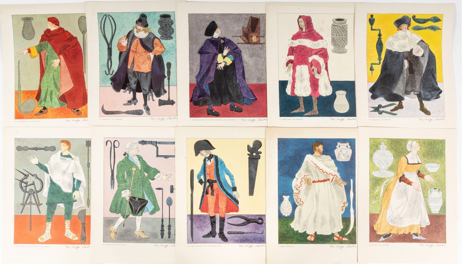 Warja Lavater (Swiss, 1913-2007) complete set of twelve prints depicting figures in medical attire throughout the ages. Each piece is beautifully rendered in full, vibrant color with figures in traditional attire surrounded by instruments they would have used. Presented loose, unframed.