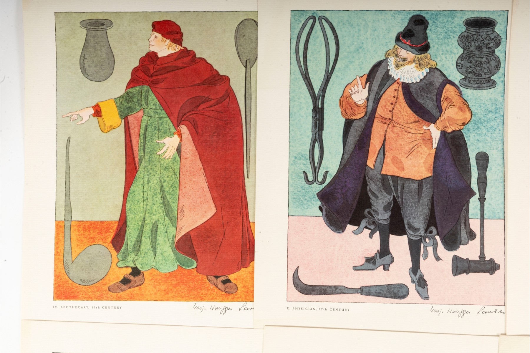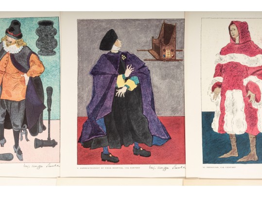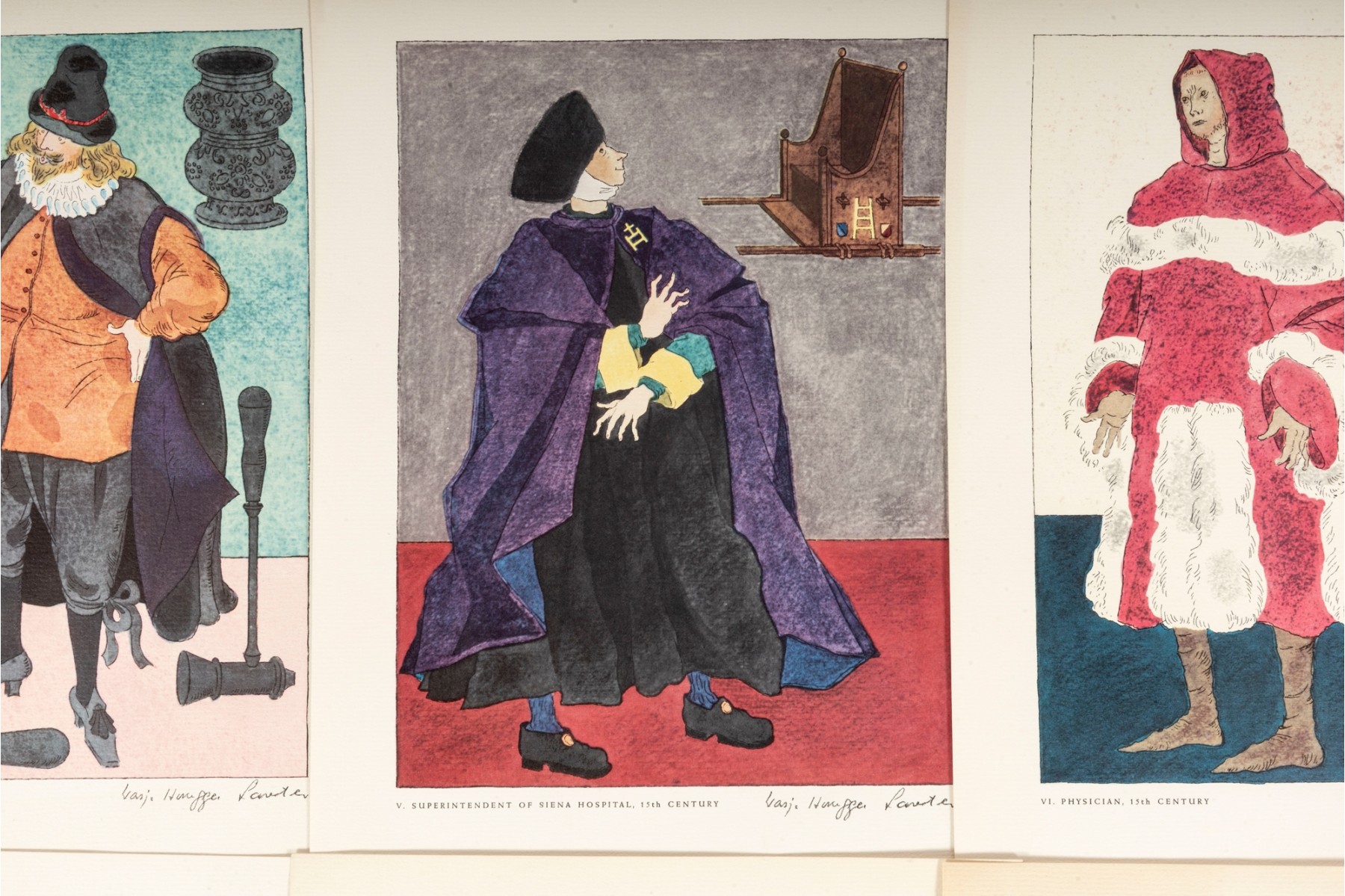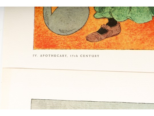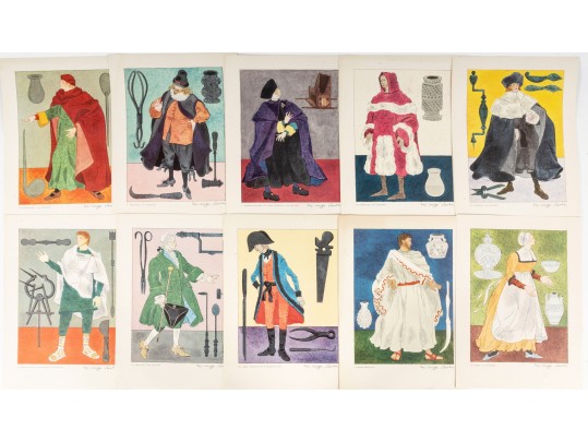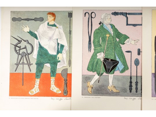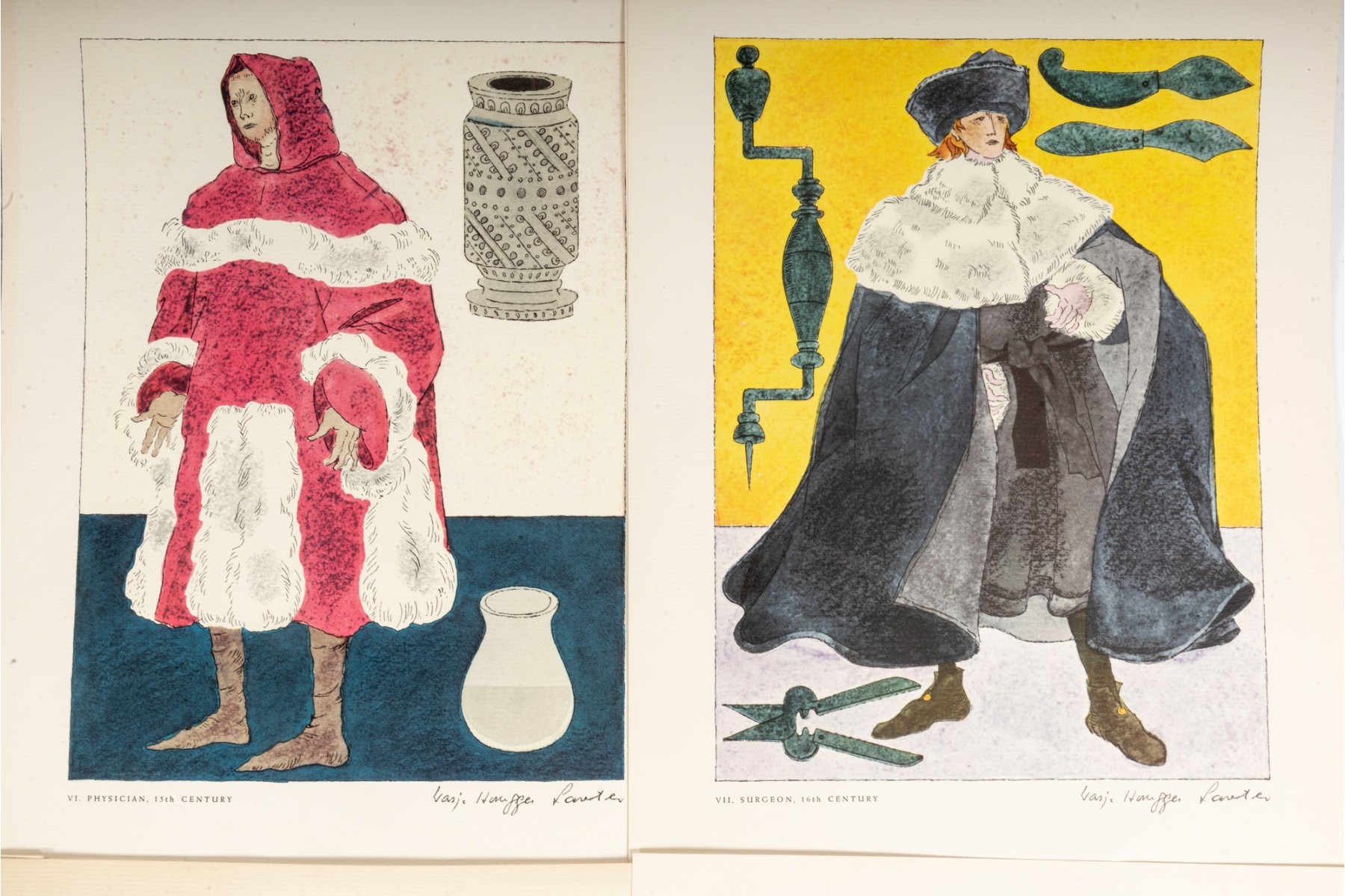 Warja Lavater (Swiss, 1913-2007) complete set of twelve prints depicting figures in medical attire throughout the ages. Each piece is beautifully rendered in full, vibrant color with figures in traditional attire surrounded by instruments they would have used. Presented loose, unframed.