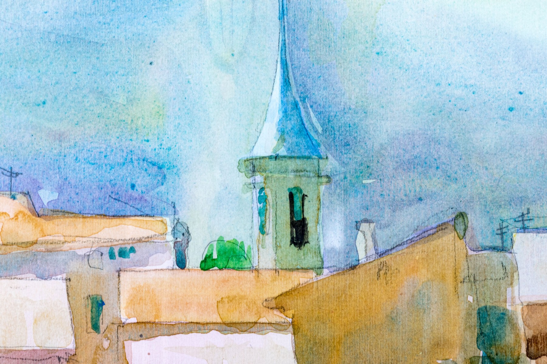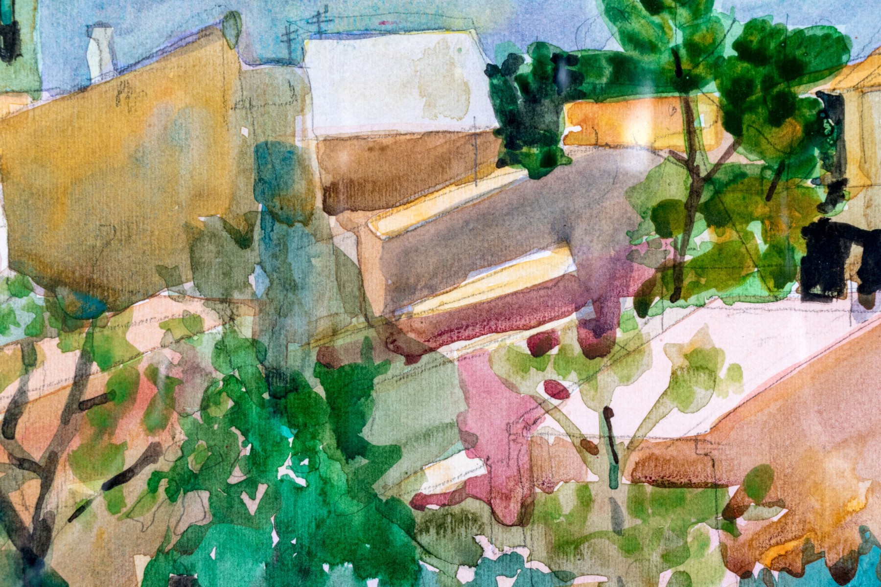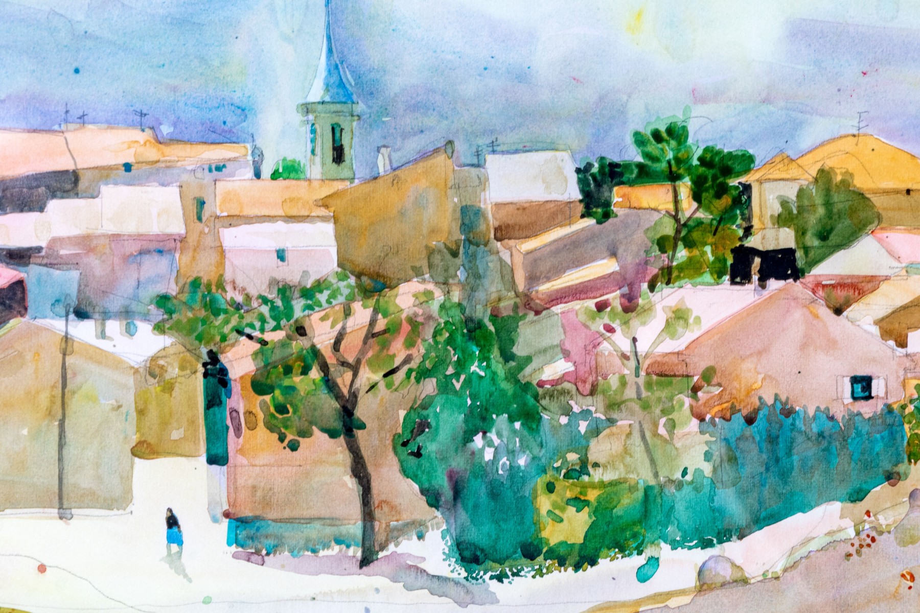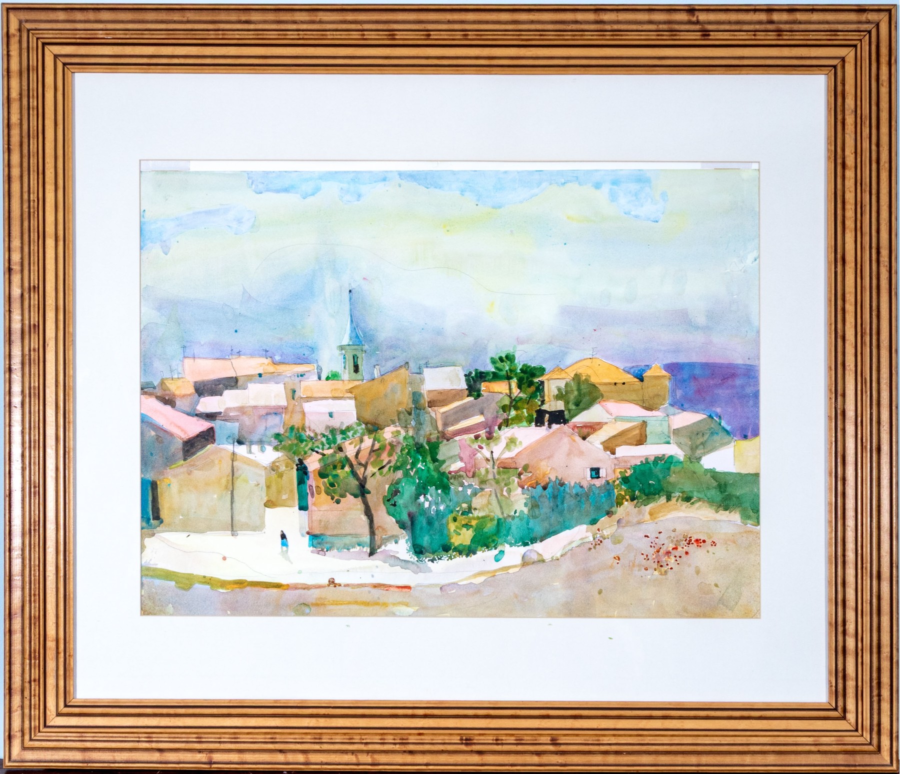 A wonderful watercolor painting on paper depicting a village landscape with the coast and sea in the background. Beautifully detailed with a relaxing impressionist style incorporating vibrant, nicely varied colors. Appears to be unsigned.