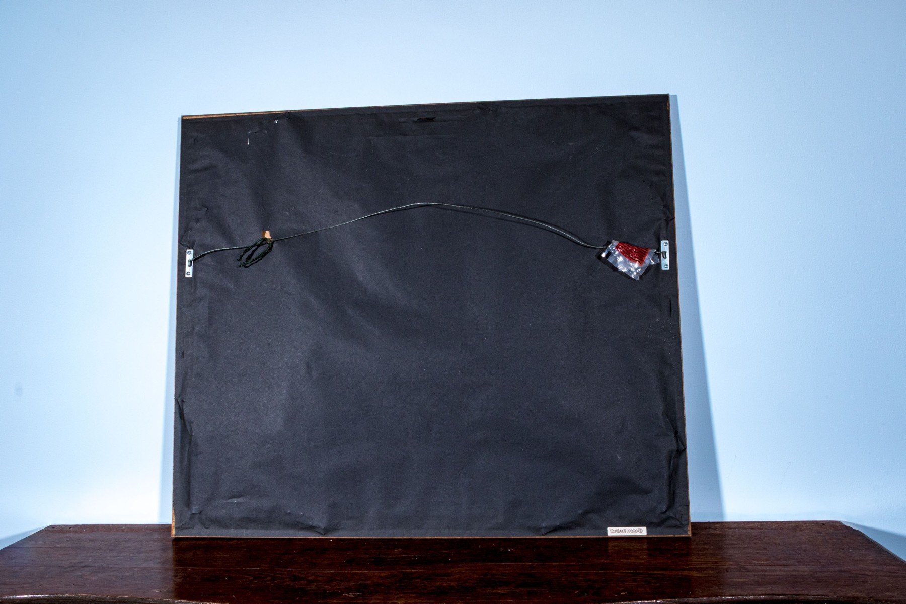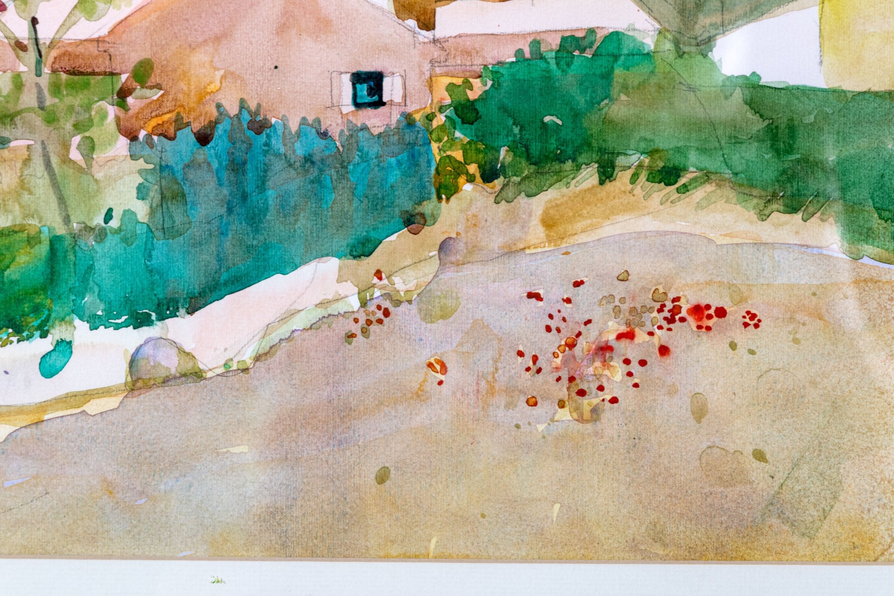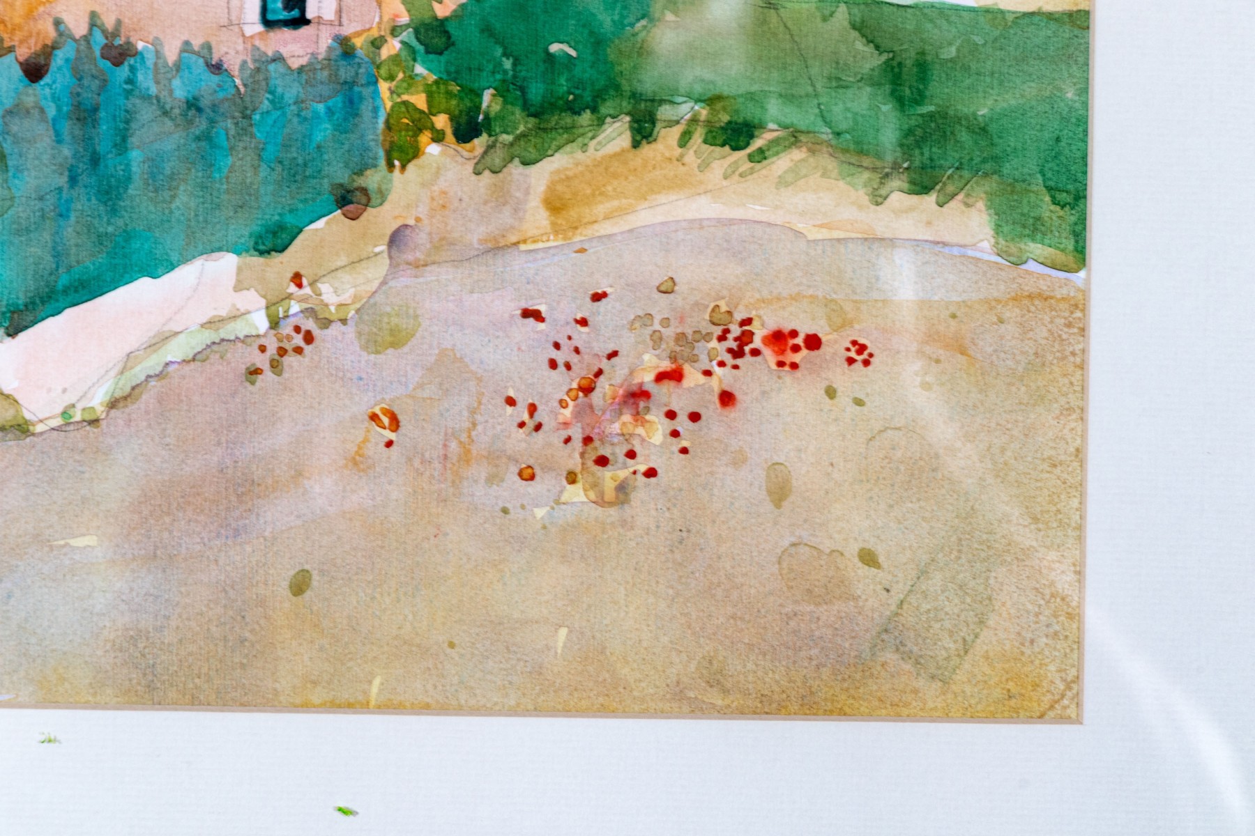 The painting has slipped in its frame and is not perfectly lined up with the mat leaving a 1/2" space between the top of the painting and trim of the upper mat, but otherwise the painting presents wonderfully.