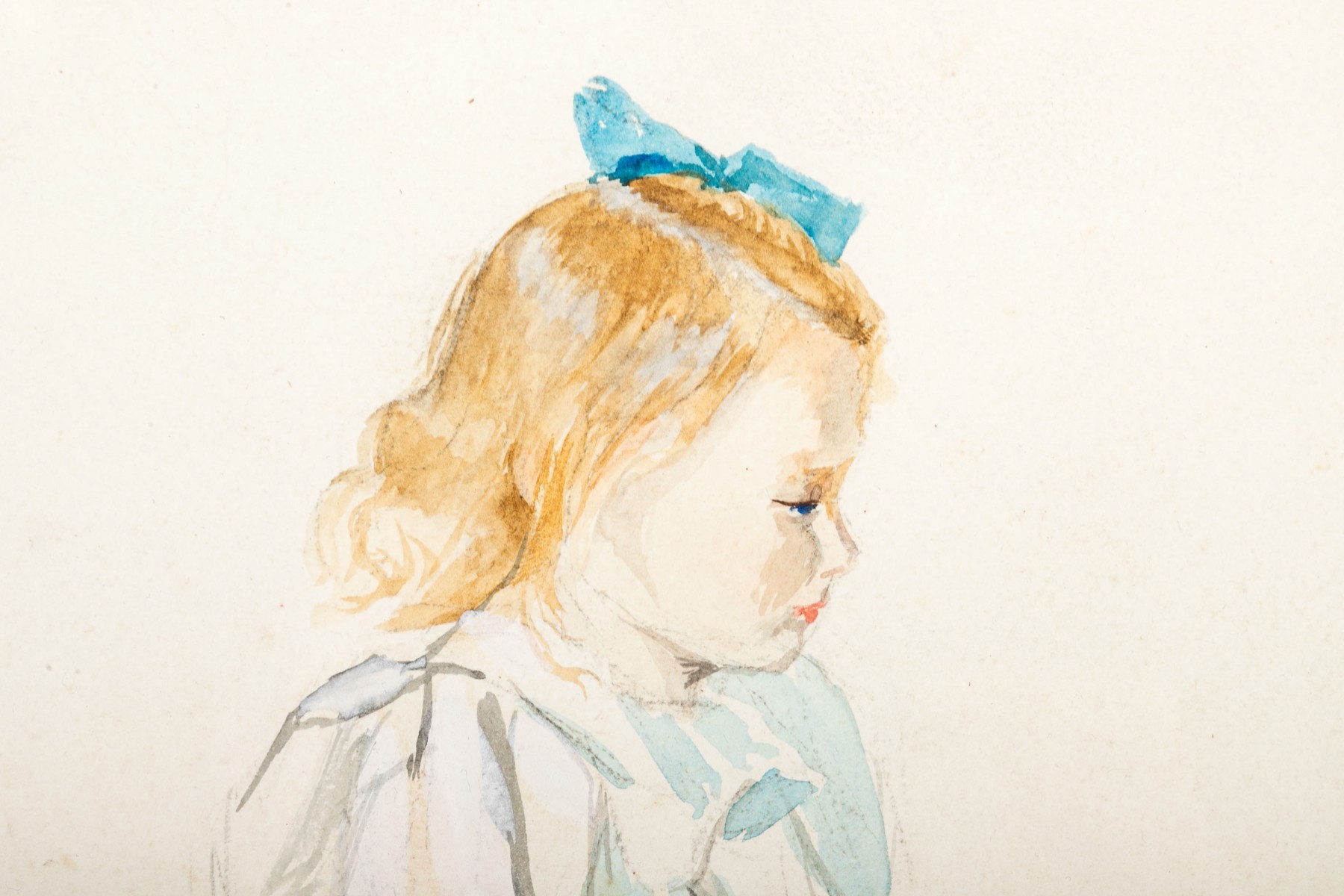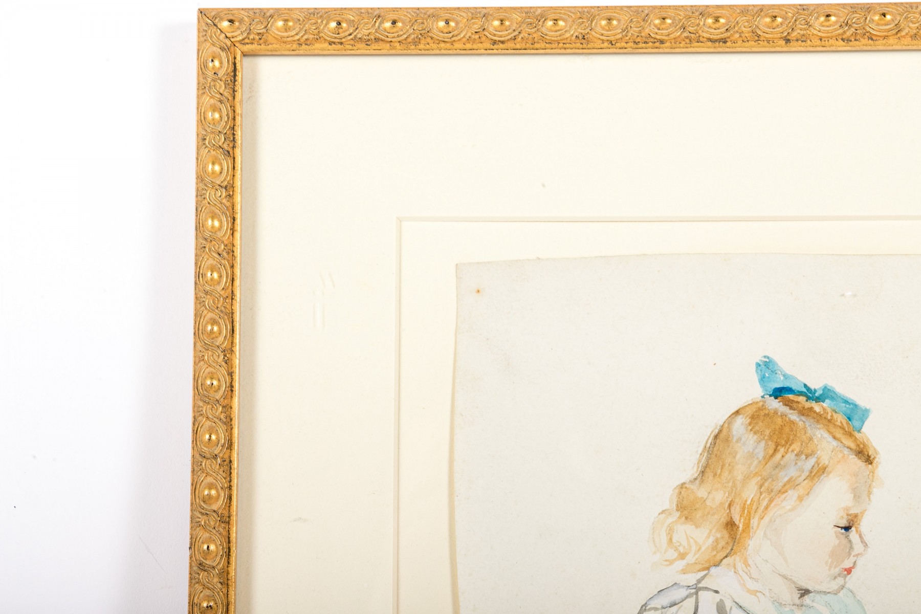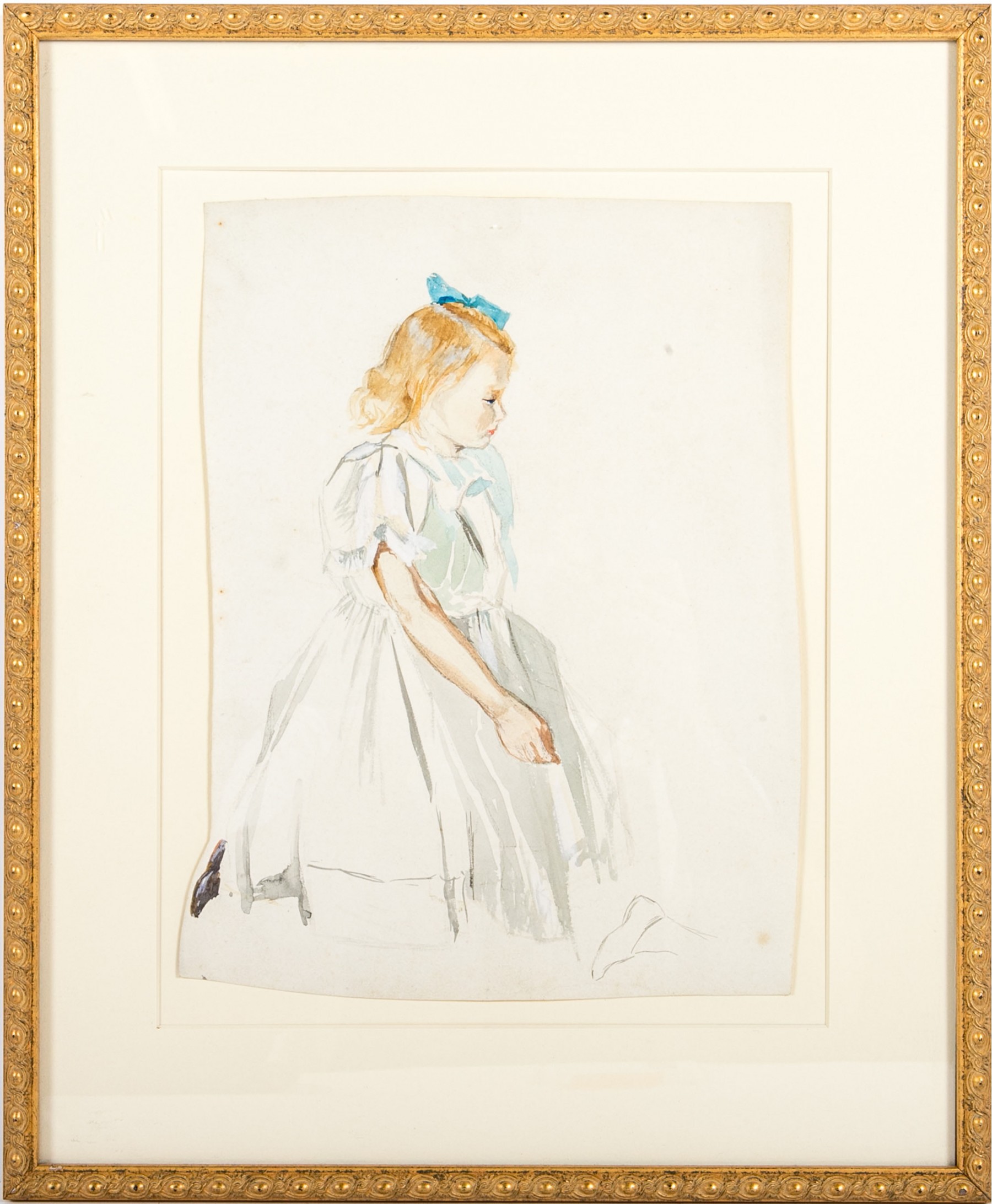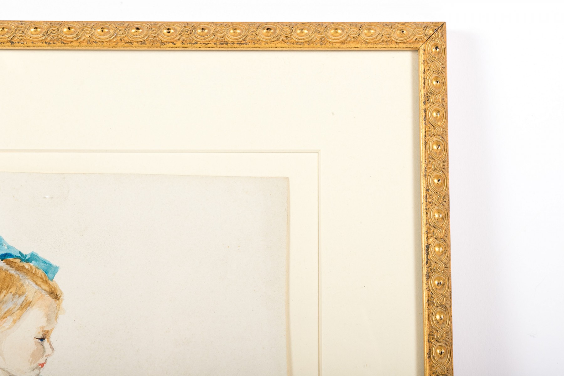 A lovely watercolor painting on paper depicting a young blonde girl wearing a white dress and a blue bow, kneeling against a white background. Unsigned. The paper is mounted to a white background, displayed behind glass with a white mat, in a gilt frame with fine twisting egg and dart-styled relief.