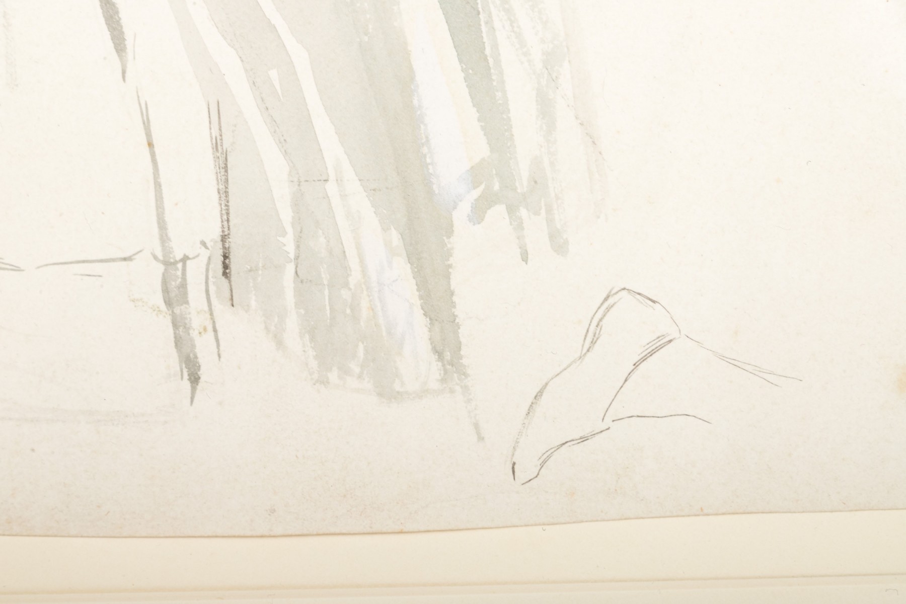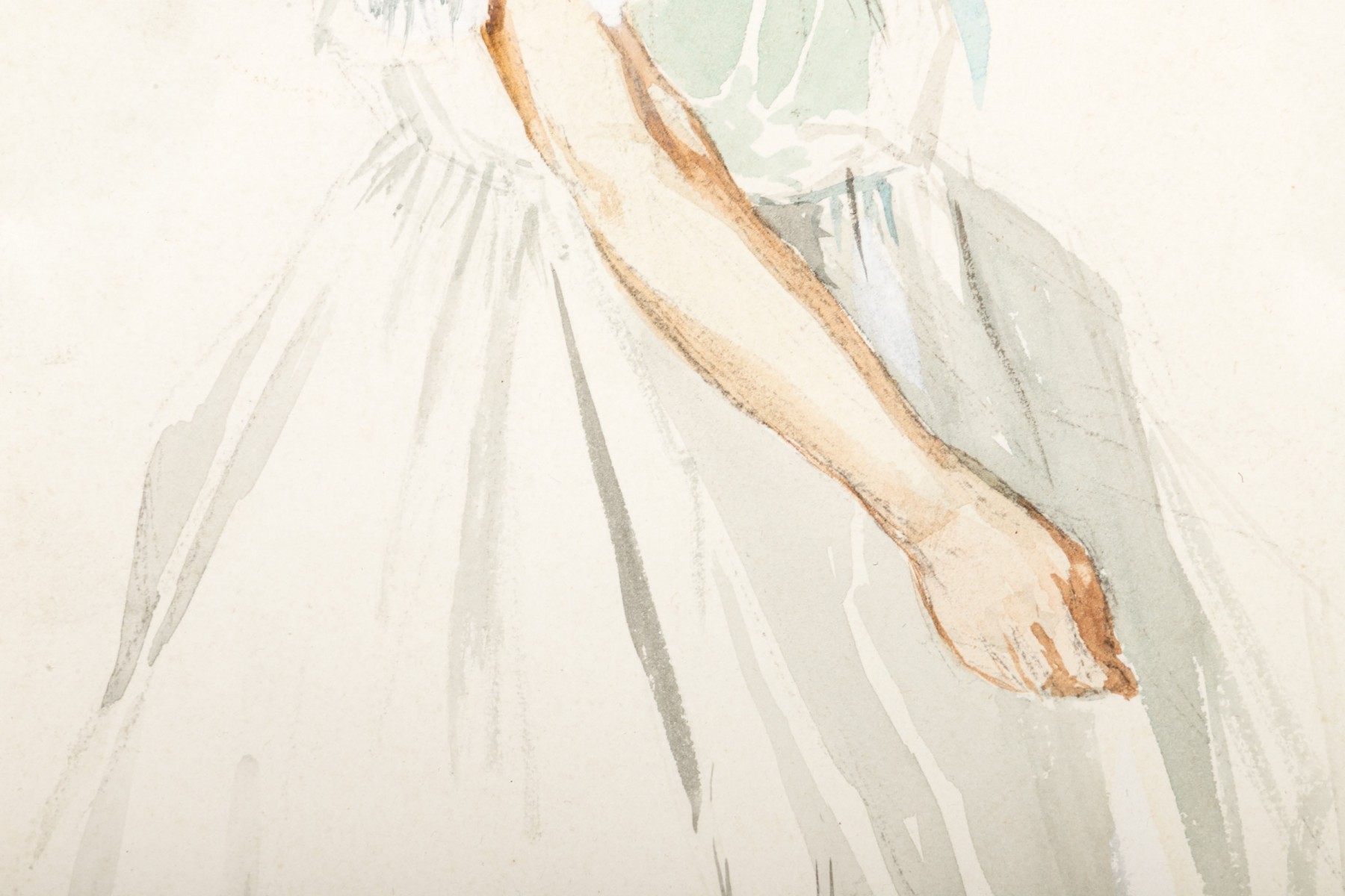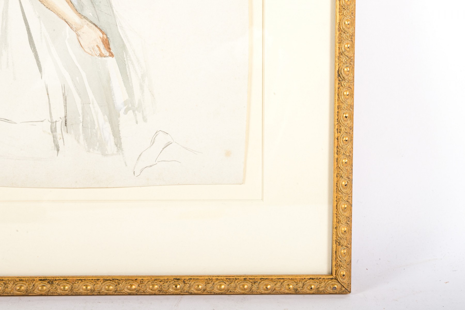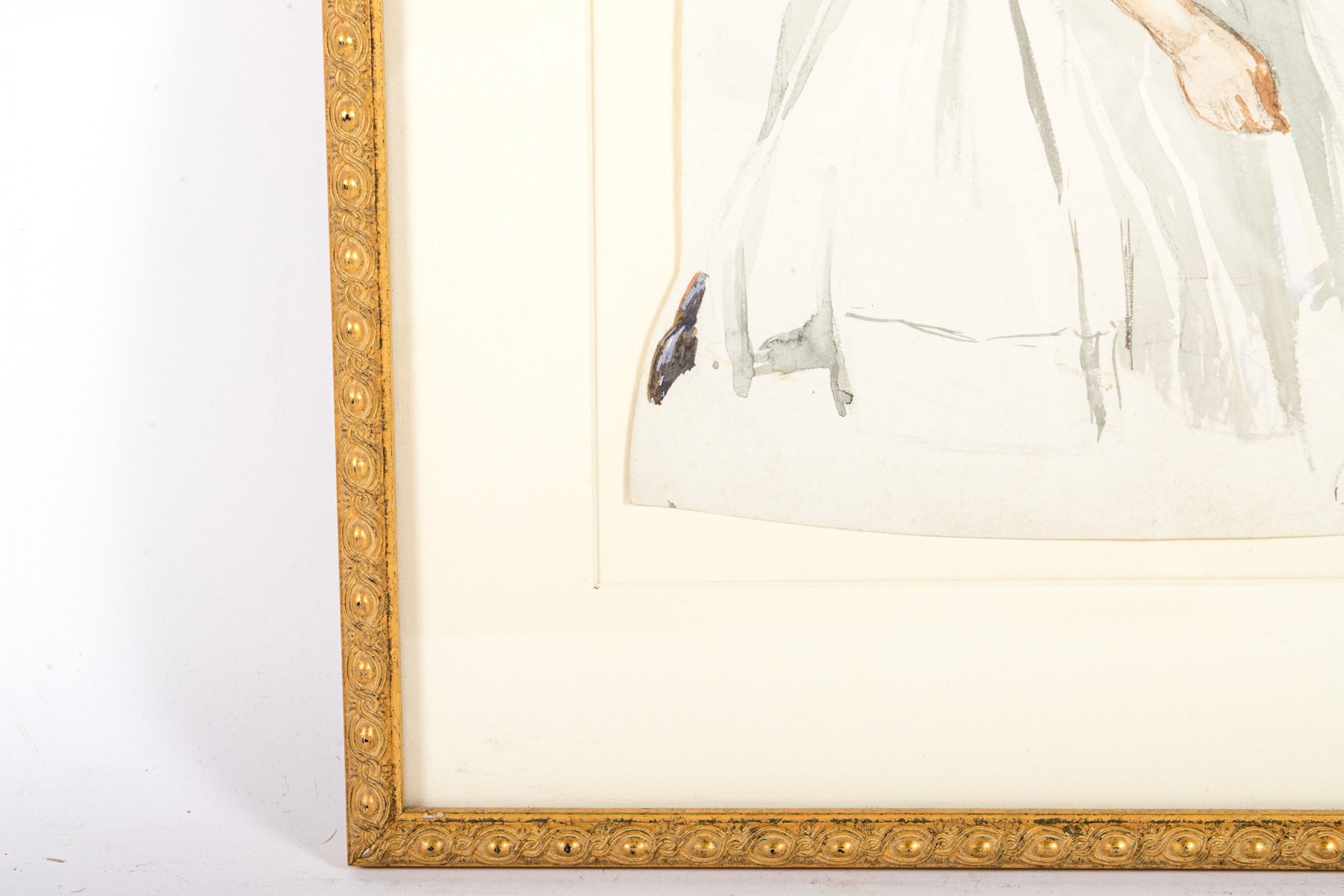 A lovely watercolor painting on paper depicting a young blonde girl wearing a white dress and a blue bow, kneeling against a white background. Unsigned. The paper is mounted to a white background, displayed behind glass with a white mat, in a gilt frame with fine twisting egg and dart-styled relief.