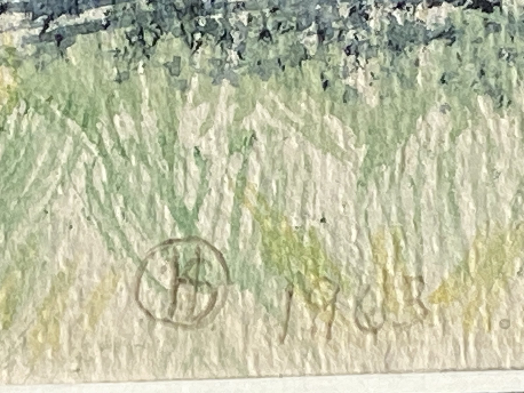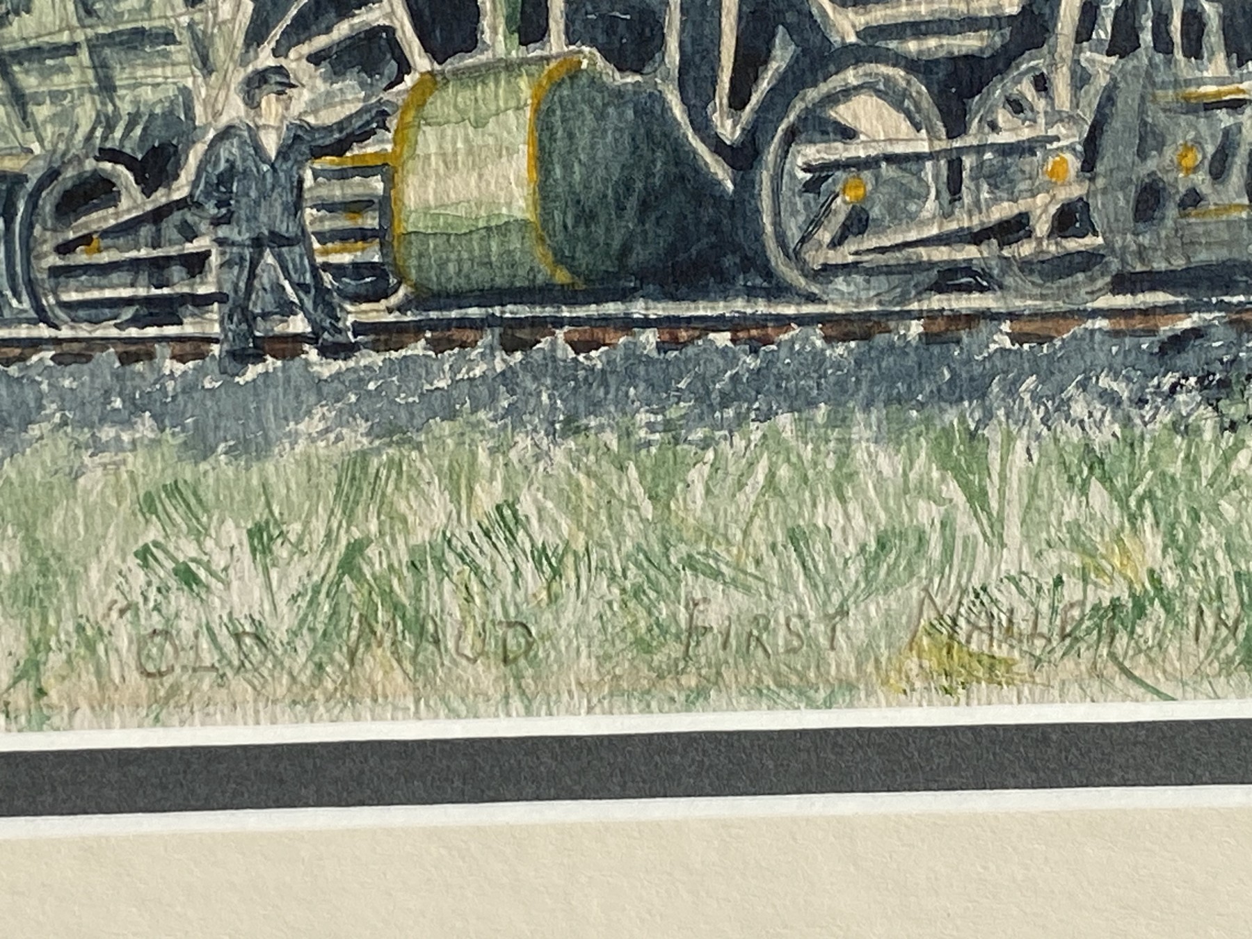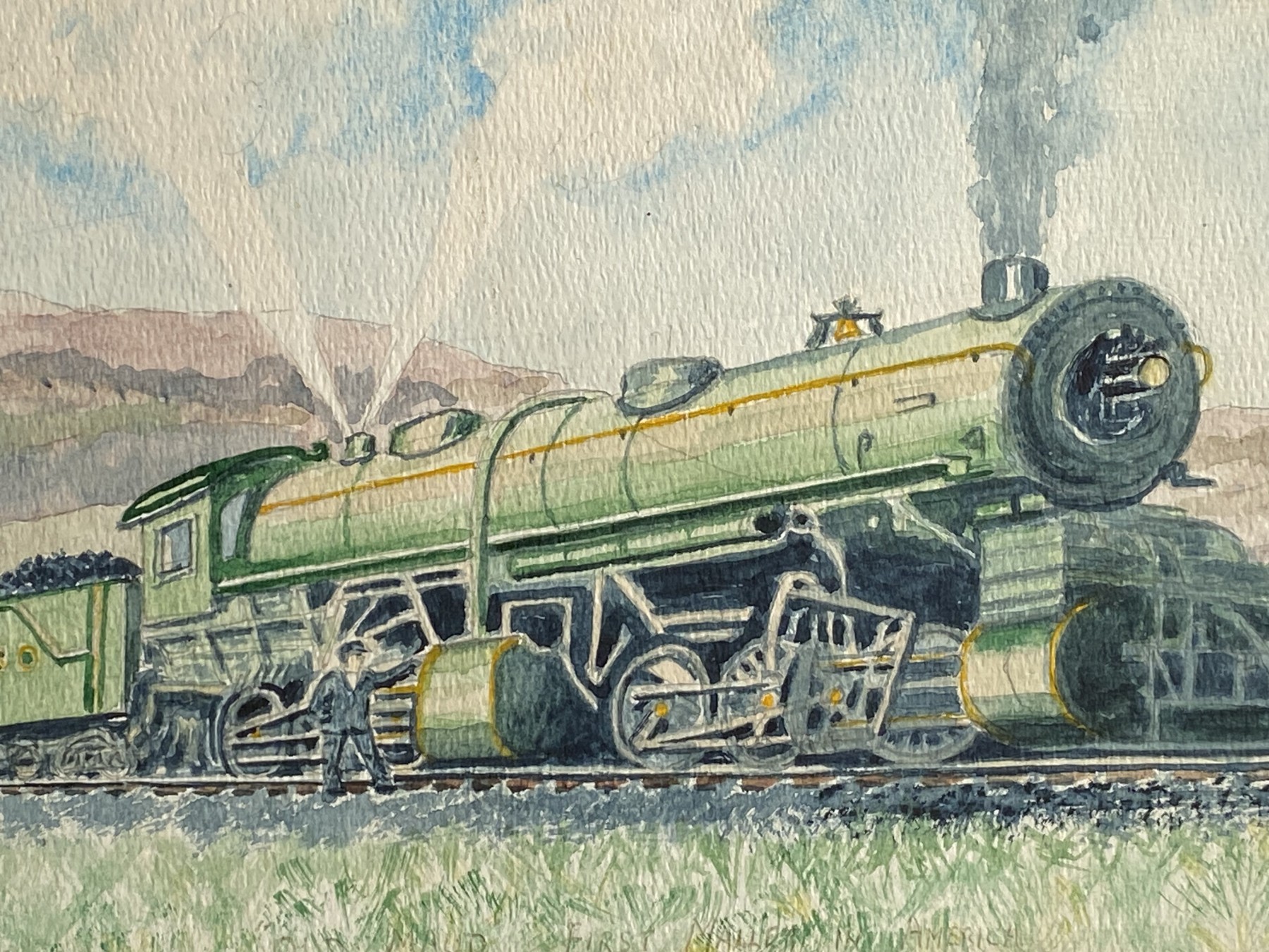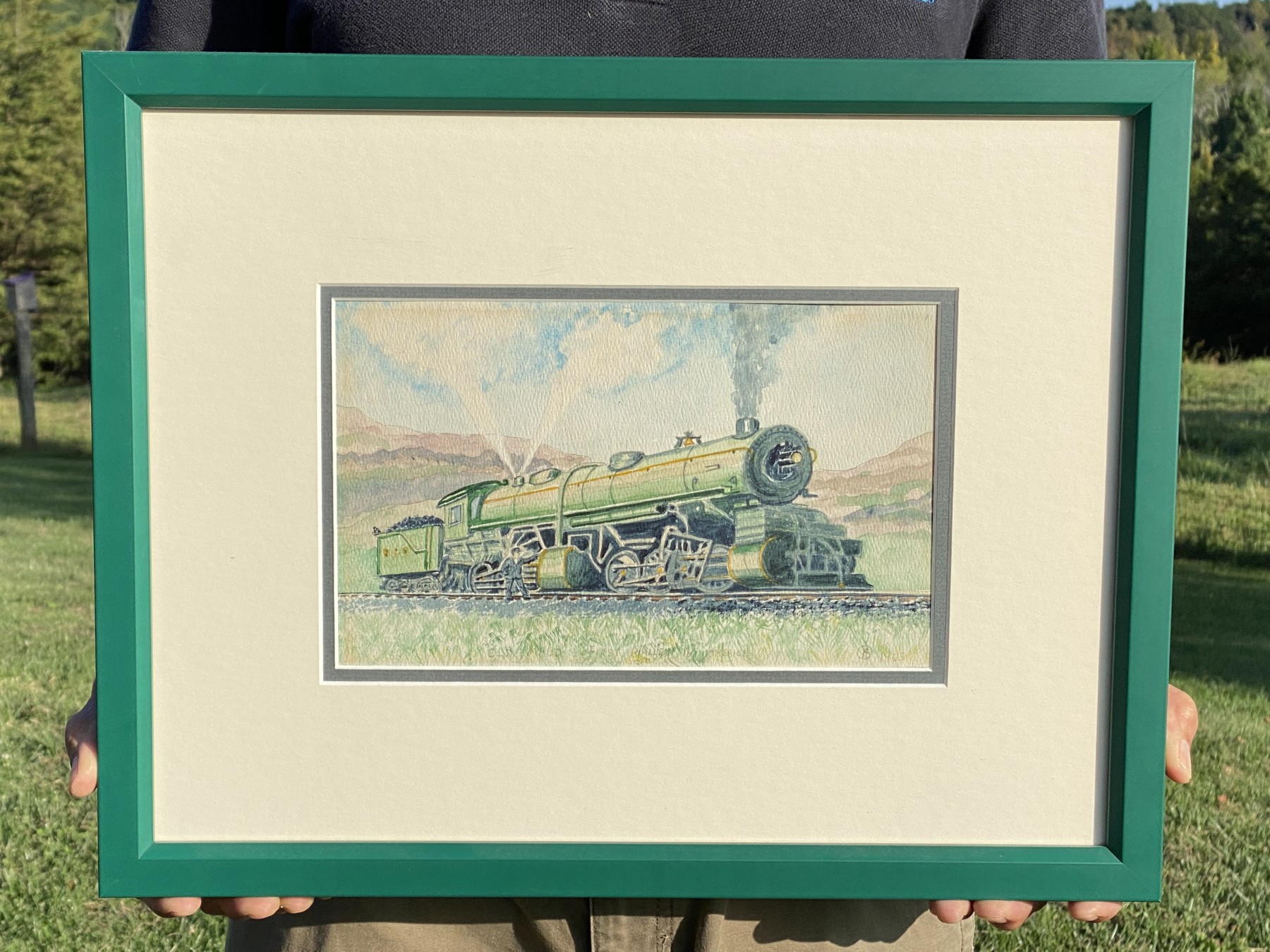 A wonderful watercolor painting depicting a steam engine train moving throughout a lush green American landscape. Initialed signature and date 1963 lower right.