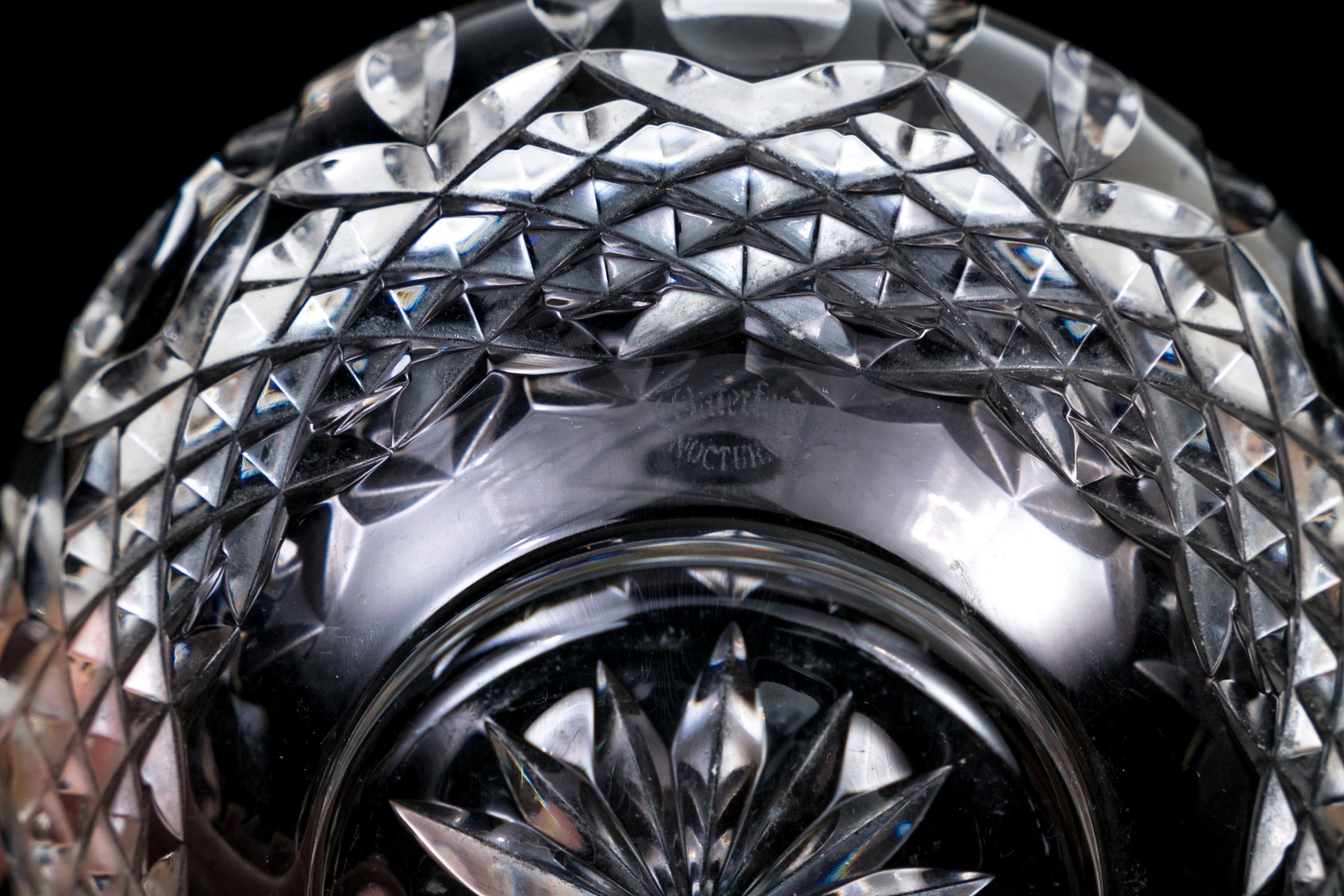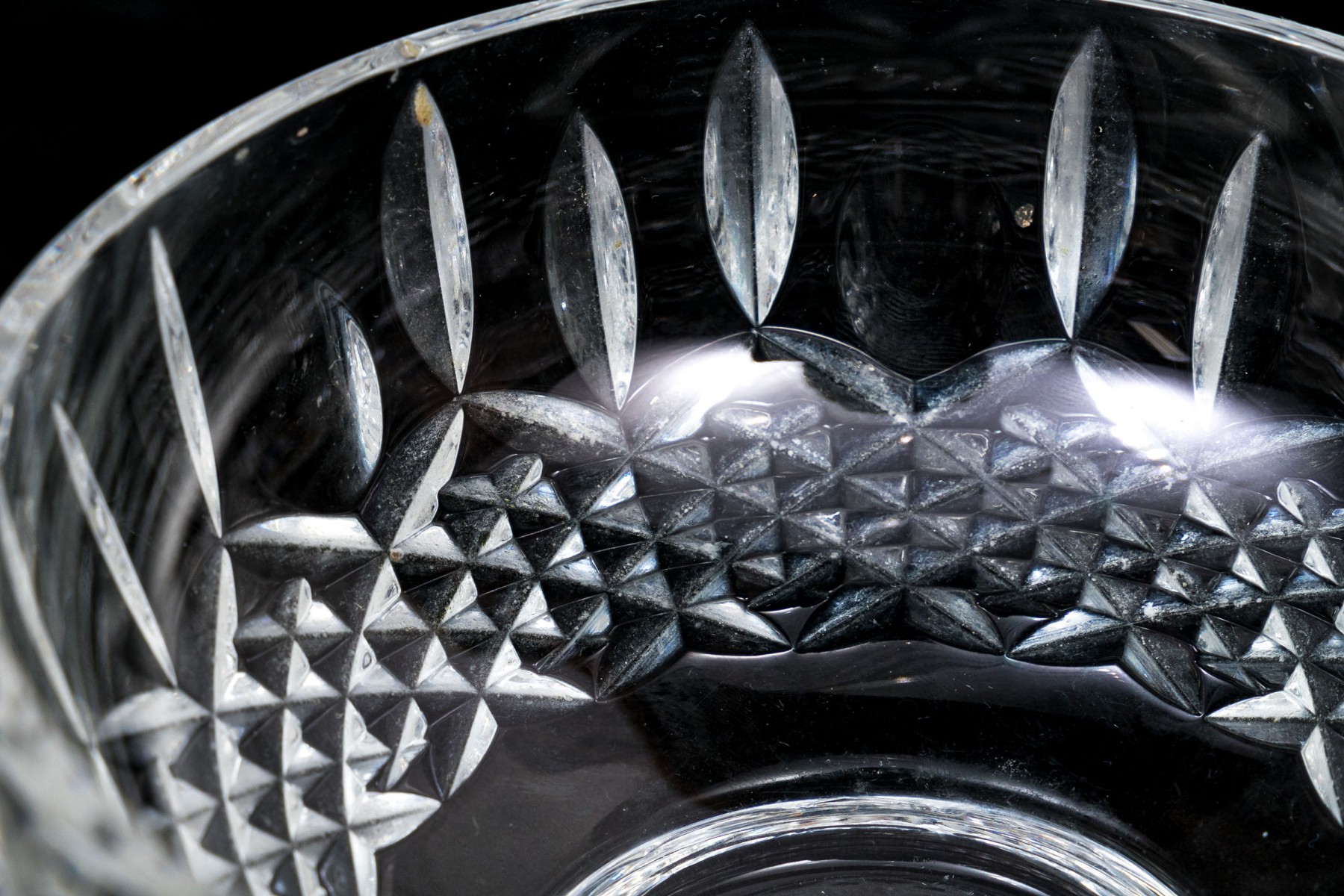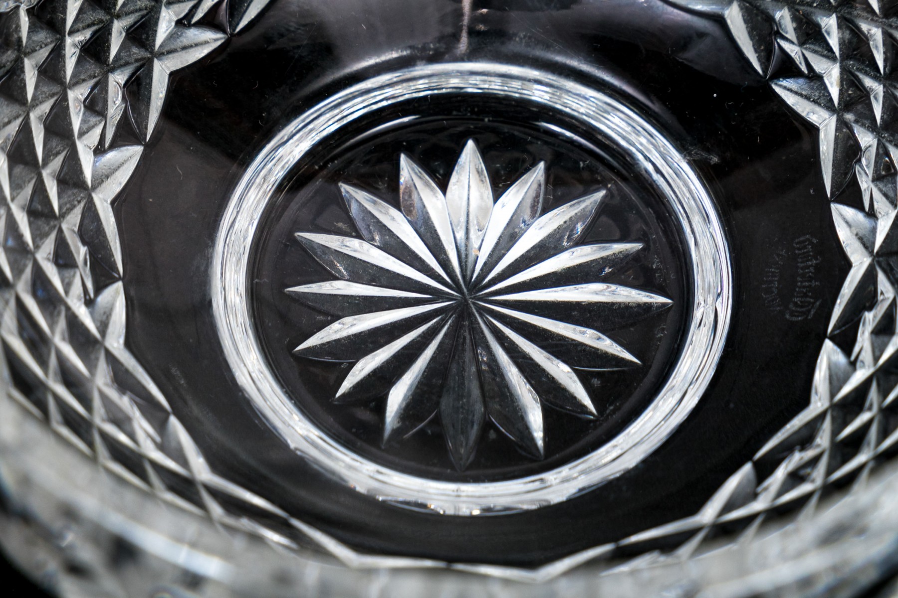 A heavy crystal bowl with vertical cuts over a diamond pattern and a sunburst base.