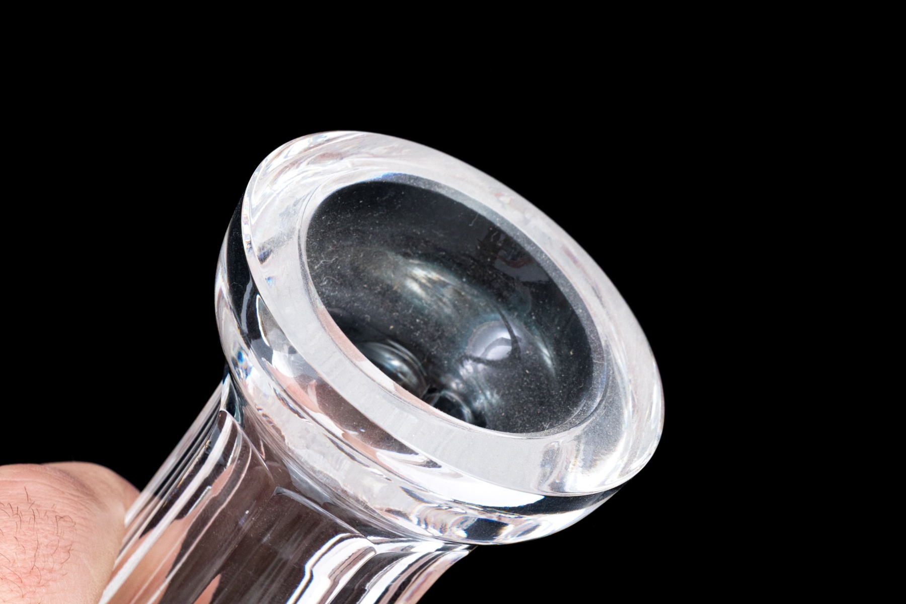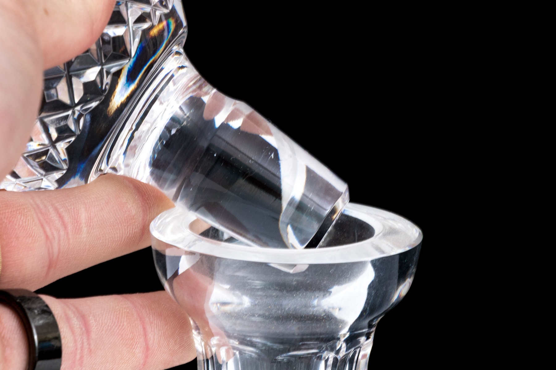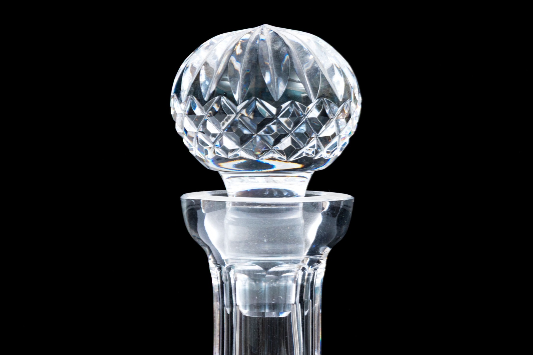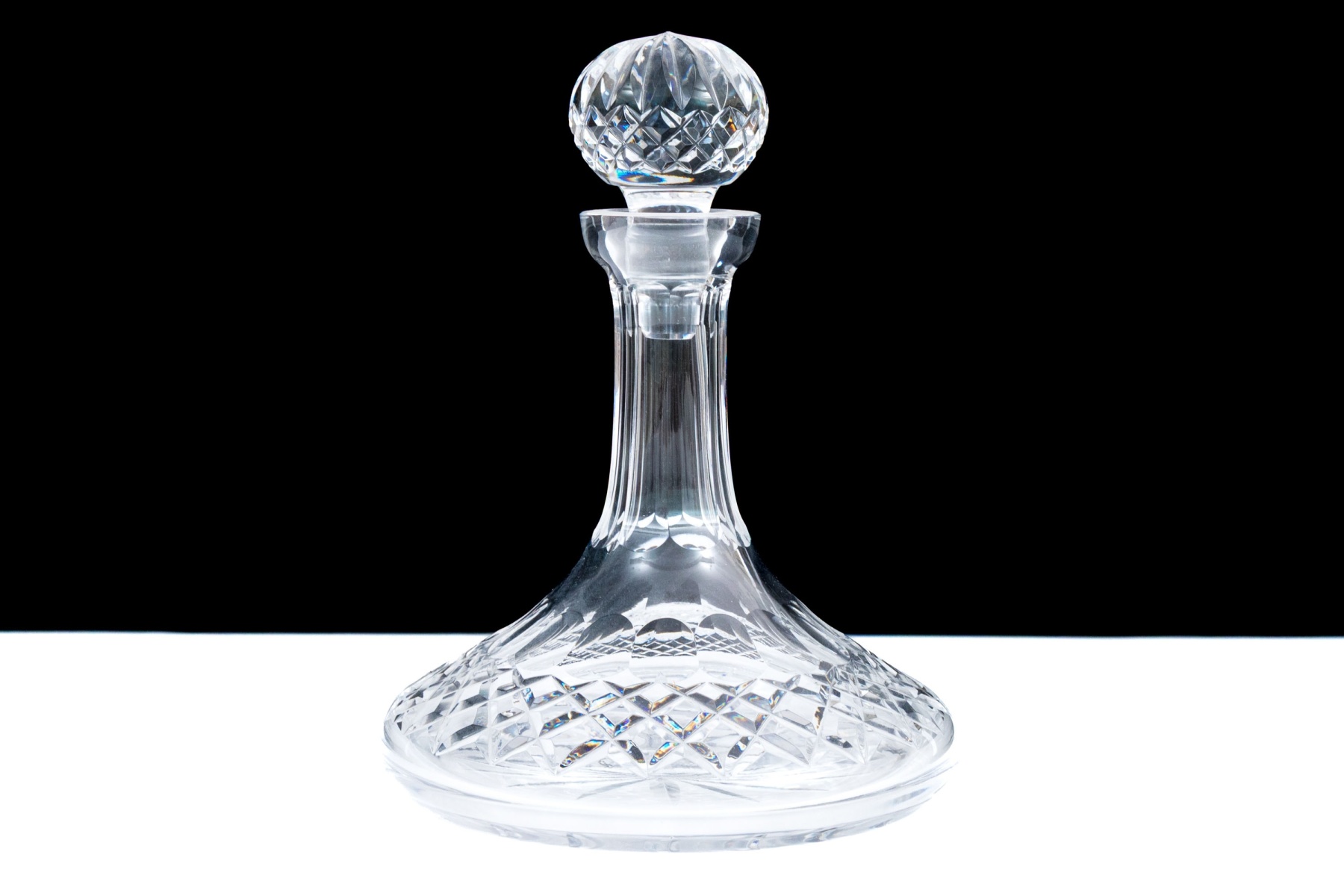 A handsome Waterford crystal ships decanter showcasing a large, elegantly cut spherical stopper fitting within a wide rim mouth leading to a tall, gently tapering and fluted neck expanding to a wide and flattened disc form boy with cut lattices that catch the light beautifully.