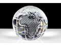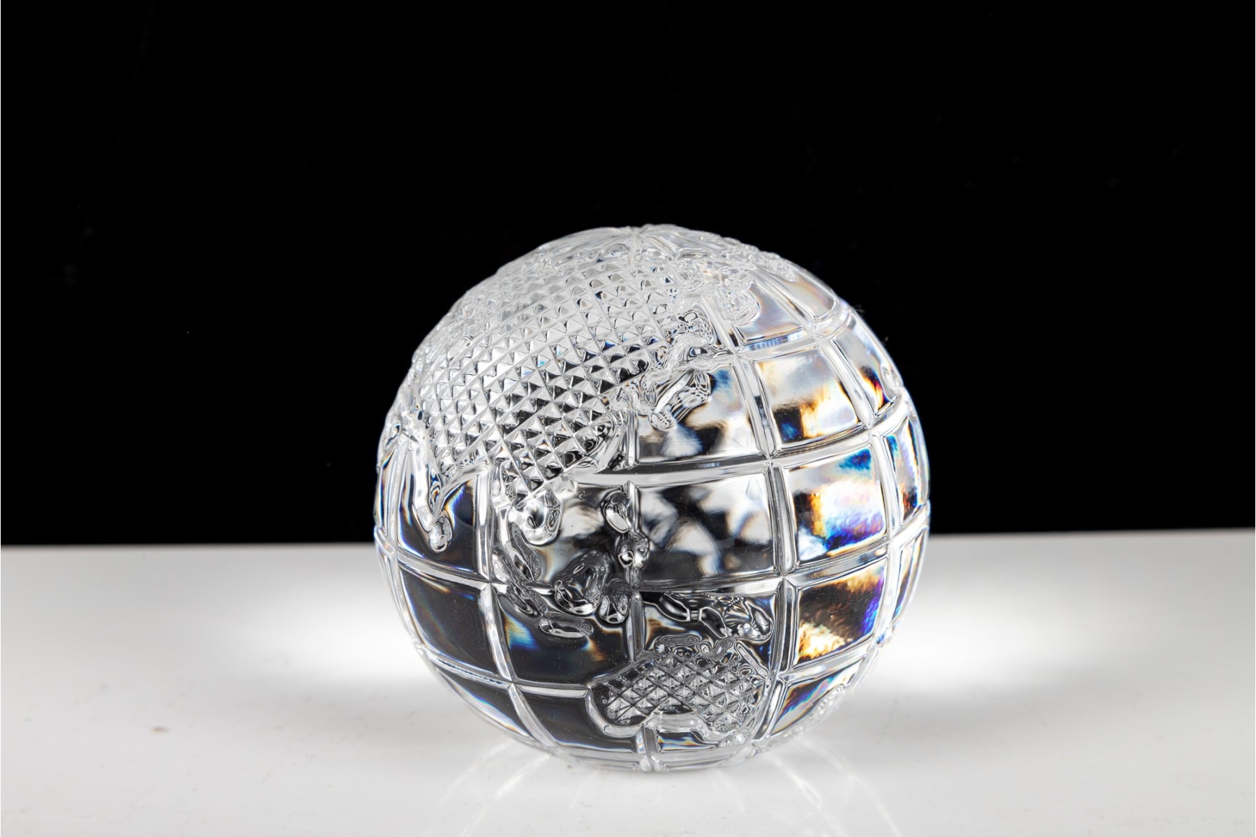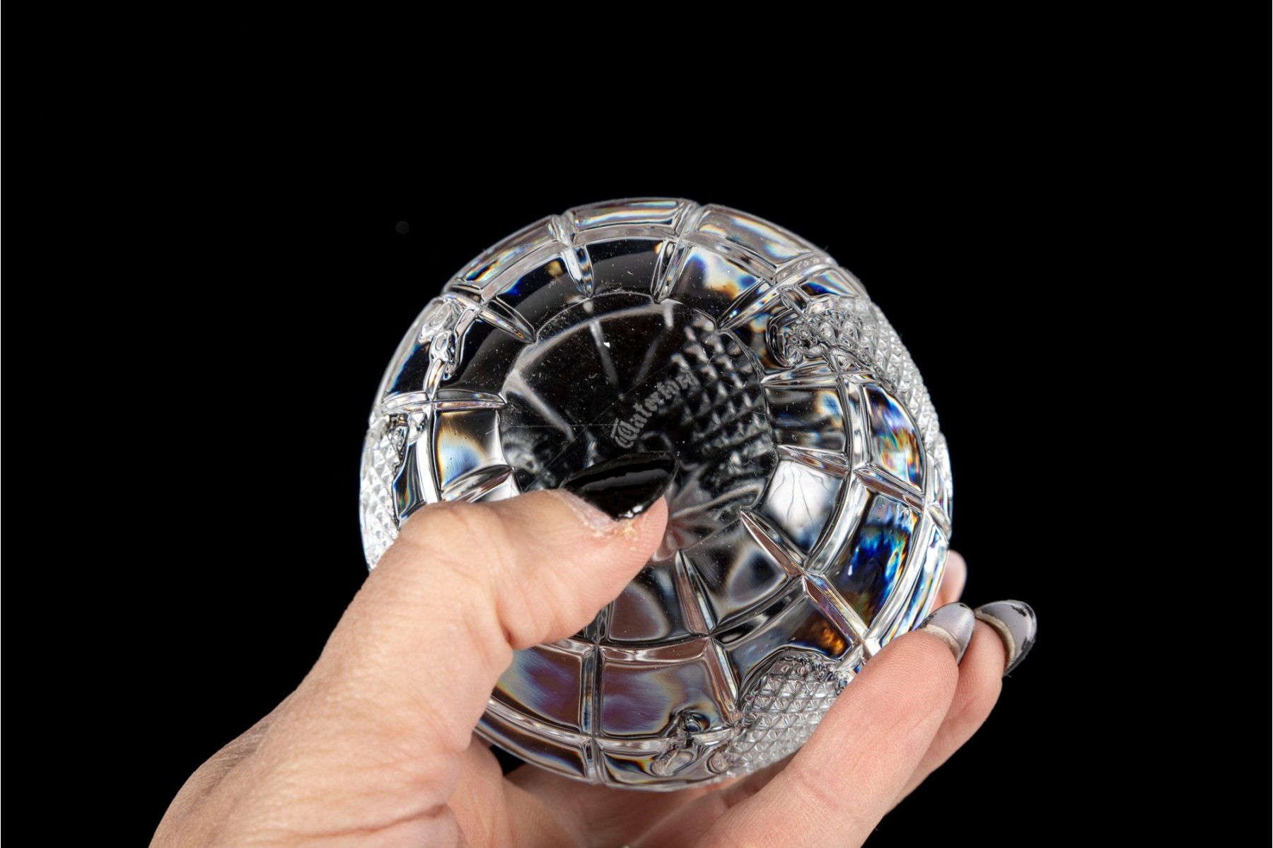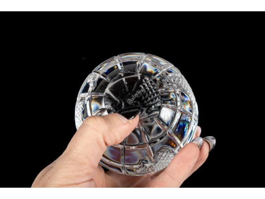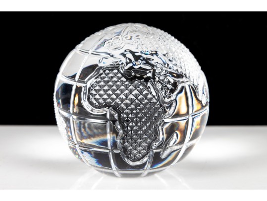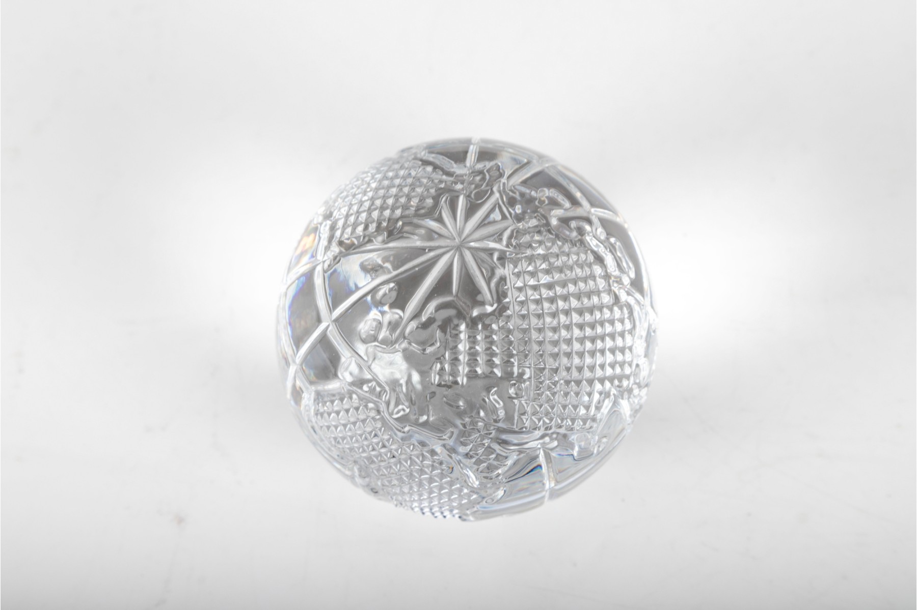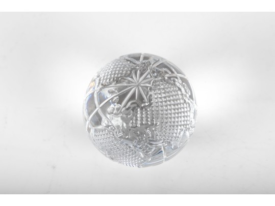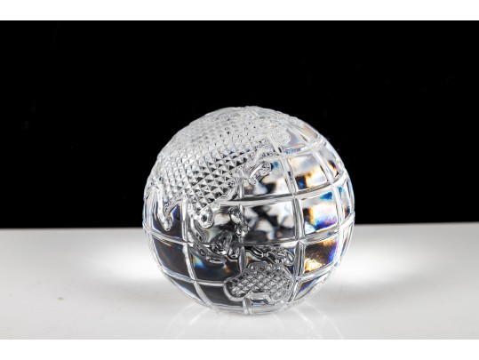 A vintage 3" Waterford crystal art glass globe paperweight, expertly crafted with brilliant clarity, precision-cut facets, and pressed-glass details.