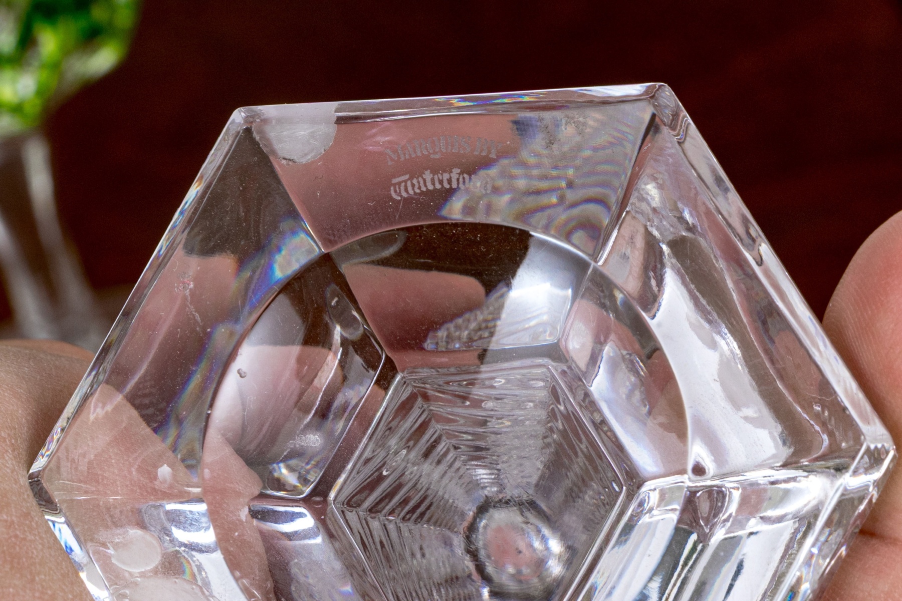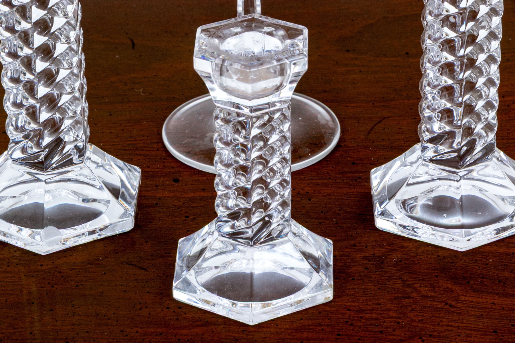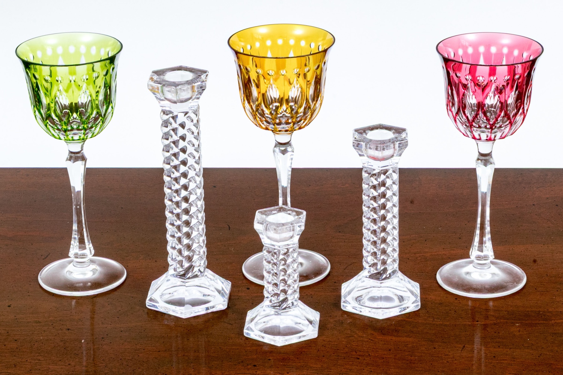 Comprised of a set of three Marquis by Waterford "Monaco" crystal candlesticks on hexagonal bases with swirled columns and hexagonal nozzles. Together with three Varga "Renaissance" crystal cordials with great Bohemian appeal showcasing bowls in green, amber, and cranberry cut to clear with pretty navette leaves and stippled borders. All marked underfoot.