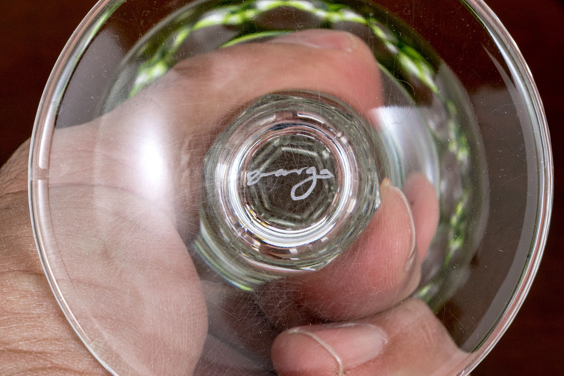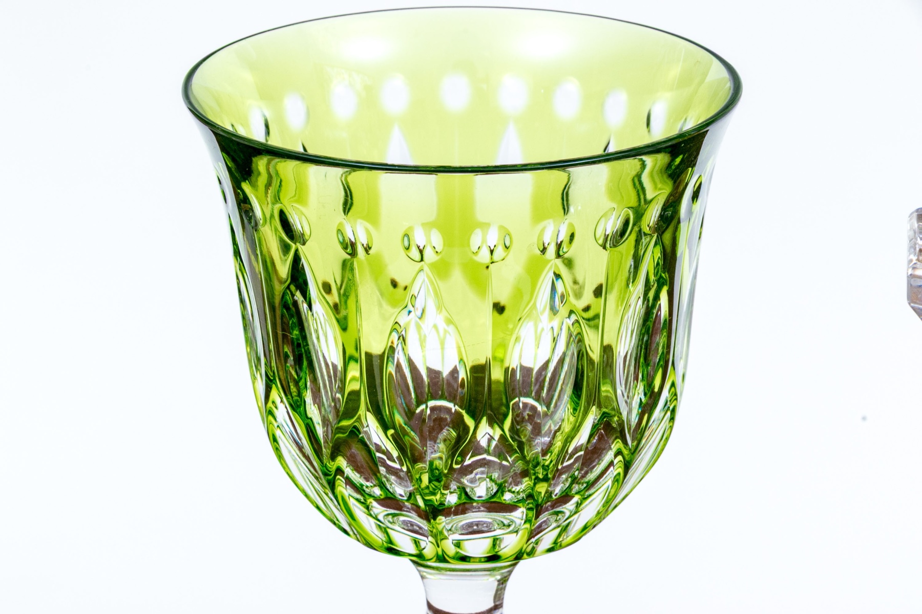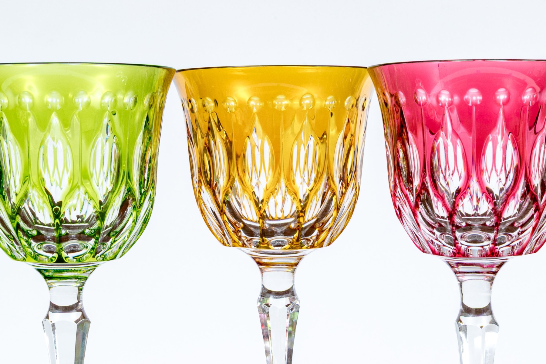 Comprised of a set of three Marquis by Waterford "Monaco" crystal candlesticks on hexagonal bases with swirled columns and hexagonal nozzles. Together with three Varga "Renaissance" crystal cordials with great Bohemian appeal showcasing bowls in green, amber, and cranberry cut to clear with pretty navette leaves and stippled borders. All marked underfoot.