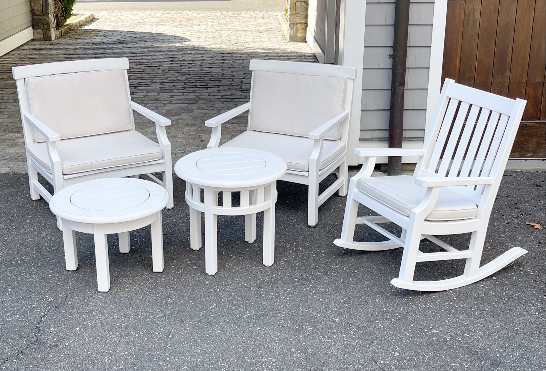 Includes 2 circular end tables, 1 rocking chair with a pair of wide armchairs.