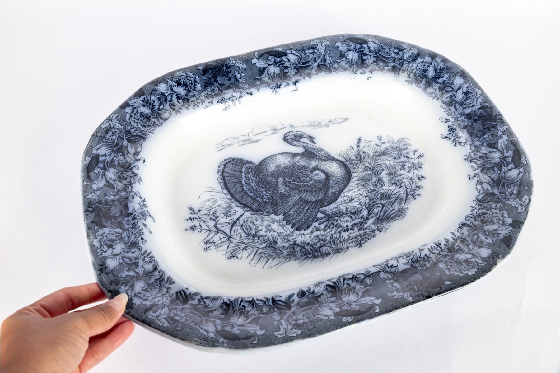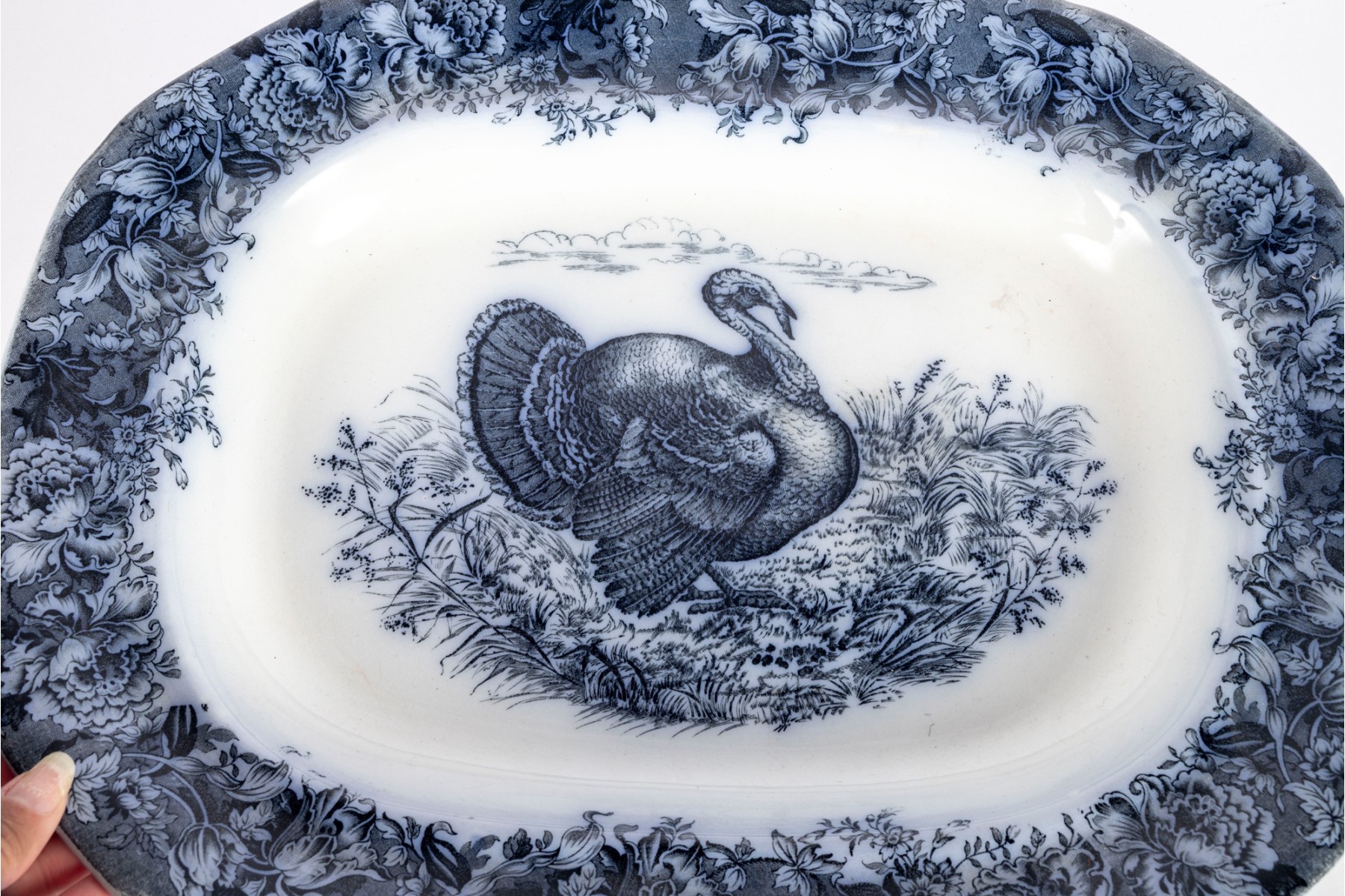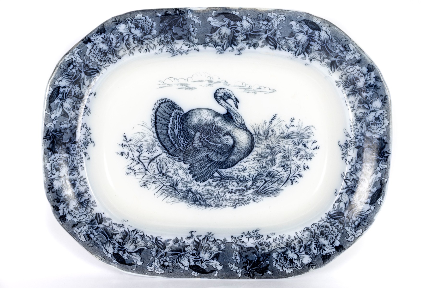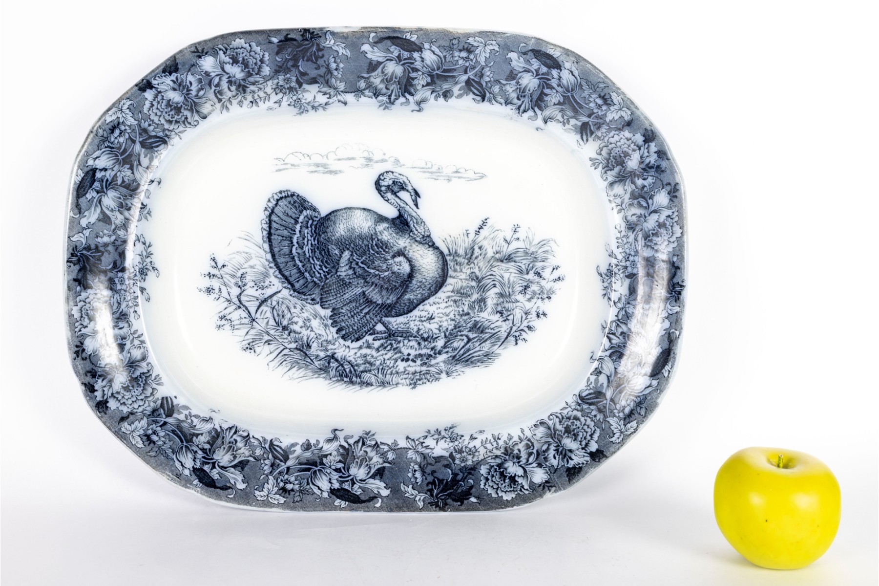 A heavy flow blue porcelain "Clytie" turkey platter by Wedgwood, featuring a beautifully transferred foliate trim pattern with a turkey in the center.