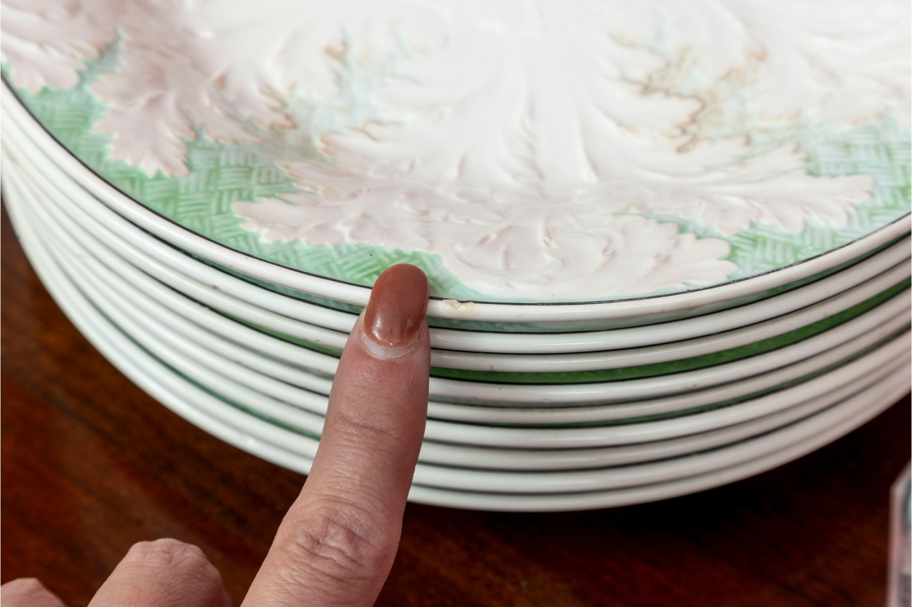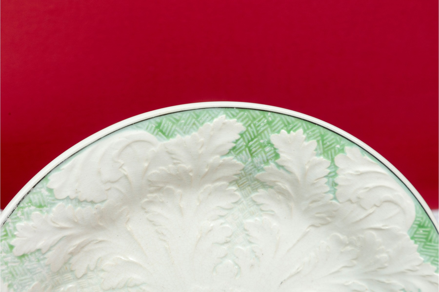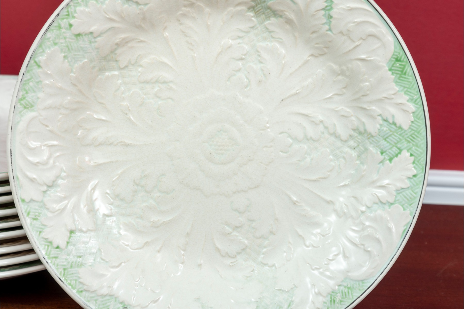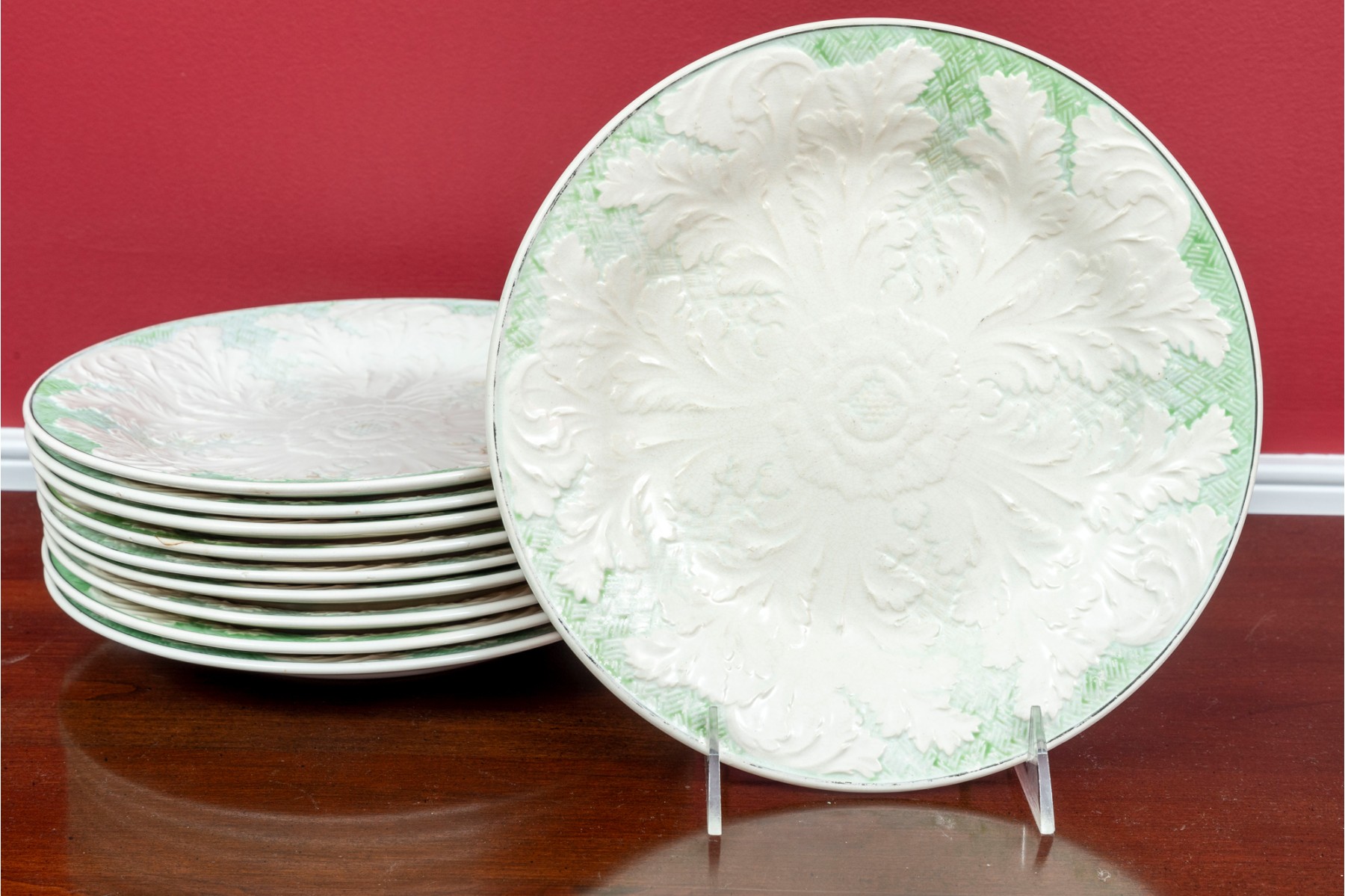 A group of ten Wedgwood majolica plates displaying large white concentrically radiating leaf relief designs surrounded by pale celadon basket weave textures. Marked on the undersides.