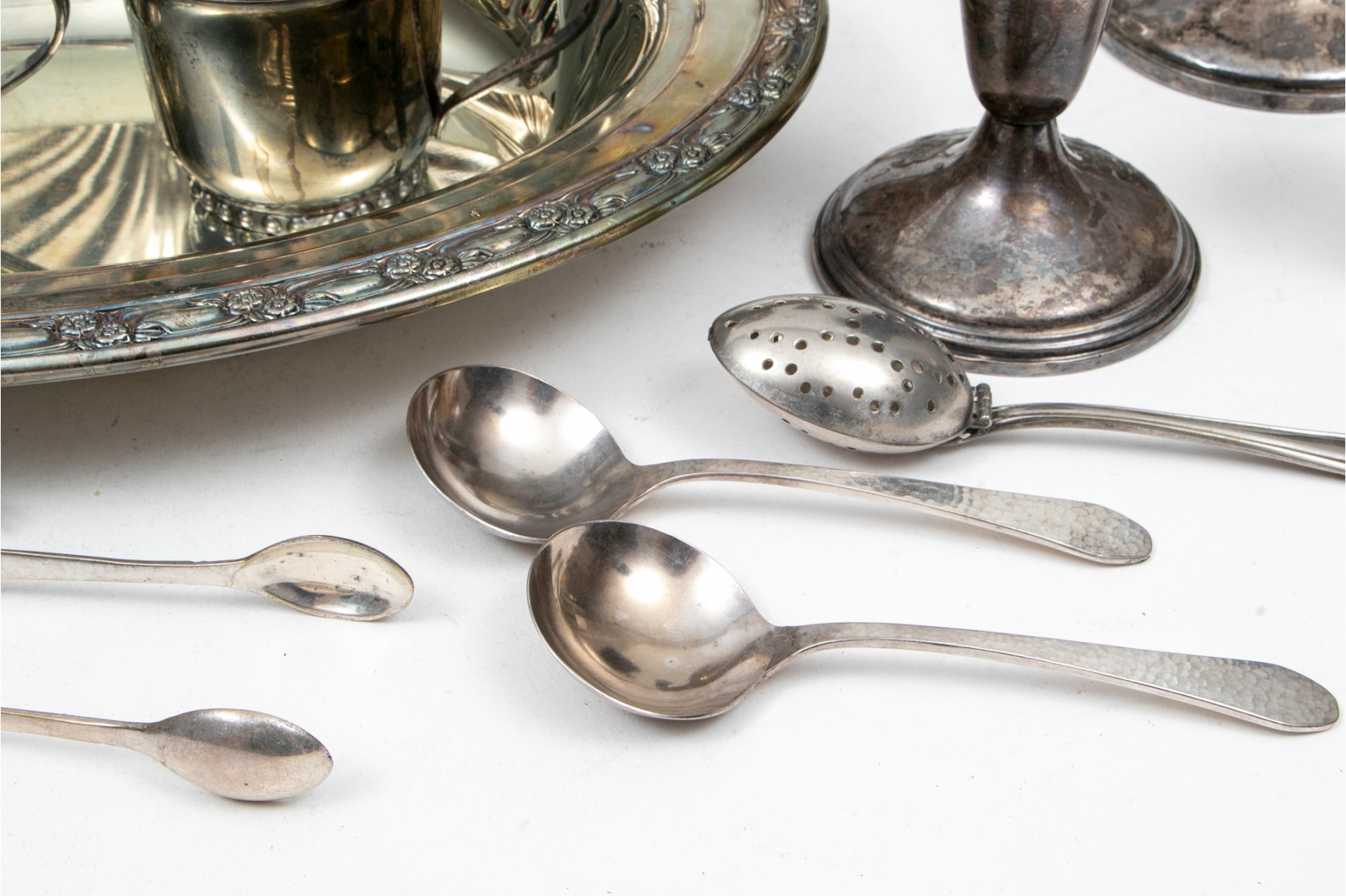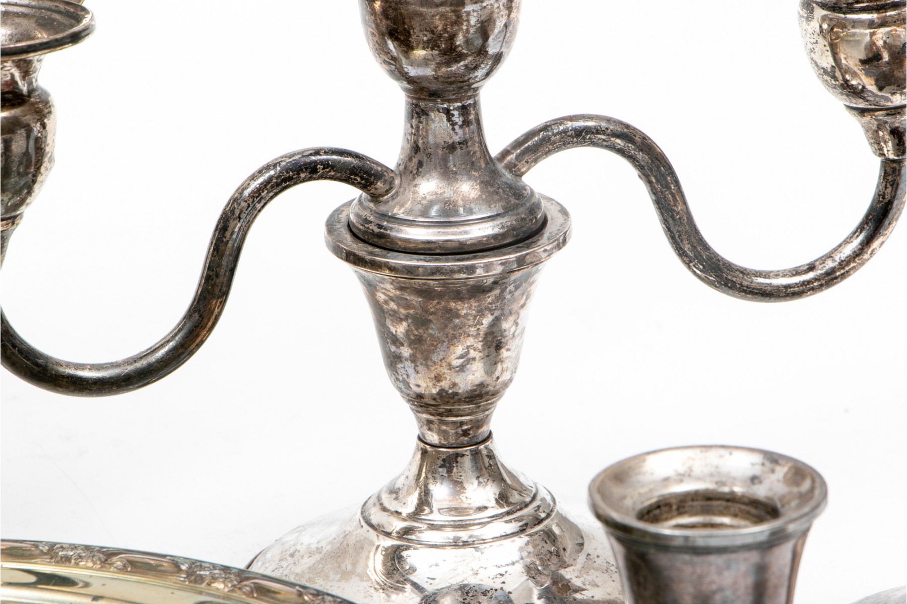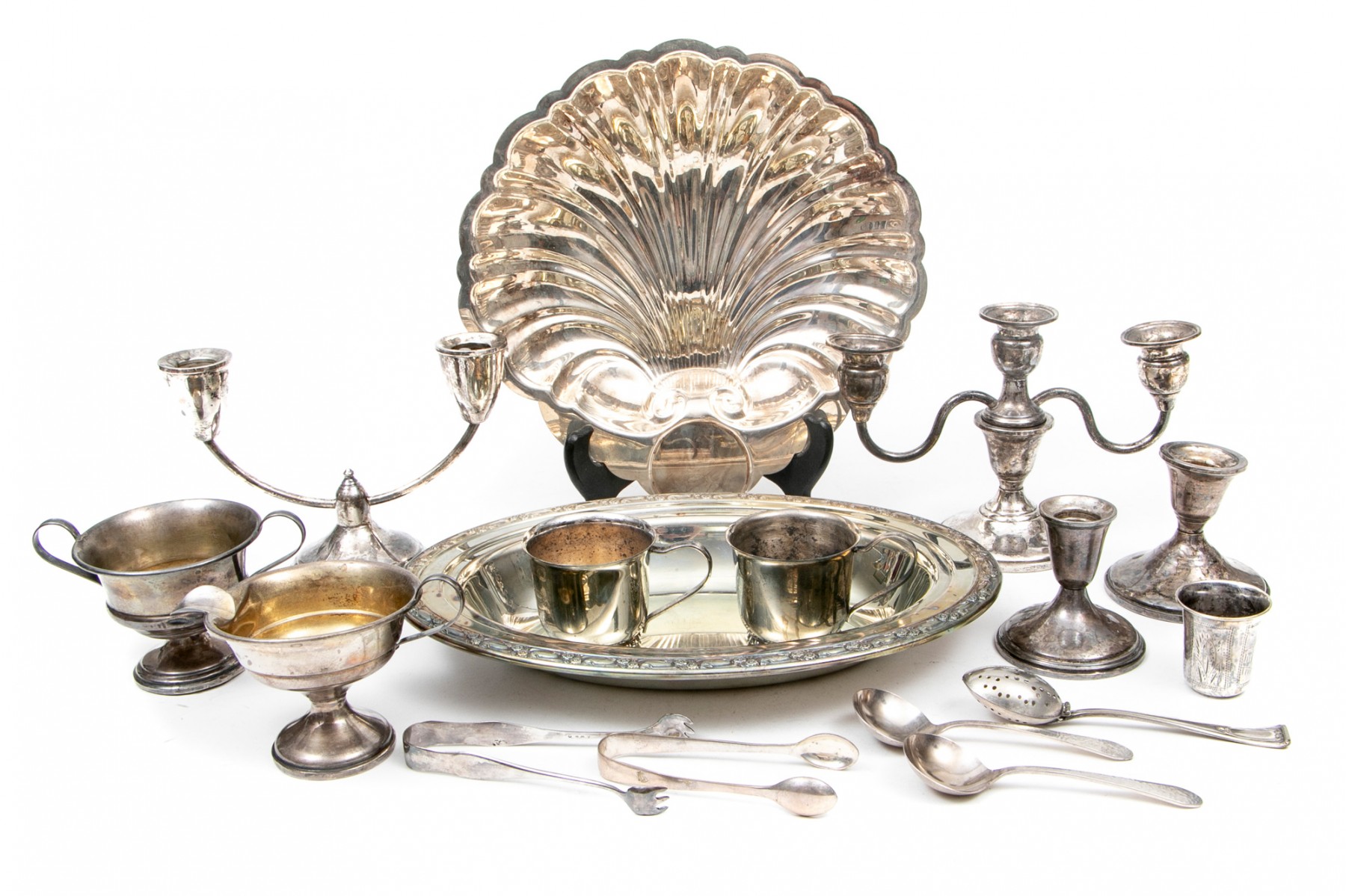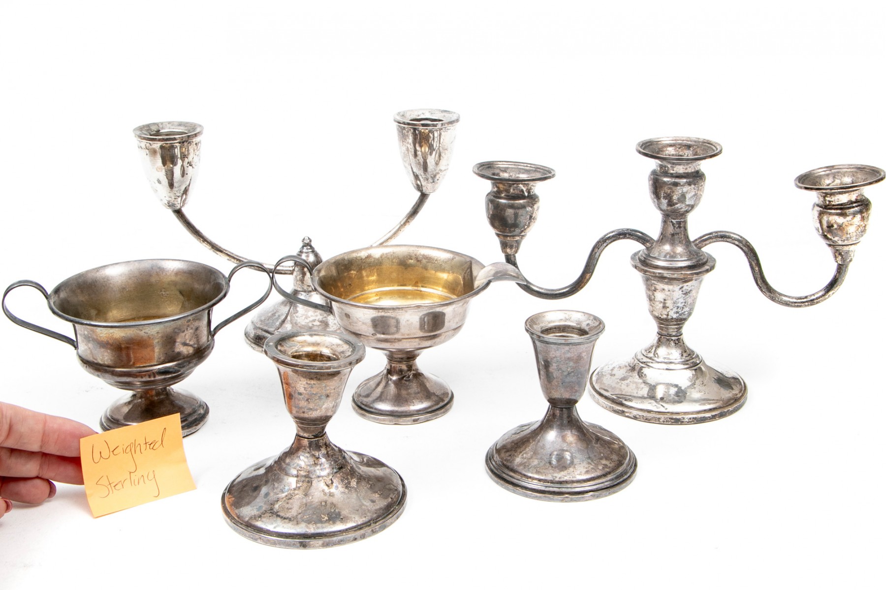 Collection of weighted sterling cups and candle holders, 84 silver Russian cup, and silver plated dishes.