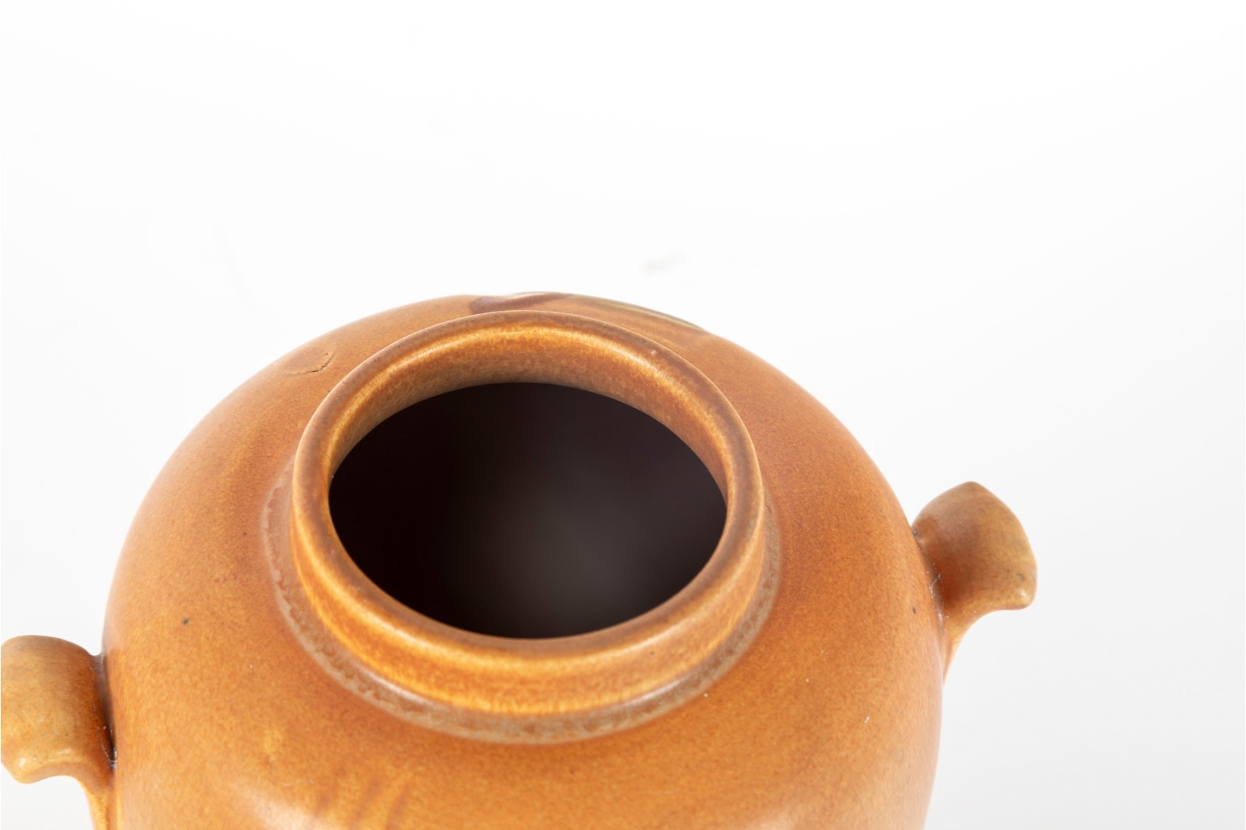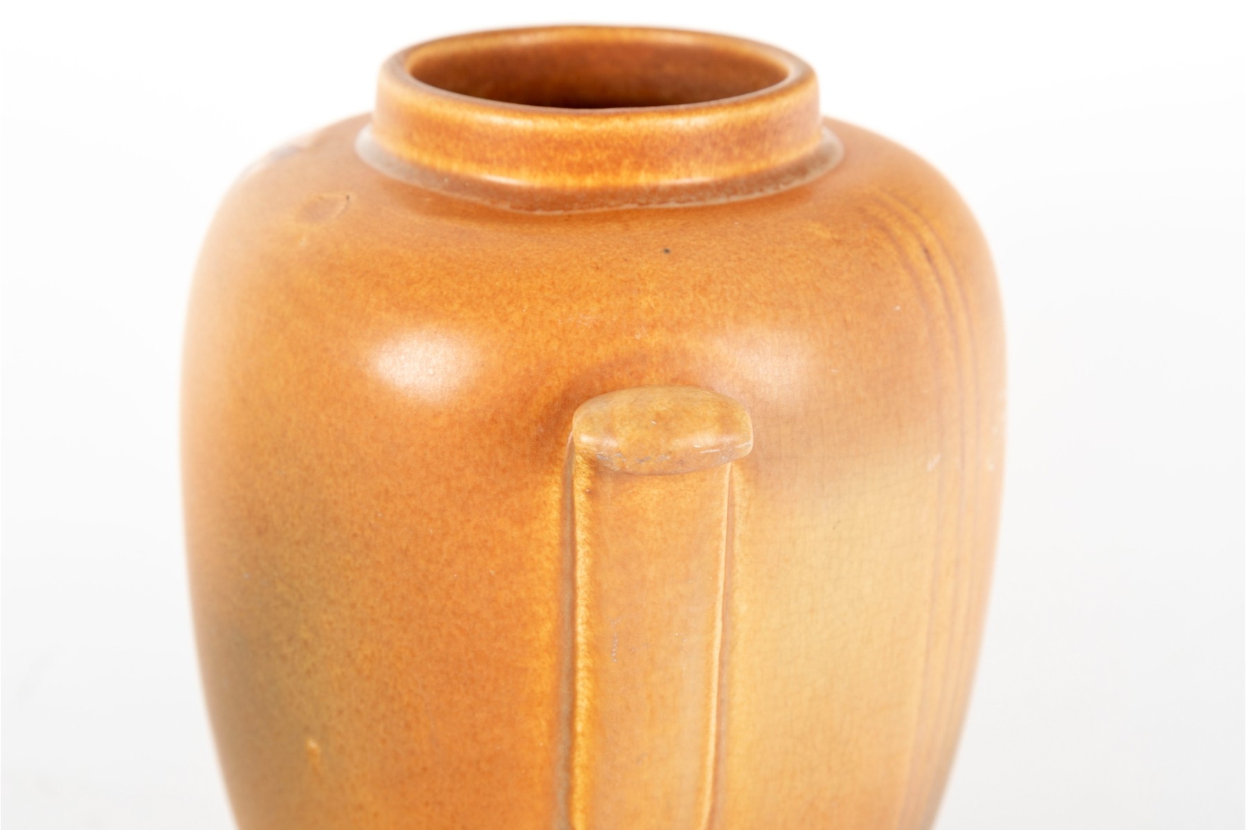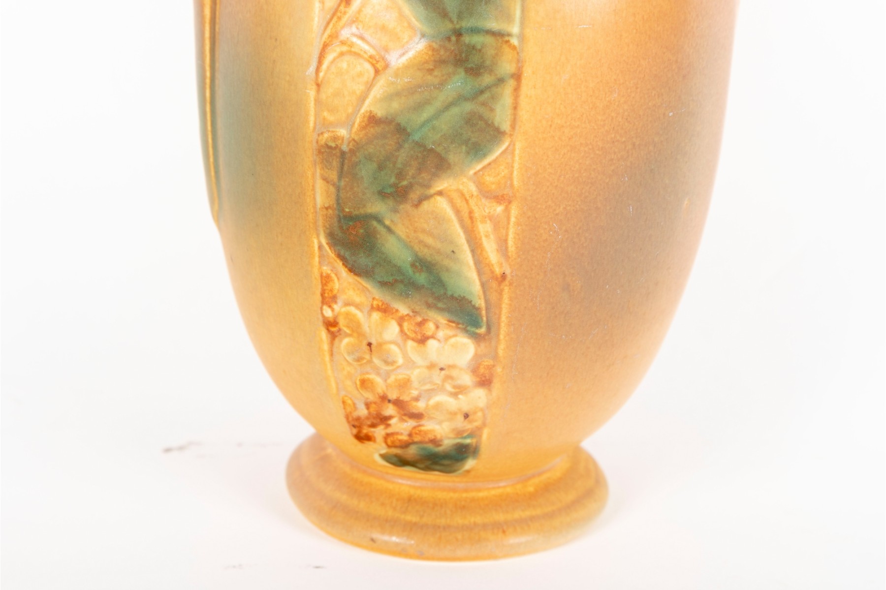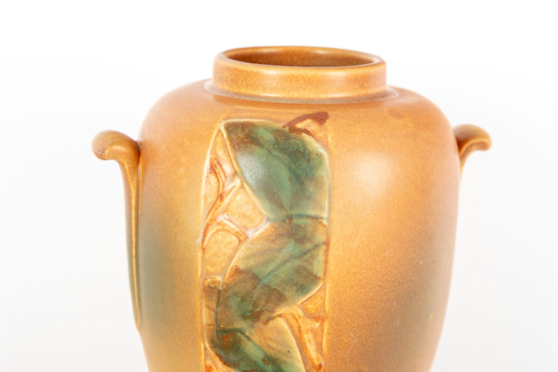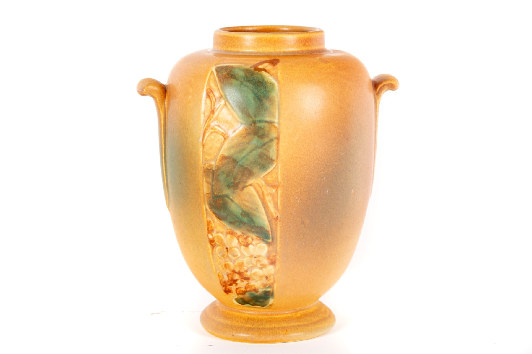 A traditional ceramic urn-form vase from Weller Pottery’s “Velva” collection — denoted by a peach cream glaze and a centered floral relief.