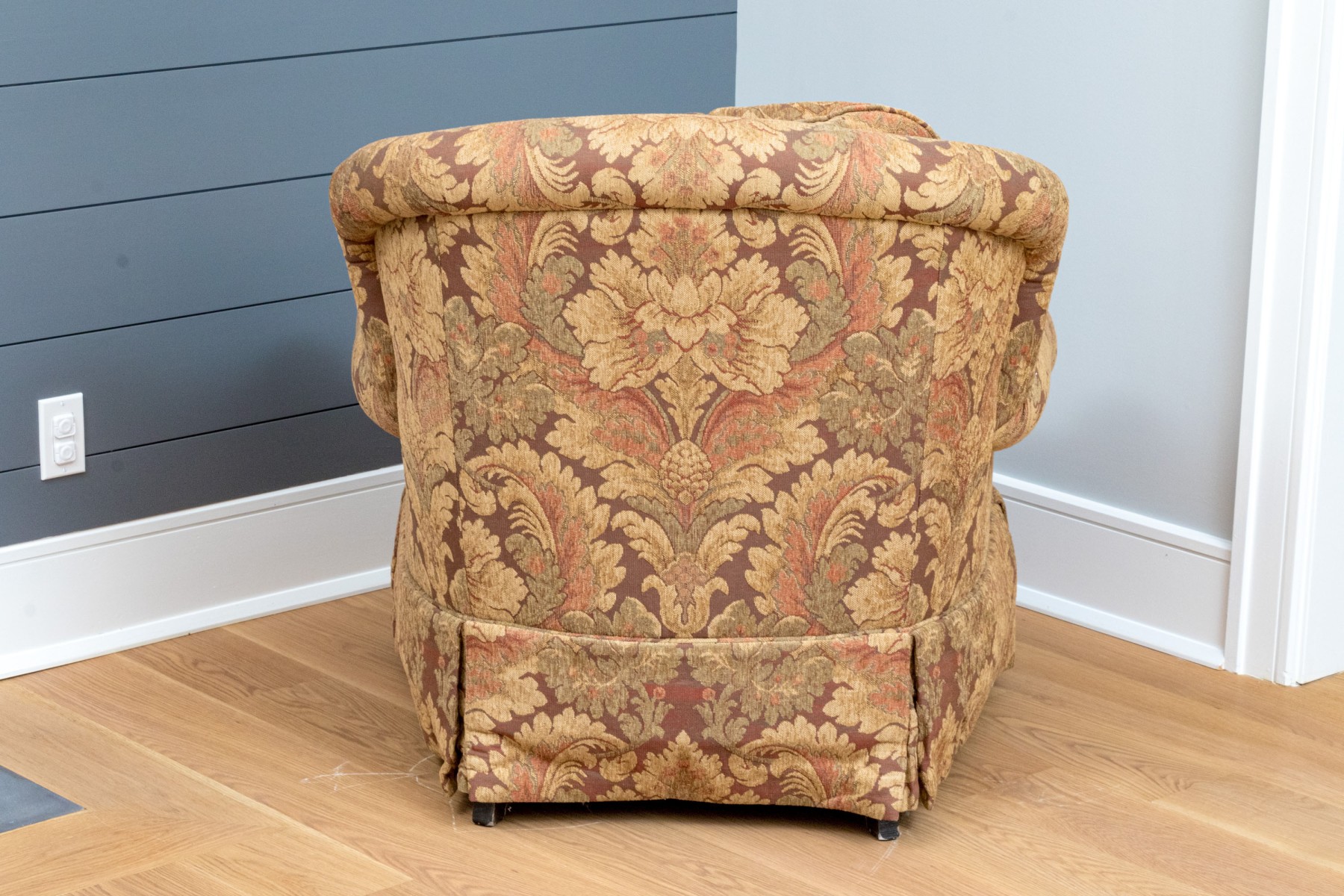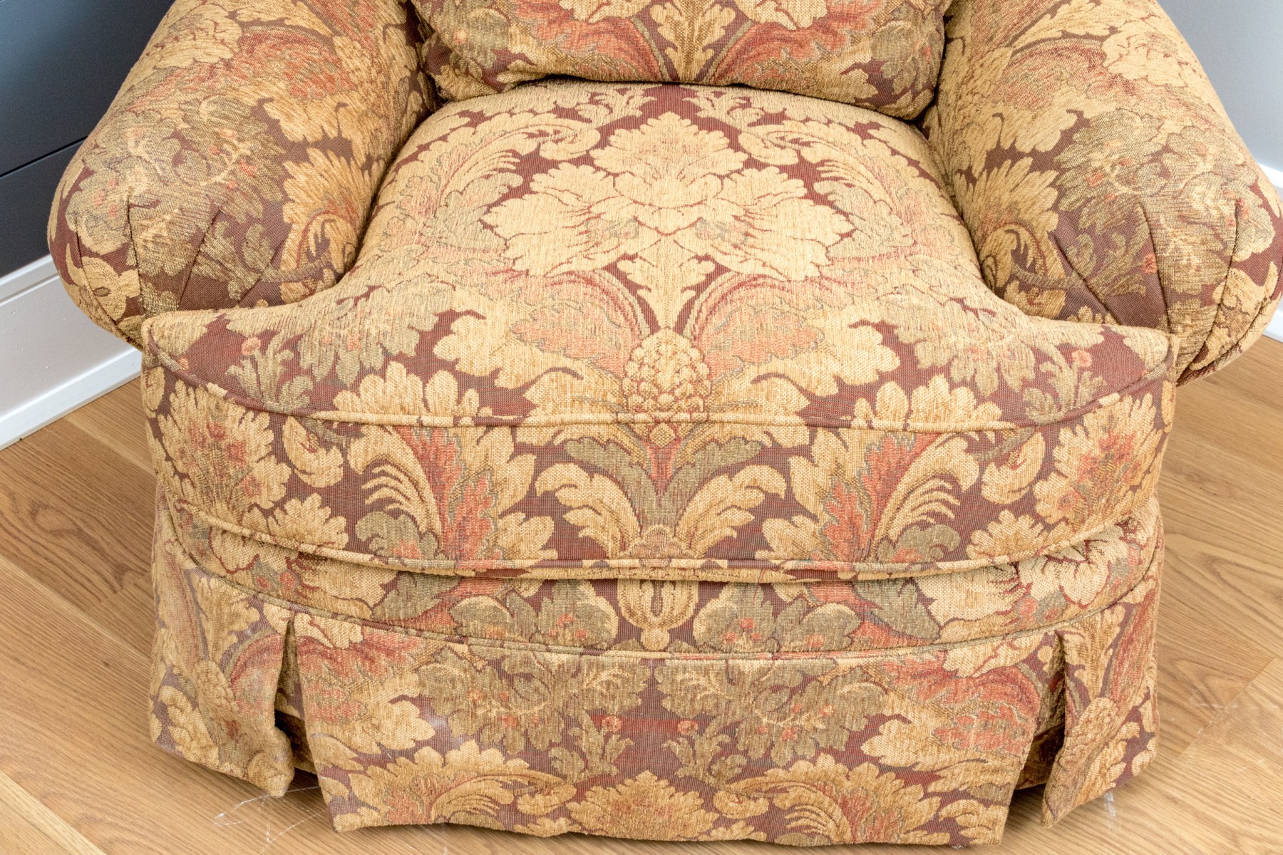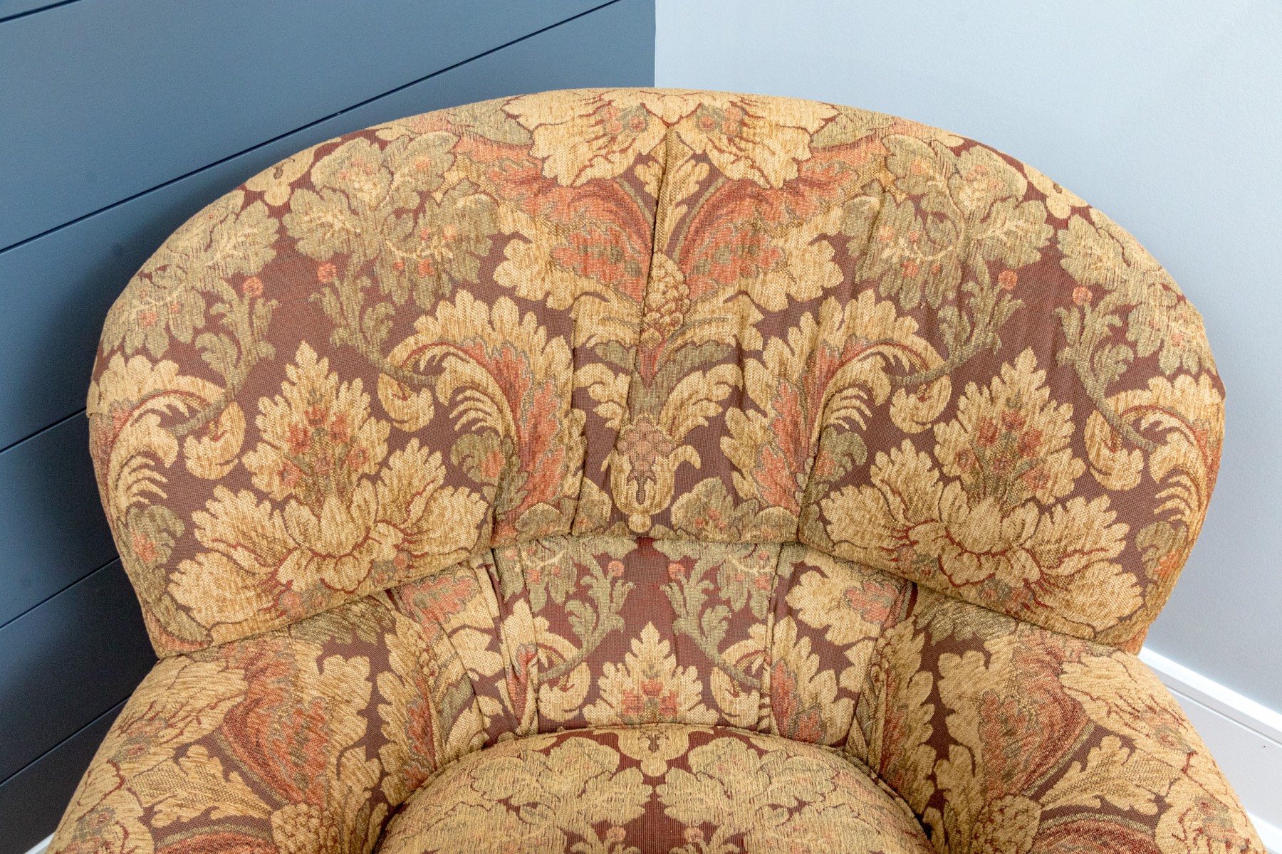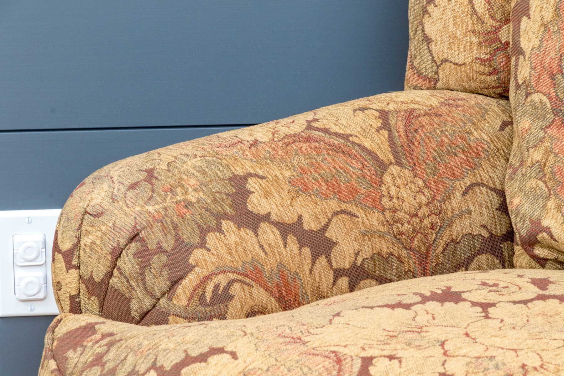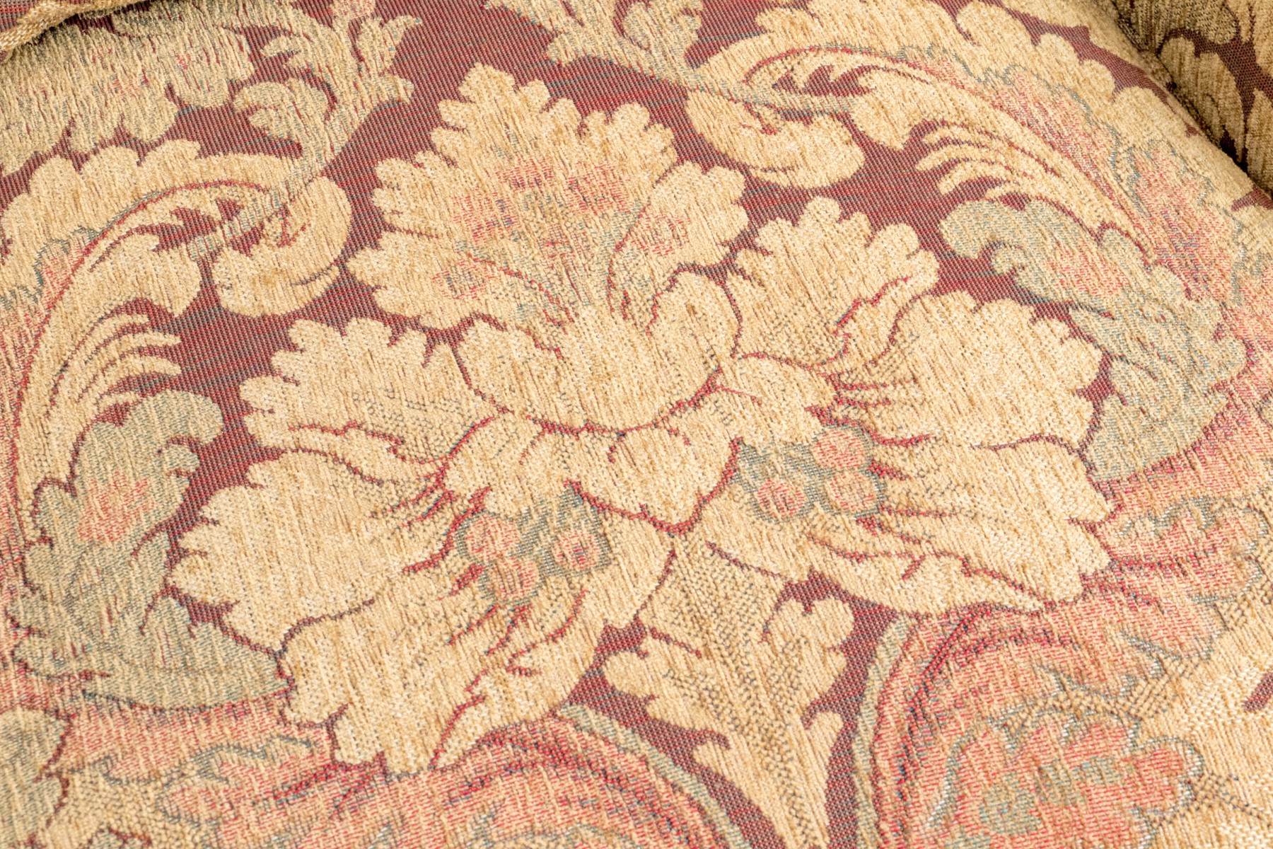 With handsome rolled arms and Rococo style decorative upholstery with textural ornately scrolled feather and foliate motif against a warm hued ground.