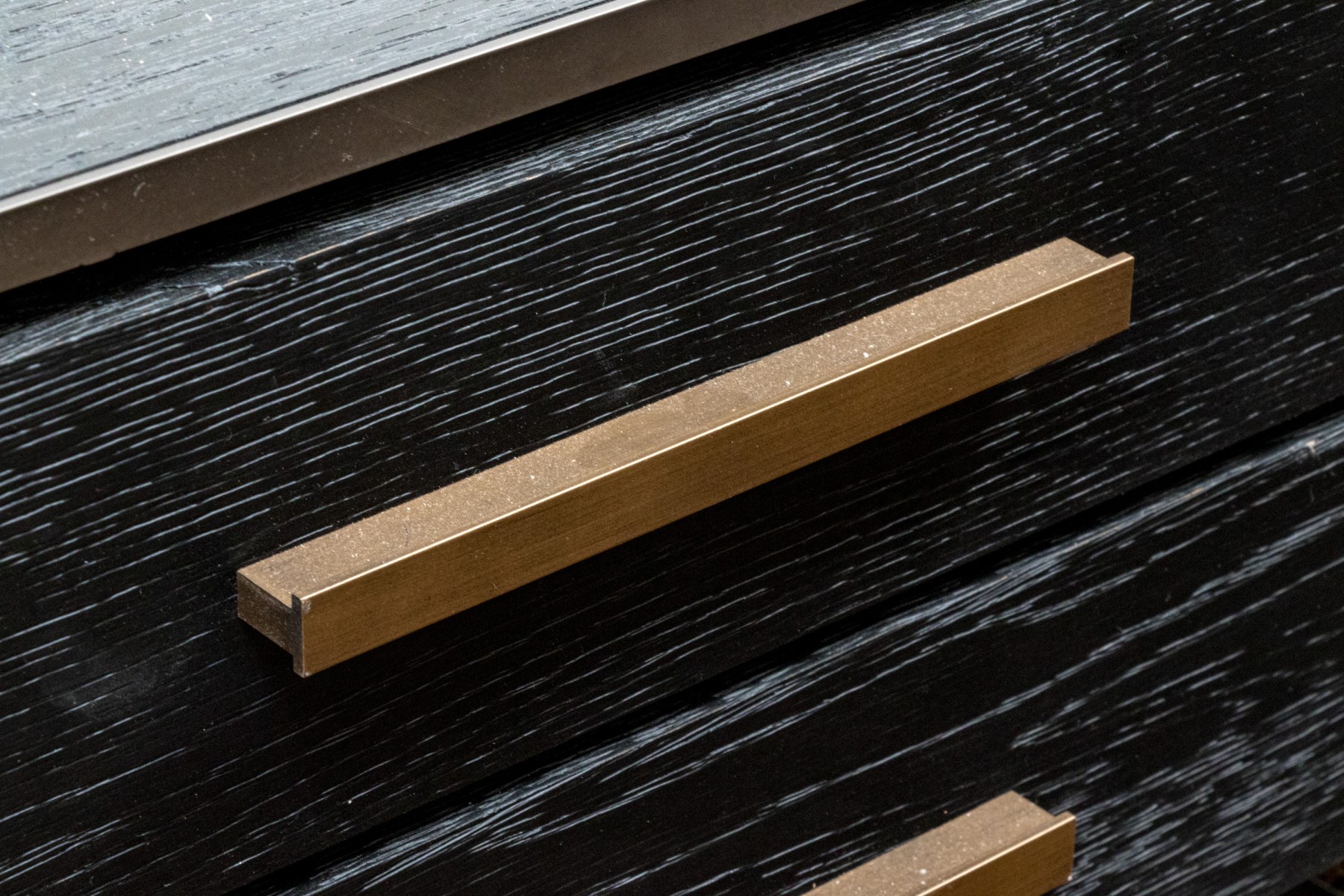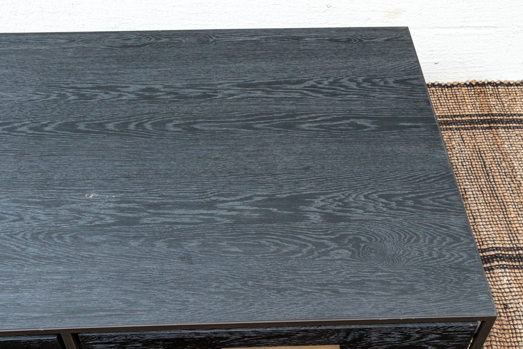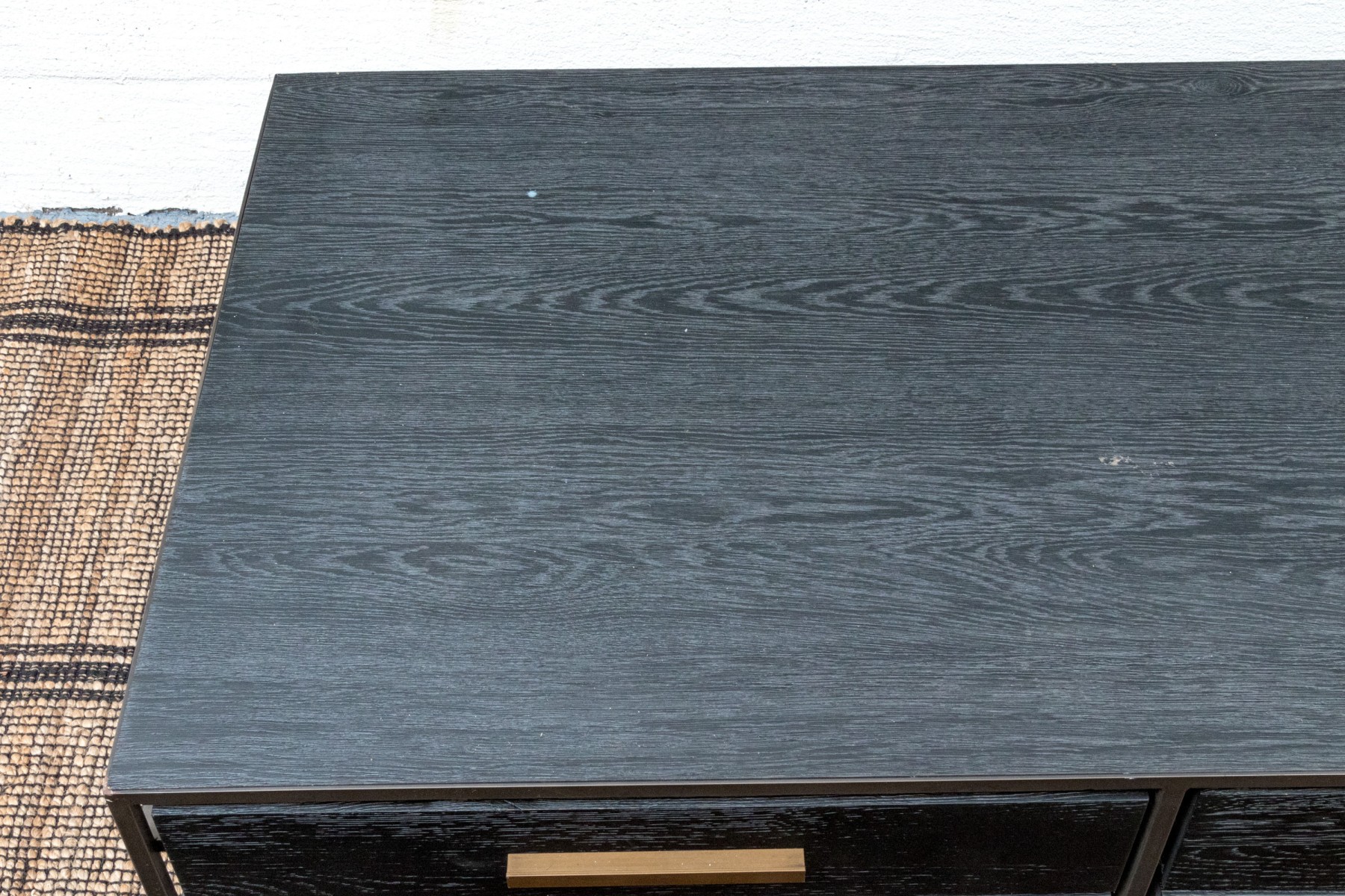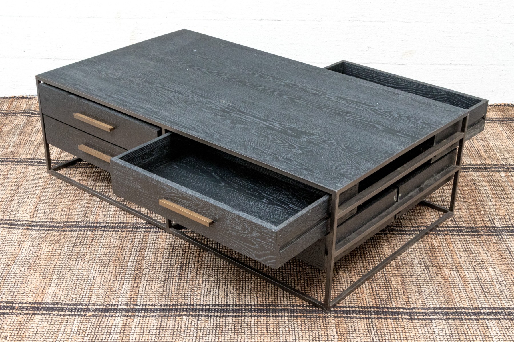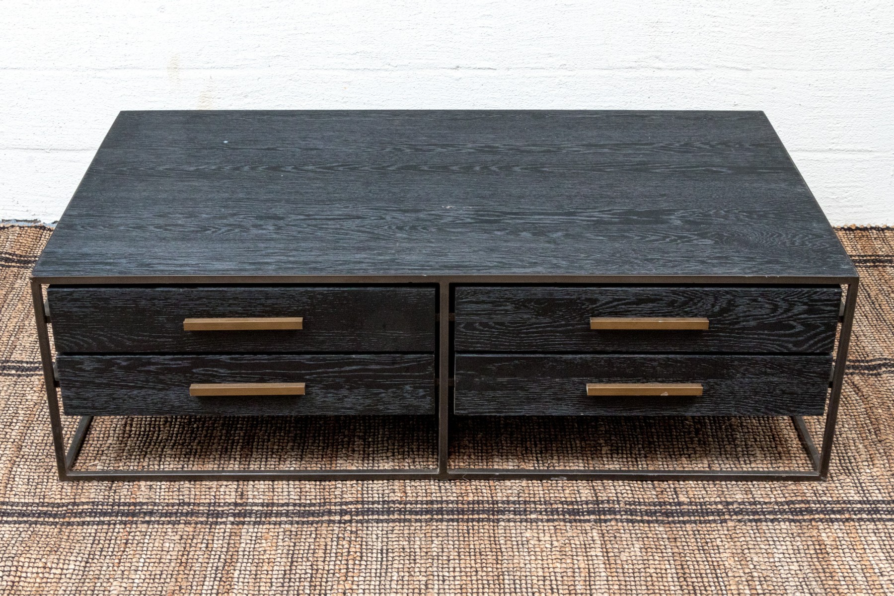 A striking West Elm Highland collection cocktail table with a handsome blend of rustic and luxury. Showcases a rich blue-gray finished rectangular body with four drawers on each side adorned with minimalist brasstone bar handles, floating within a bronzed metal frame.