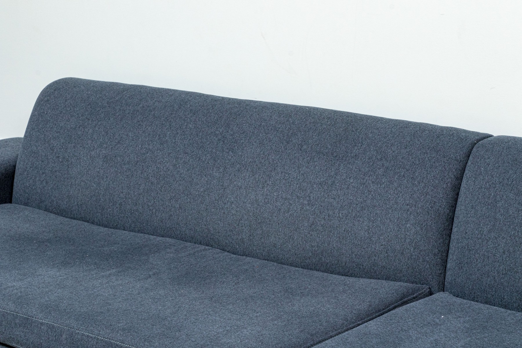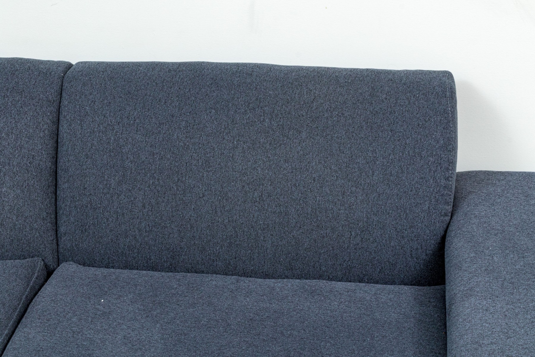 In blue upholstery. The sectional sofa is comprised of a chaise lounge chair with left arm and a loveseat sofa with right arm.