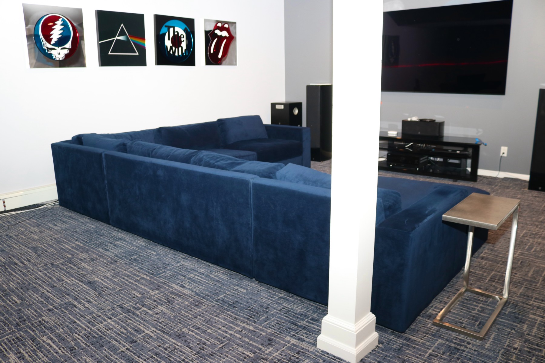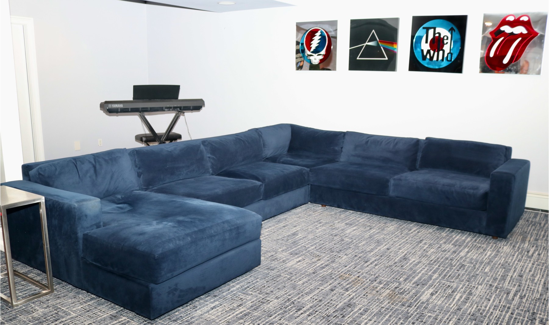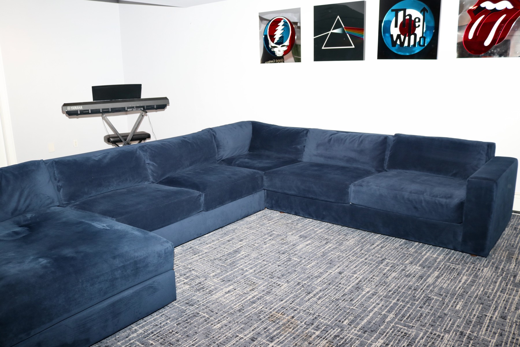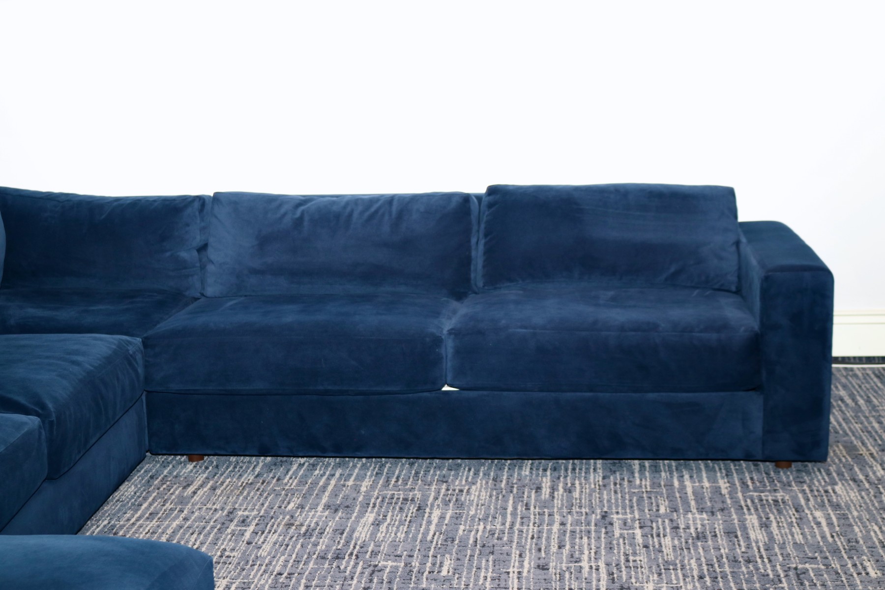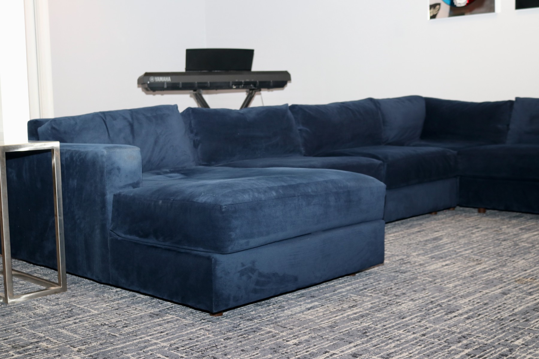 Sink into this plush, deep blue oversized modular sectional sofa with a chaise extension Designed for comfort and versatility, this sectional features multiple pieces that can be configured to suit your space—ideal for media rooms, lounges, or family entertainment areas.