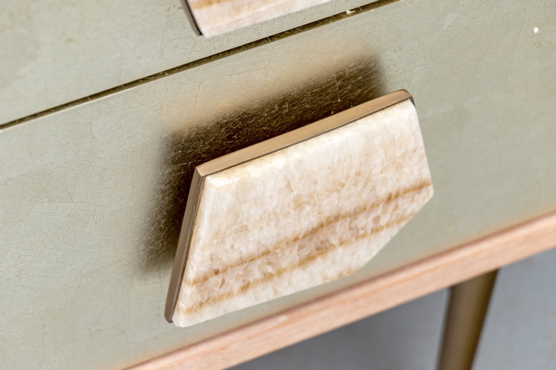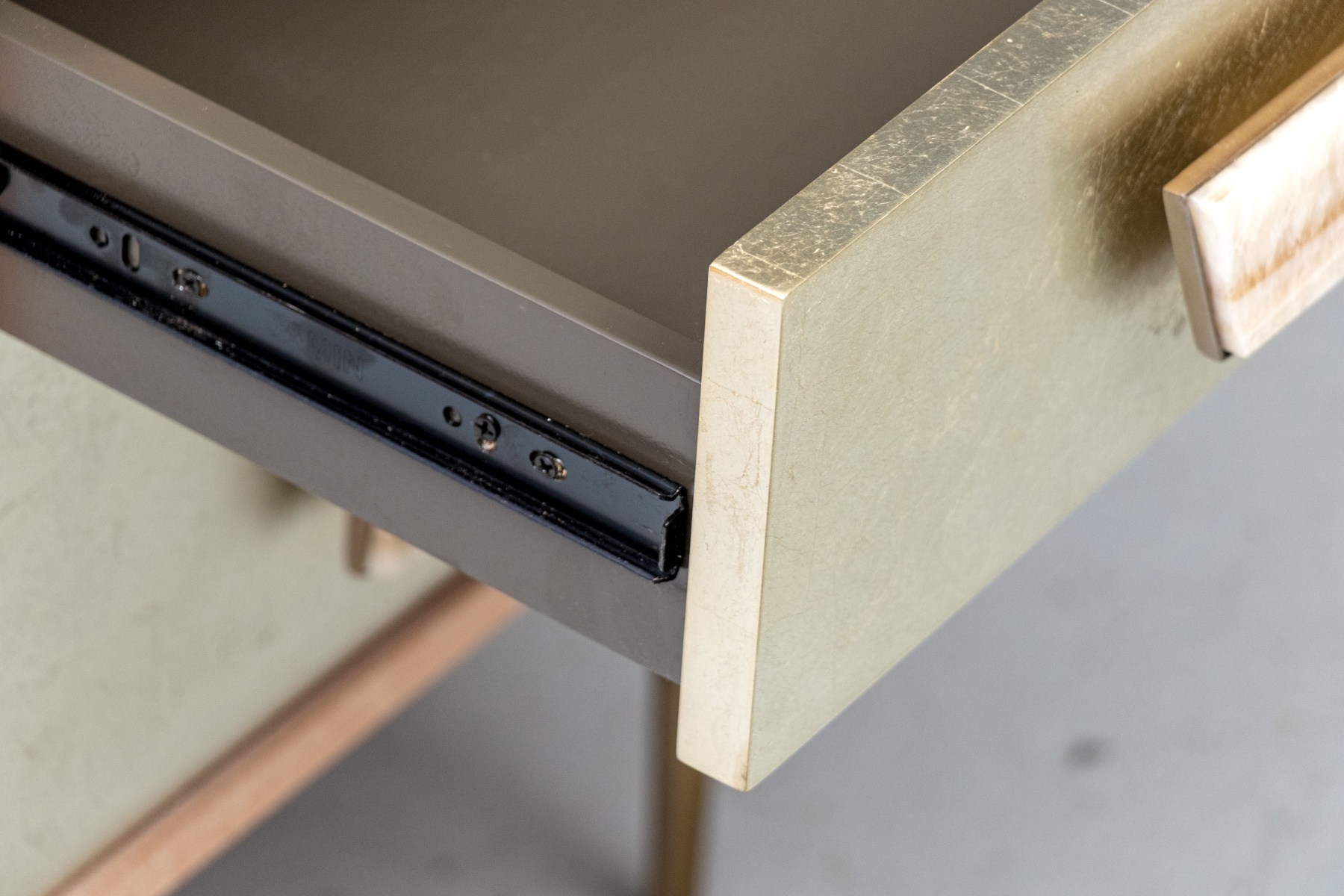 On four legs with stretcher supports, the square form case is set with two gilt finished drawers with stone and brass finished pulls.