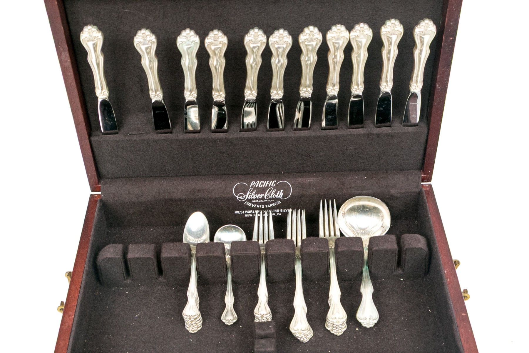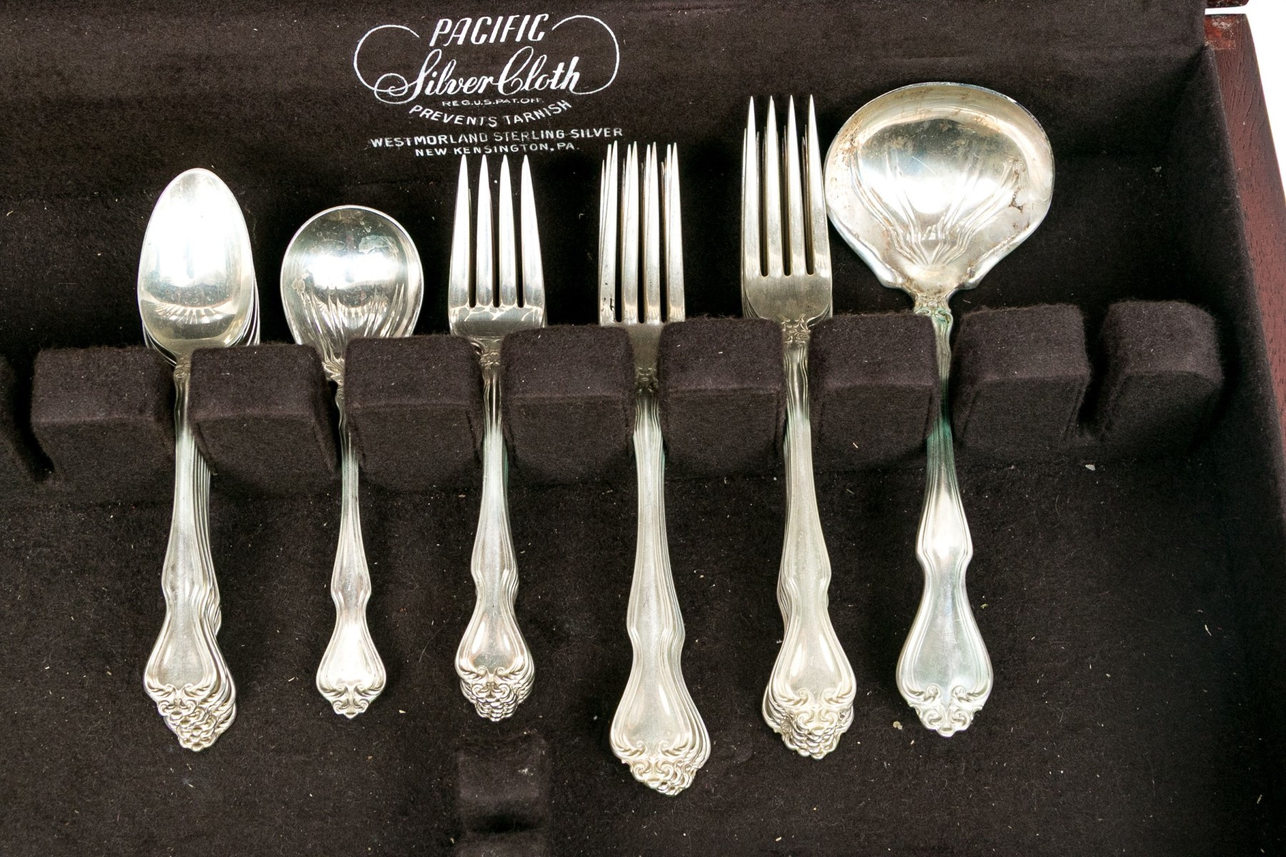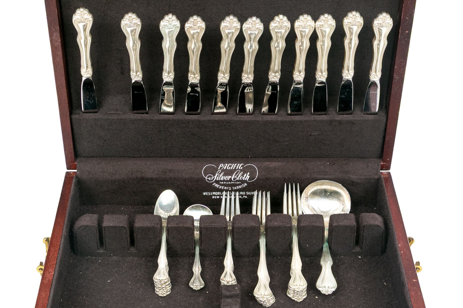 A Westmorland "George And Martha Washington" sterling silver partial flatware service designed with elegant, shapely stems and foliate scrolls around the handles. Contained within a wood twin-handled case.