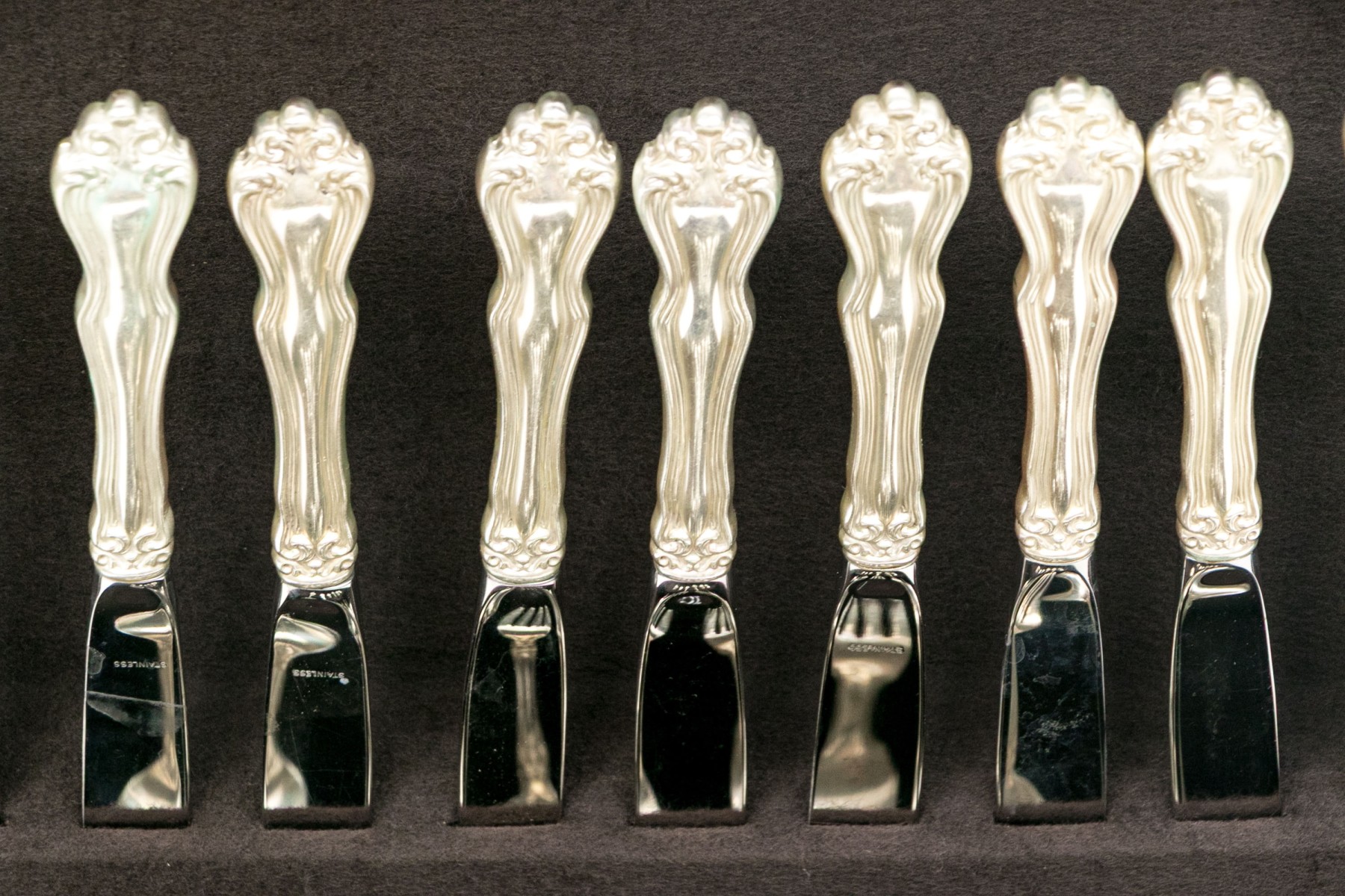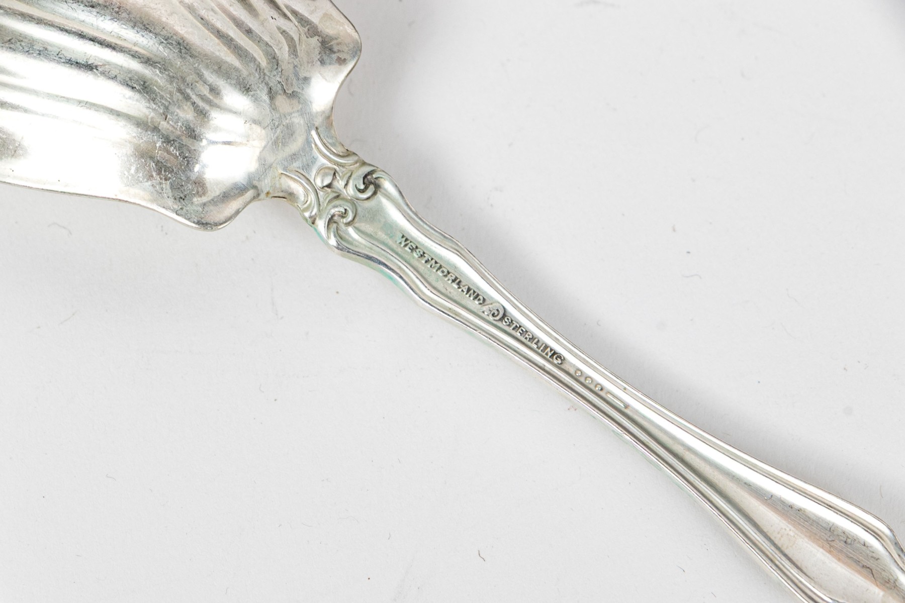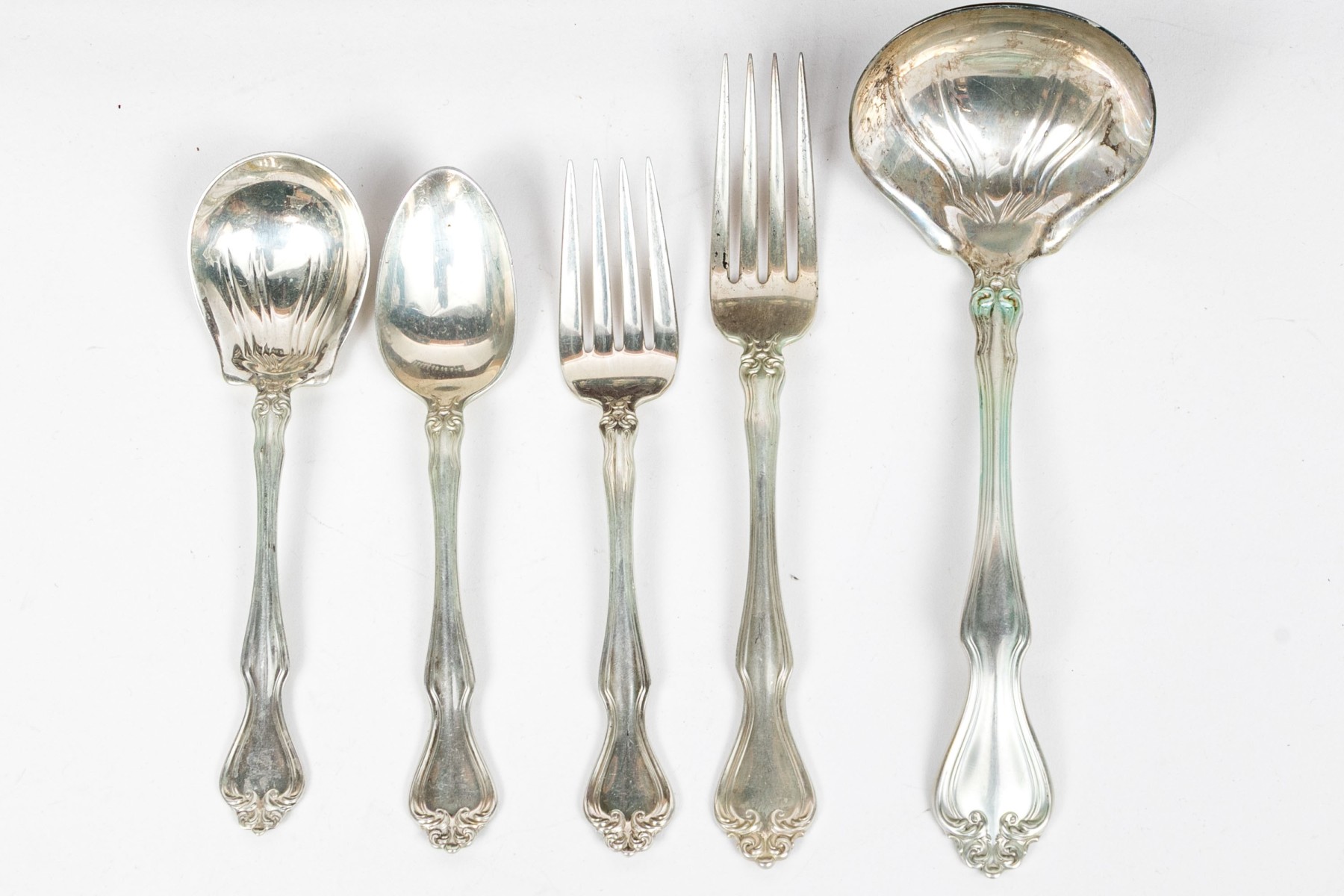 A Westmorland "George And Martha Washington" sterling silver partial flatware service designed with elegant, shapely stems and foliate scrolls around the handles. Contained within a wood twin-handled case.