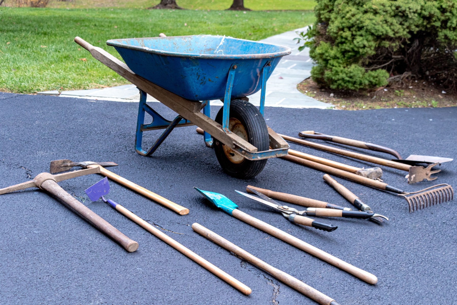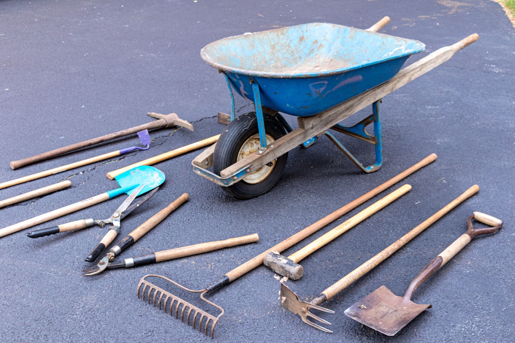 A lovely gardening lot including a blue finished metal and wood wheelbarrow along with a variety of wood-handled tool.