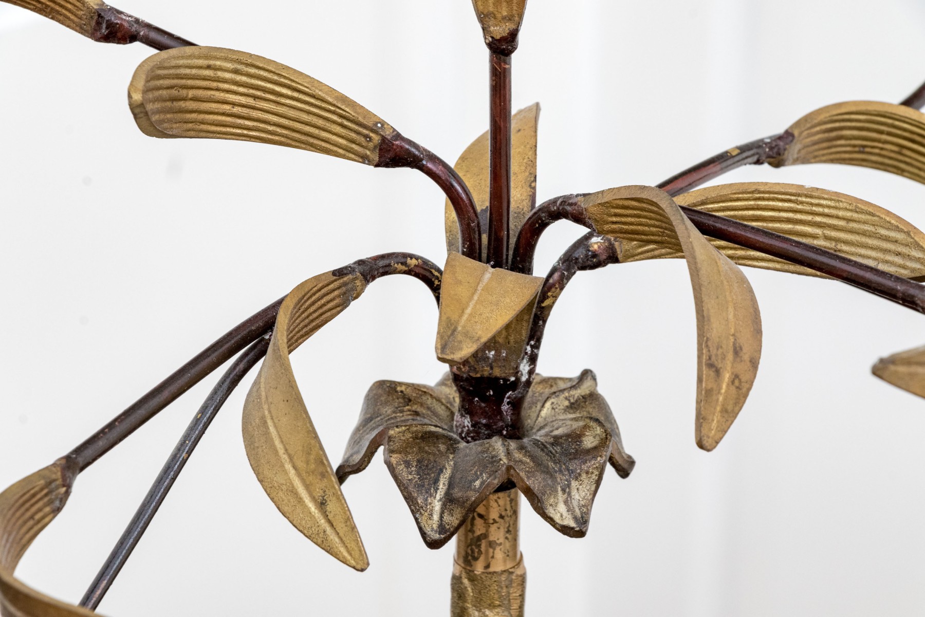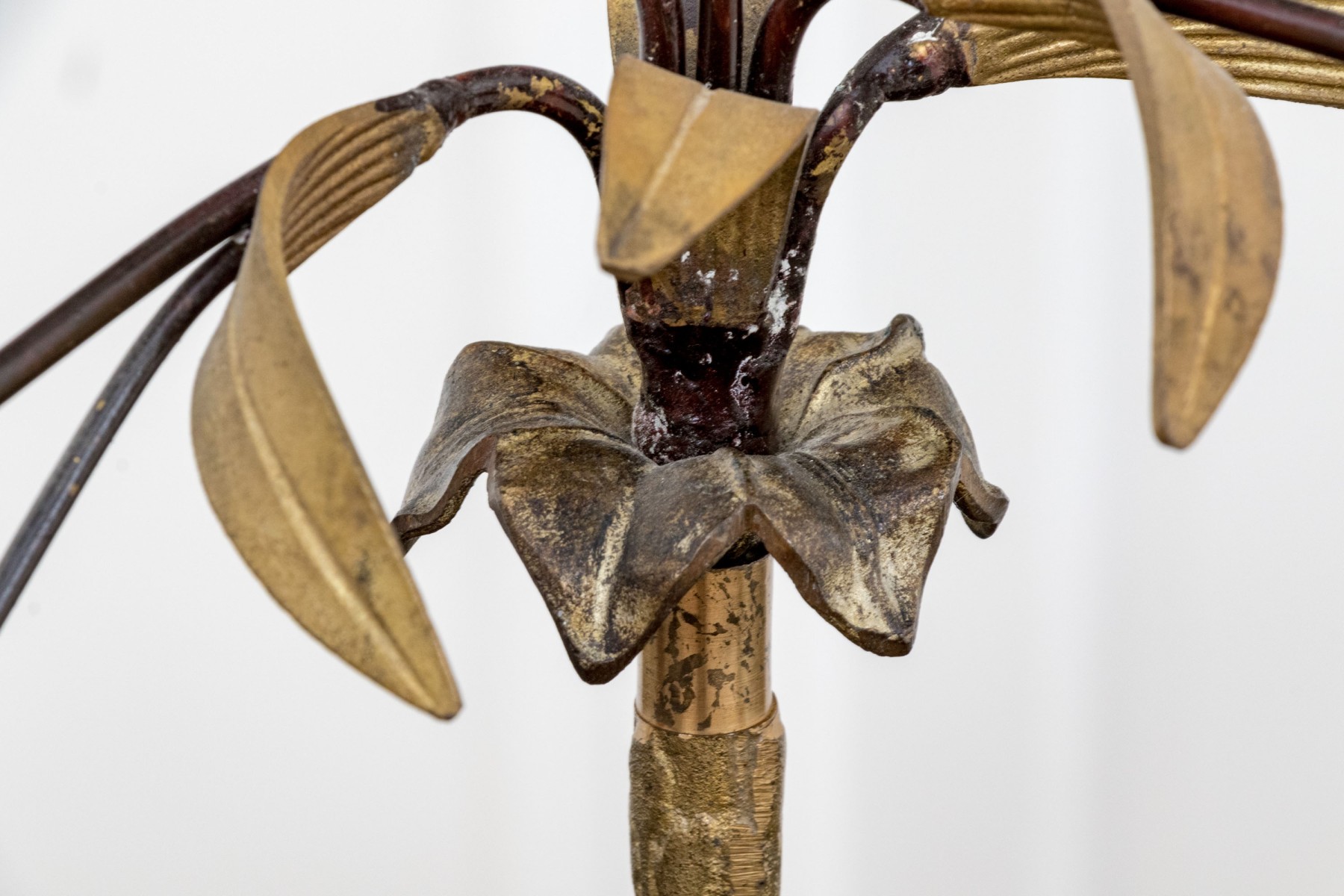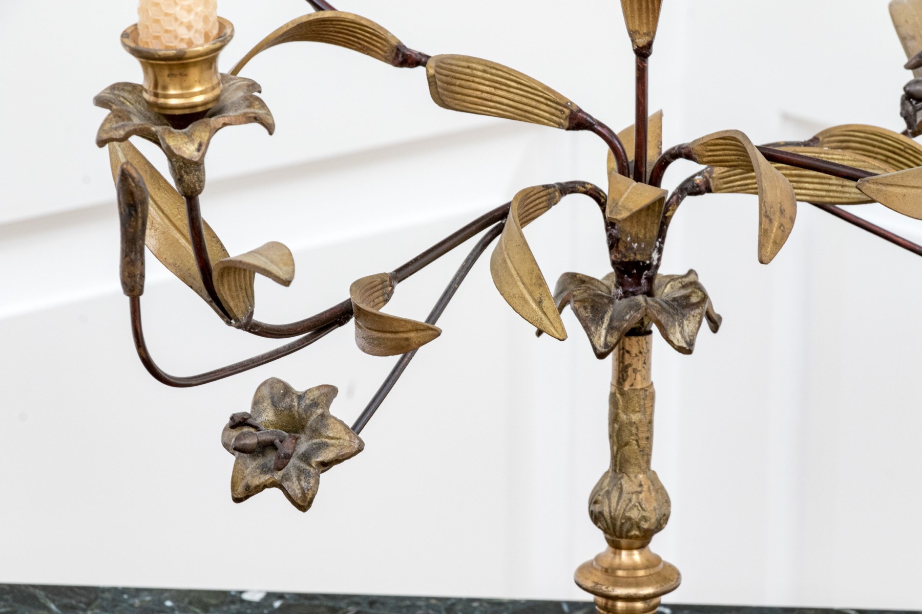 Some bends and wear to the finish with a missing fitting to one of the flowers.