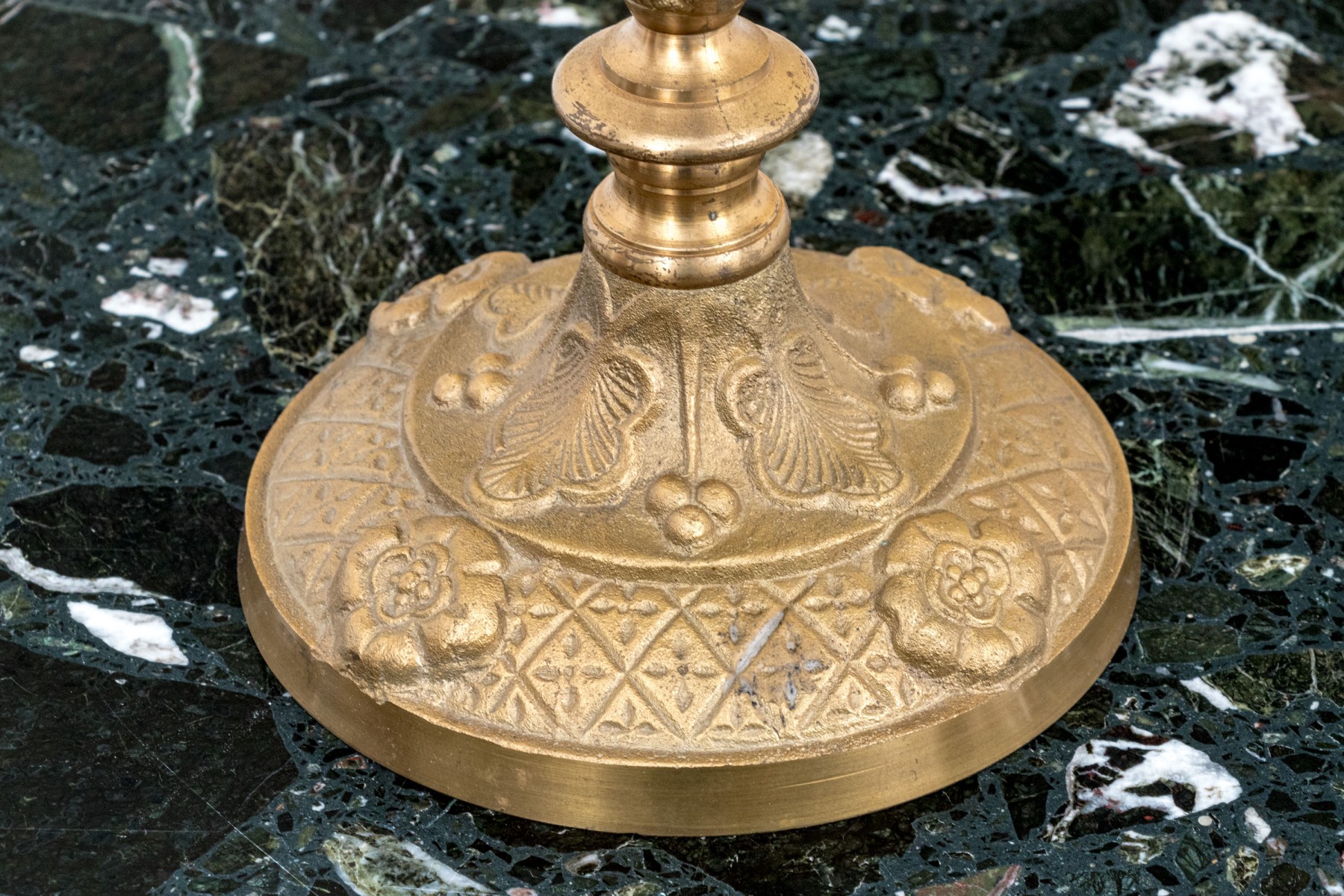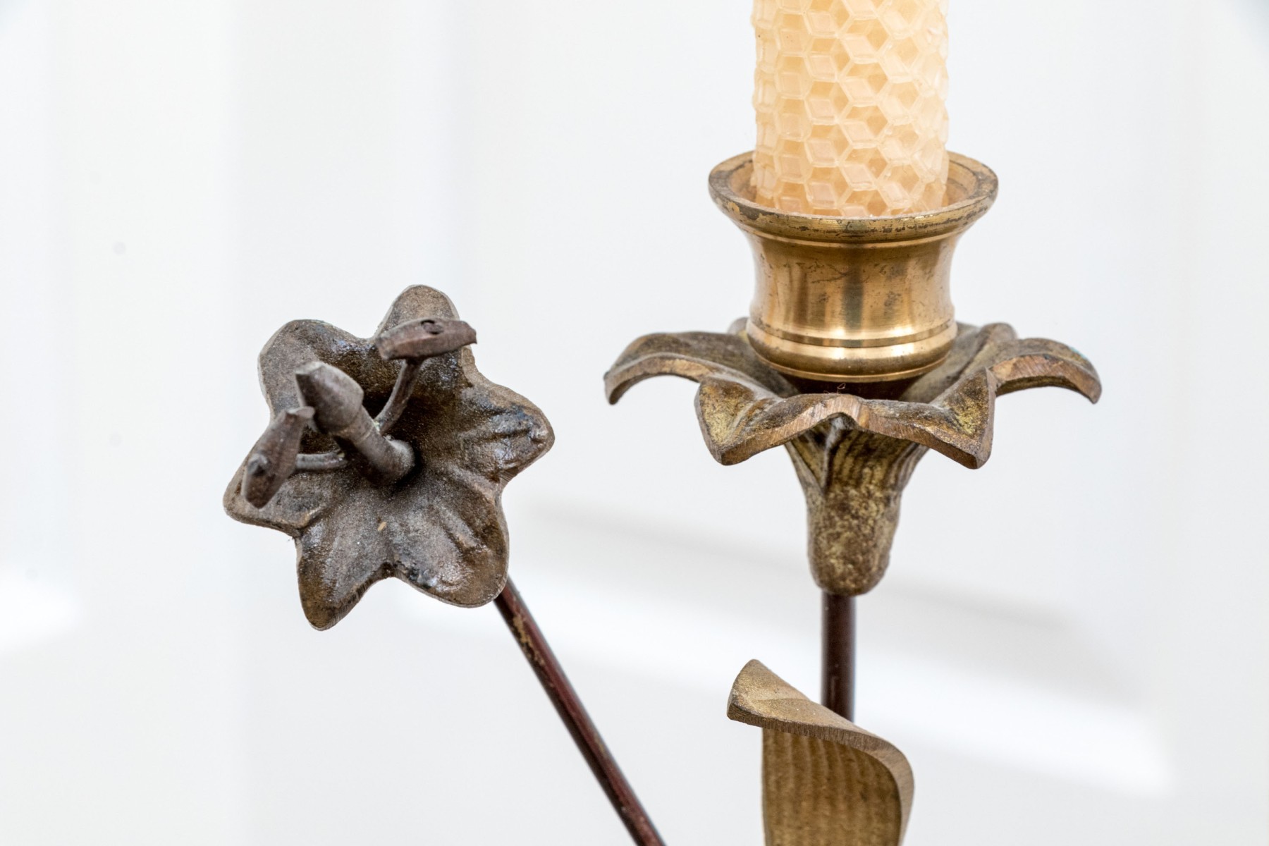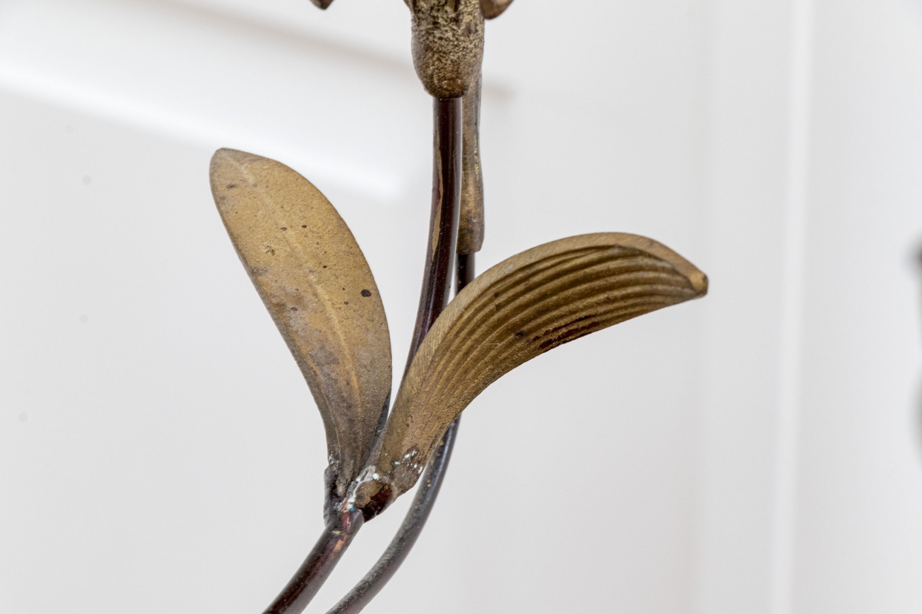 Some bends and wear to the finish with a missing fitting to one of the flowers.