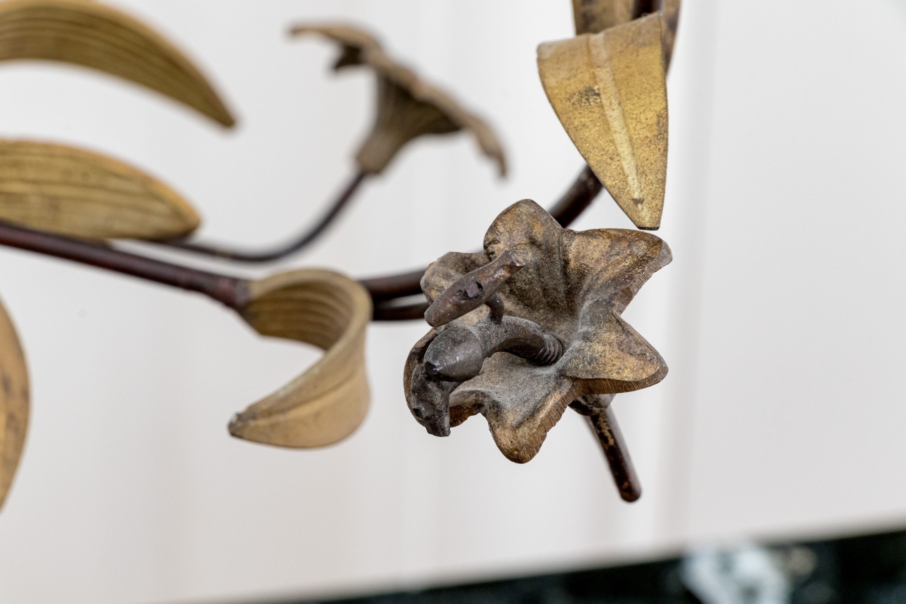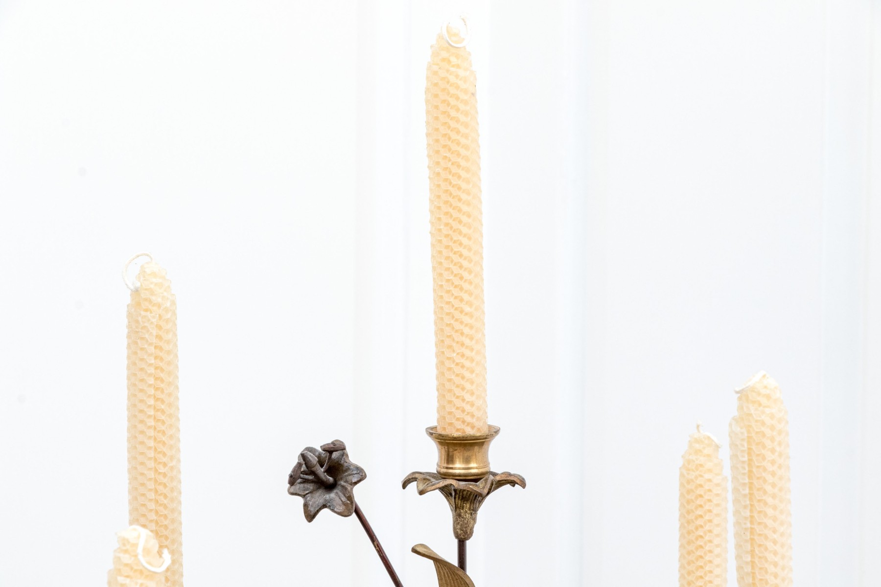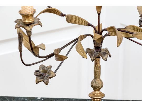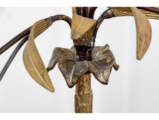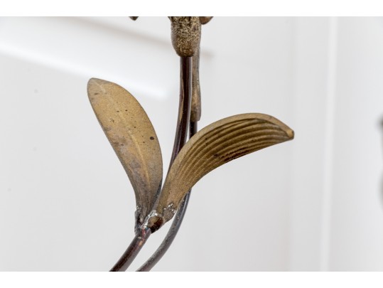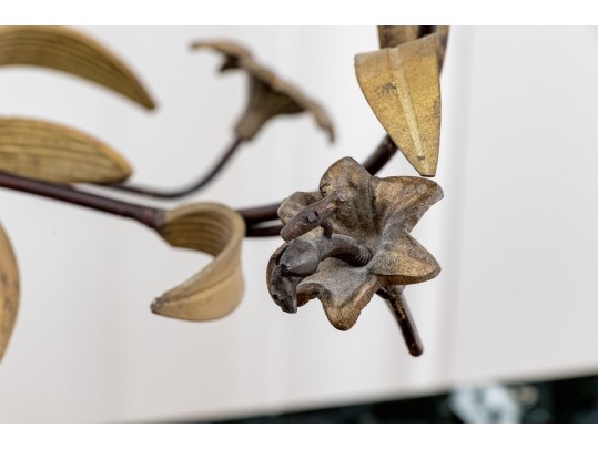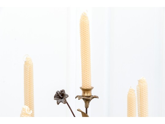 A whimsical brass and iron five-light candelabra with foliage arms creating a natural, airy appearance.