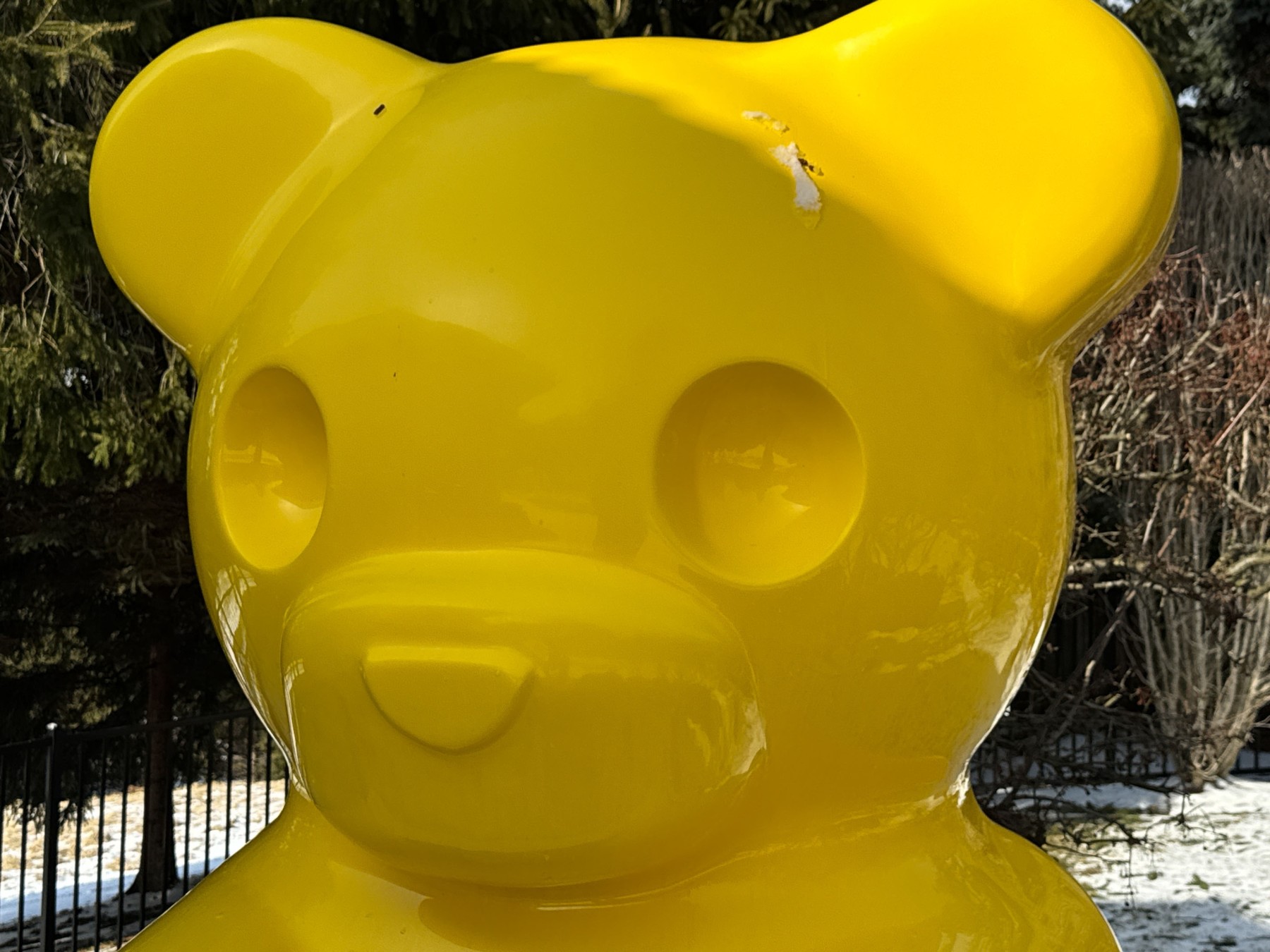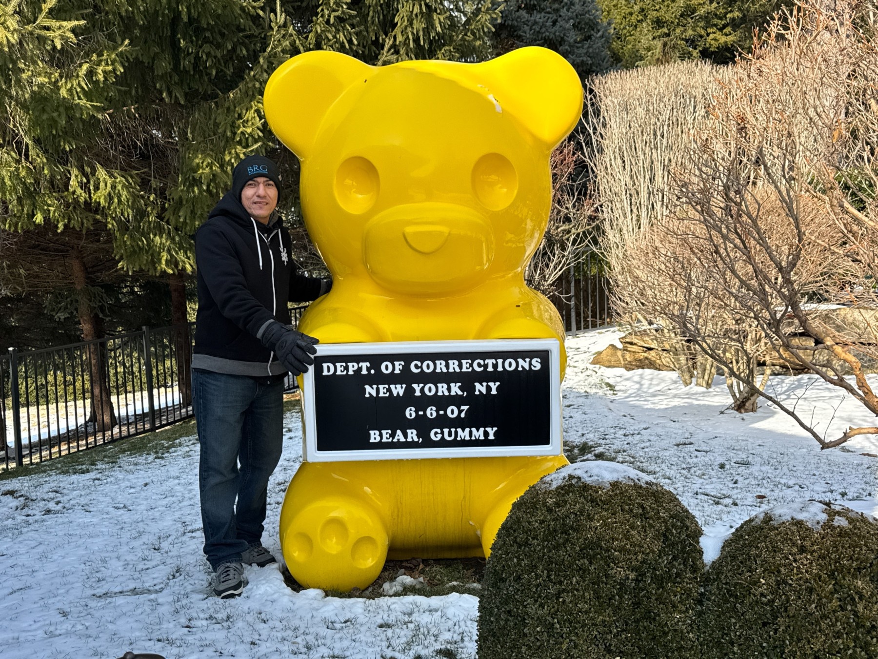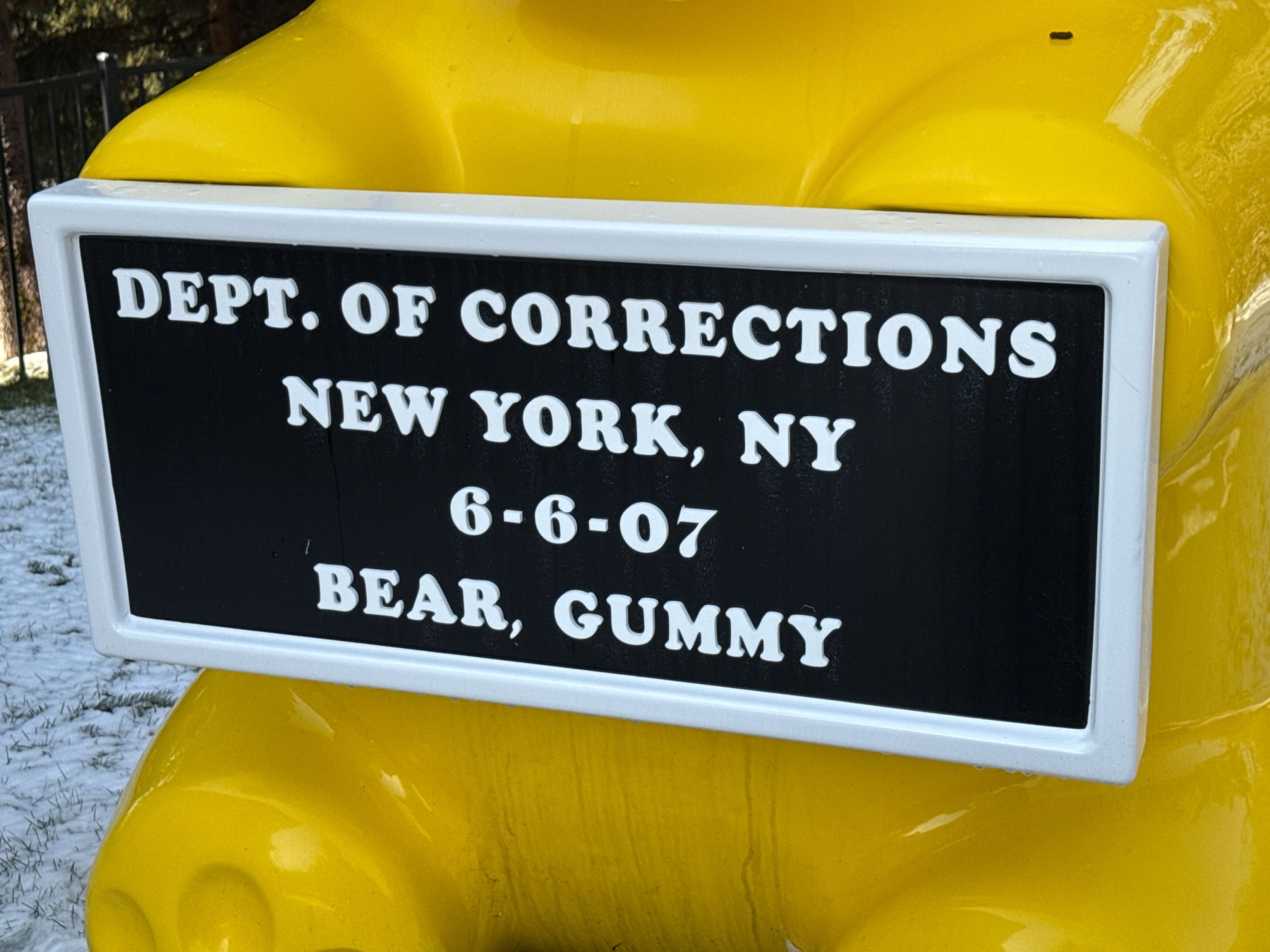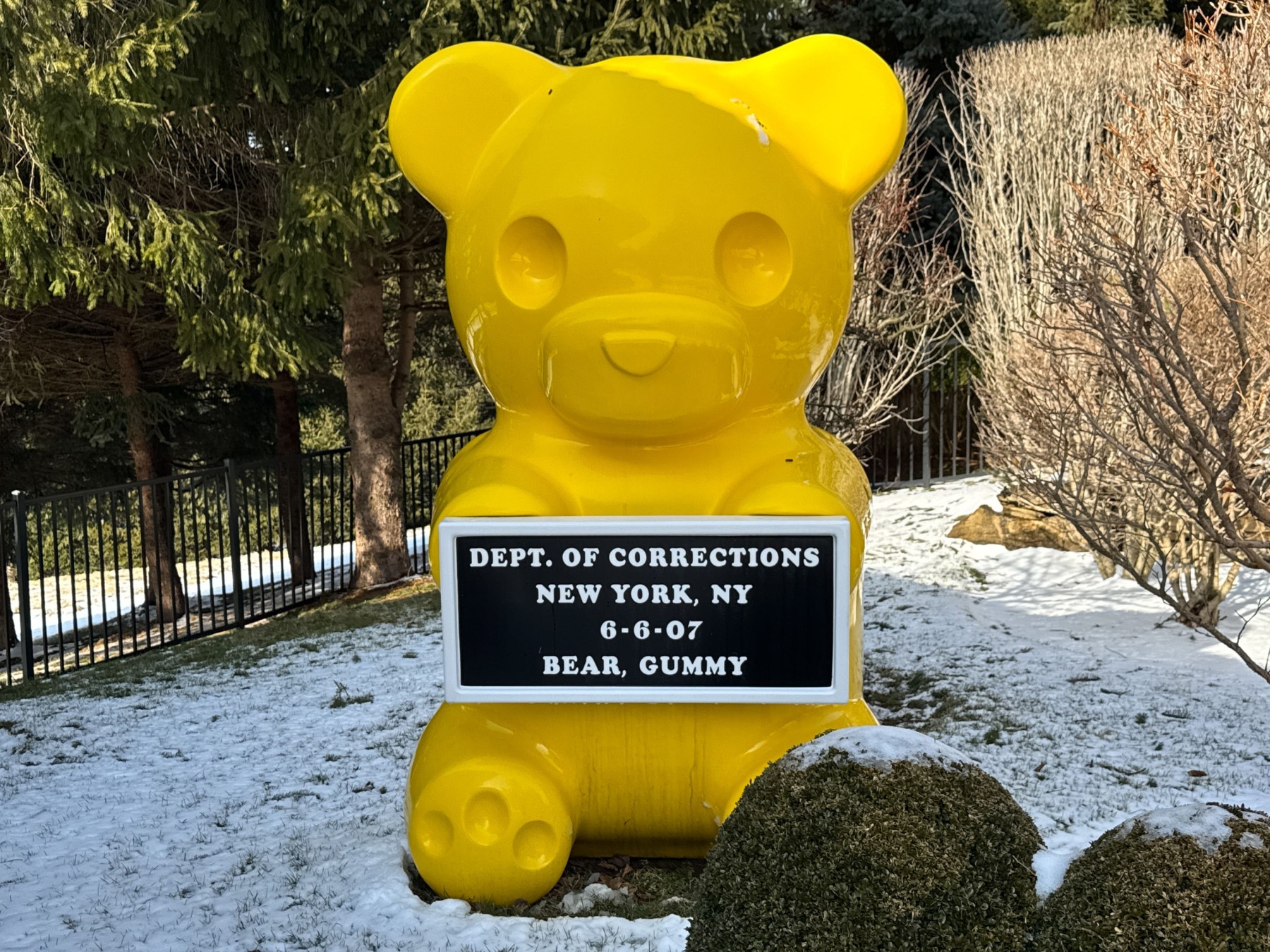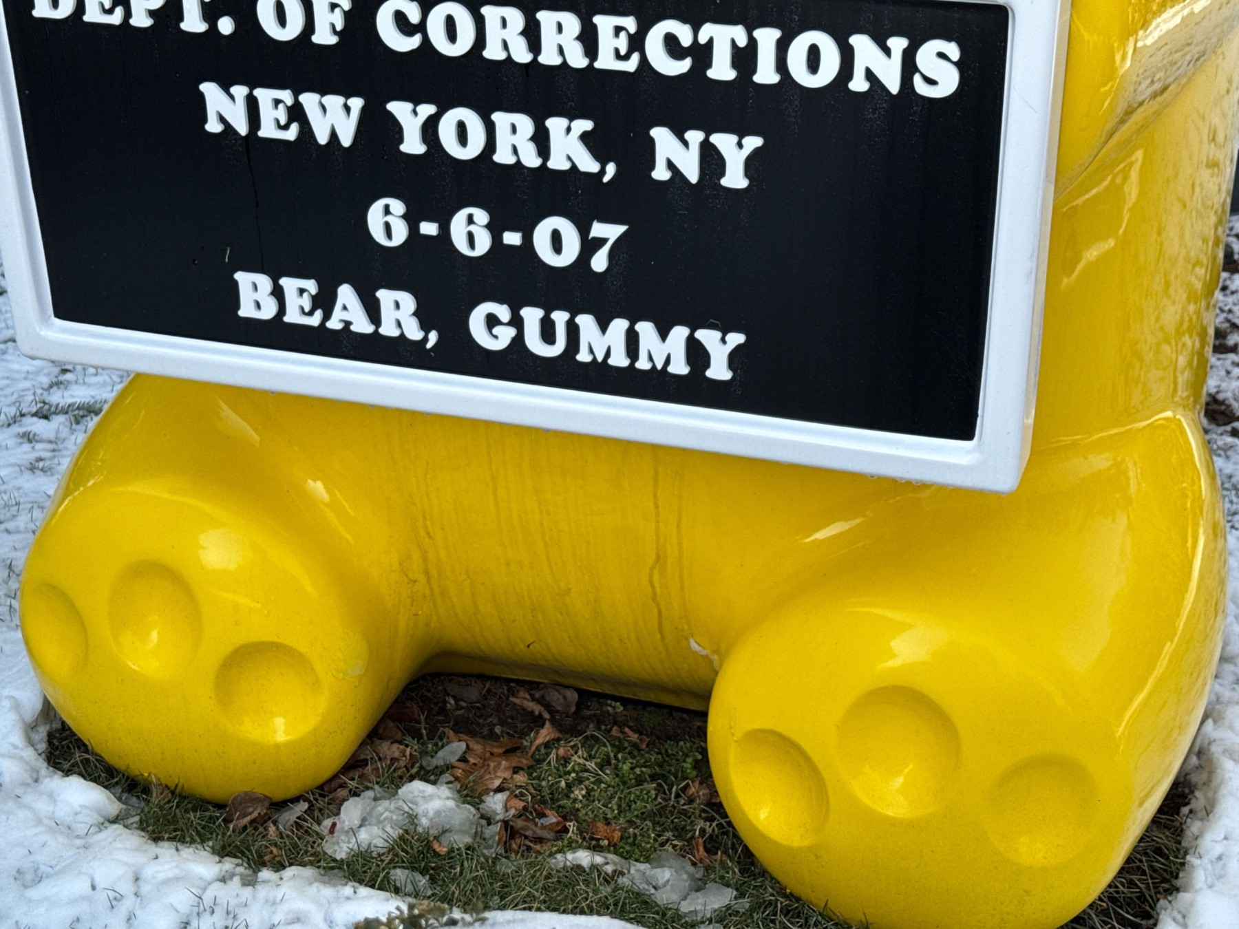 An eye-popping, whimsical sculpture by contemporary artist WhisBe.  The work is titled "Vandal Gummy" and is an oversized seven foot tall sculpture of a yellow gummy bear holding a mugshot placard reading "Dept. of Corrections New York, NY 6-6-07 Bear, Gummy." In bright yellow, the sculpture is fun and cheeky making a bold statement. We believe the piece to be fiberglass.
