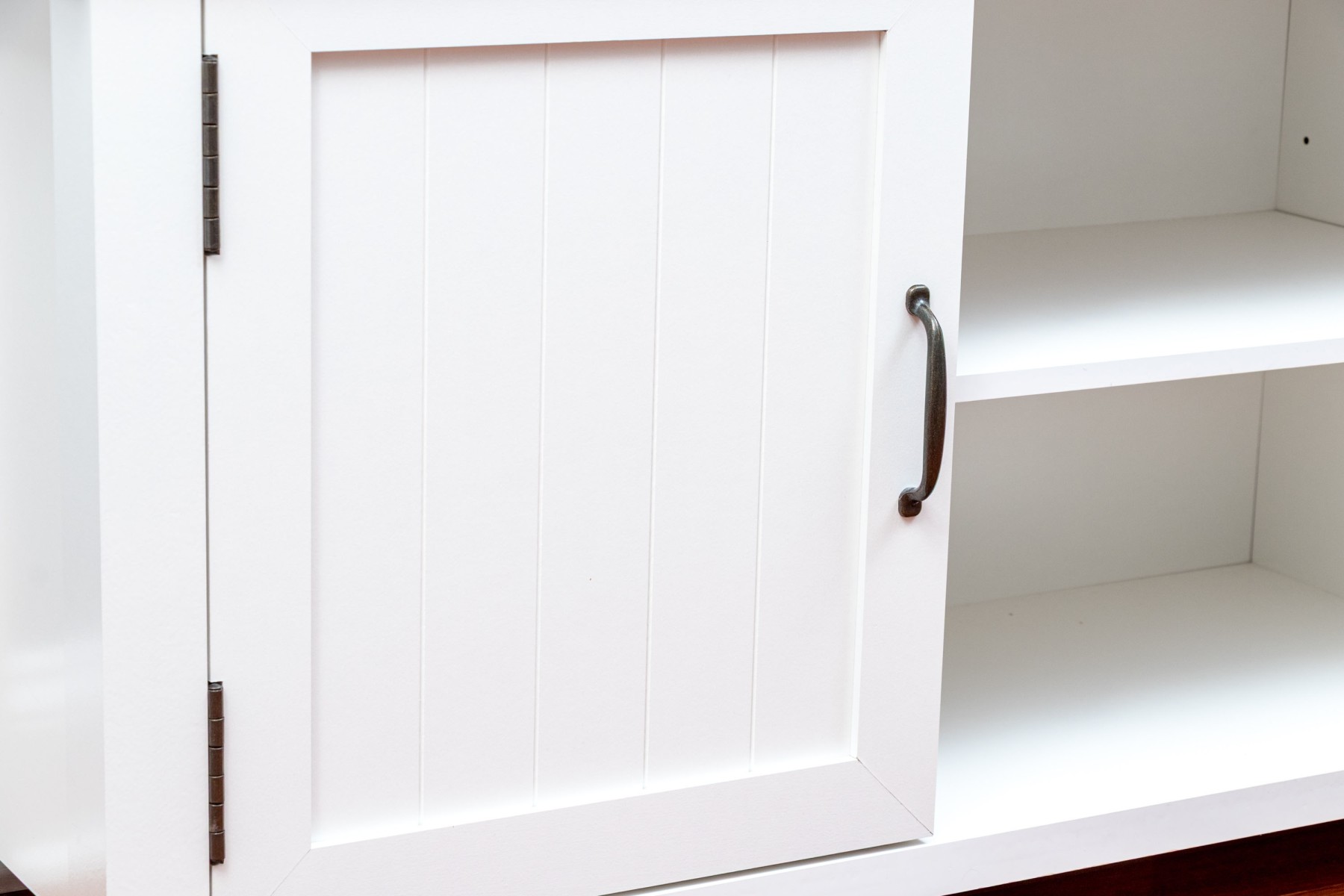 A delightful media console cabinet designed with a refreshing transitional style and a touch of modern farmhouse flair. The console is finished in clean white and sports a sleek rectangular top over a case of planked cabinet doors flanking a single shelf at the center.